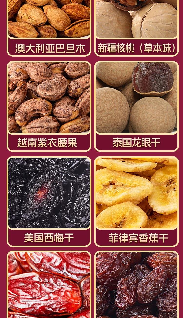 澳大利亚巴旦木100g 中国新疆核桃(草本味)200g 越南紫衣腰果100g 泰国龙眼干300g 美国西梅干280g 菲律宾香蕉干300g 沙特阿拉伯椰枣300g 智利提子干200g
