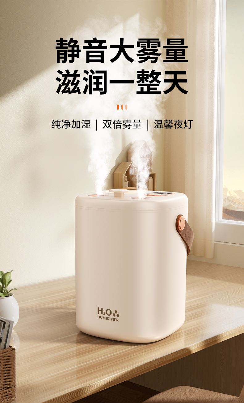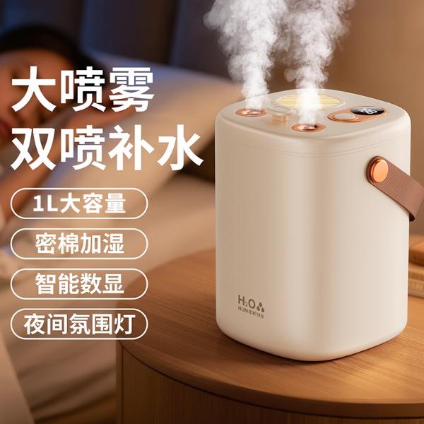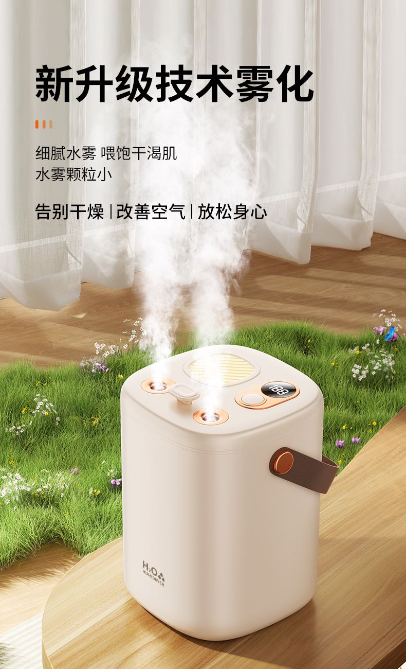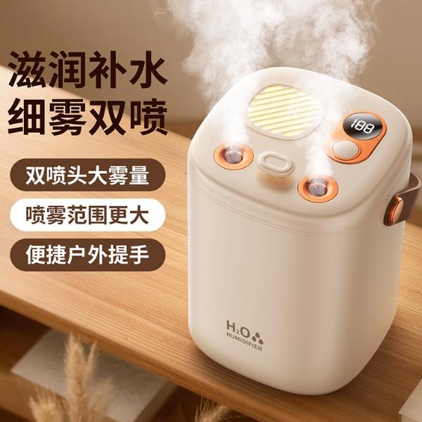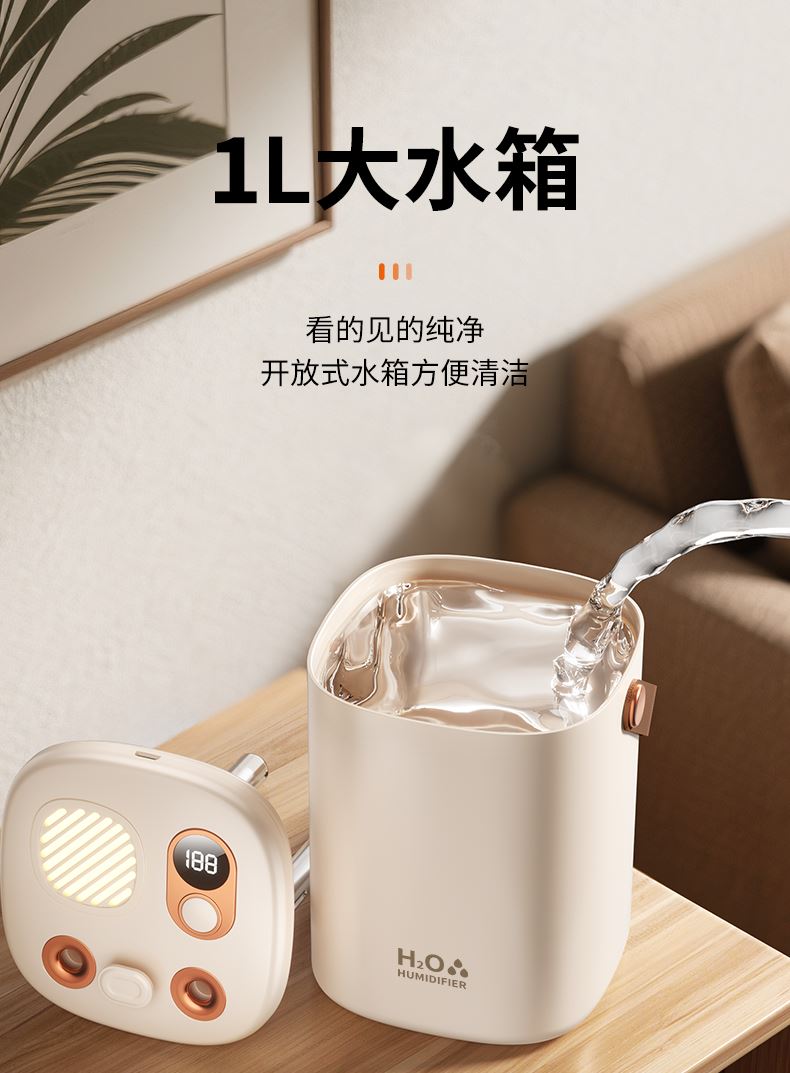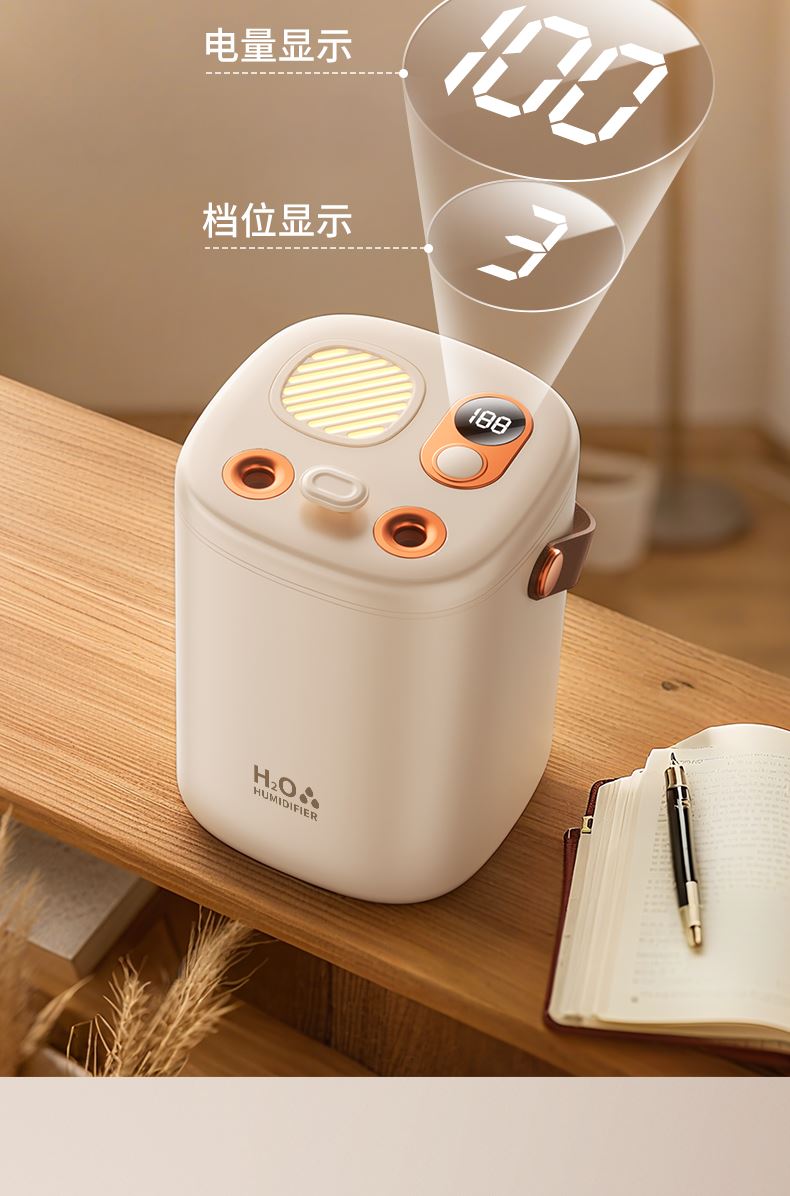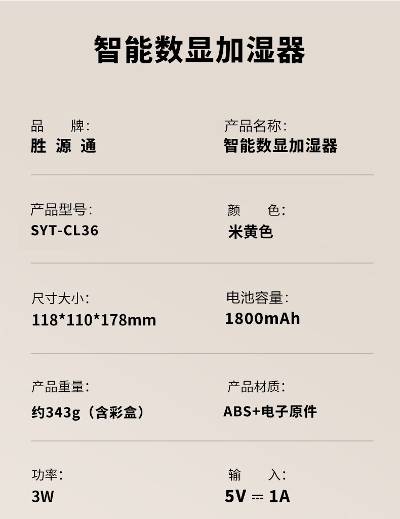 电池容量:1800毫安 颜 色: 米黄色 材 质:ABS+电子原件 水箱容量:1L 产品尺寸:118x110x178mn 滋润补水细雾双喷,节纳米级喷雾20小时长效喷雾,静音低至36DB,1L容量,自带1800mAh电池无需插电,氛围小夜灯智能LED数显,三档智能调,喷雾:3档,灯光:3档