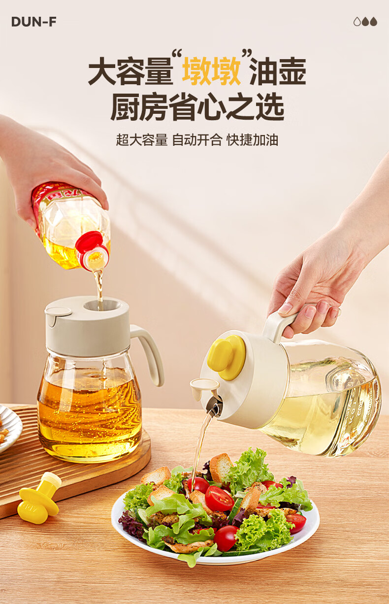 大容量墩墩油壶厨房省心之选 超大容量自动开合快捷加油 1000ml大容量,装满一次用整月 巨量装油,厨房续航无忧 一键拔塞秒添油轻松续油不脏手: 2种添油方式秒速补给不脏手 告别费力开盖单手拔塞 轻松开启 不锈钢壶嘴利落收油不挂油,倒完油自动回流直接流回瓶子里 耐高温 不变形防腐蚀,高强度食品级材质百味调料安心装,安全更耐用 采用加厚耐摔材质 70mm超宽瓶口清洗超轻松 大口径直冲无死角,手可直接伸入清洁