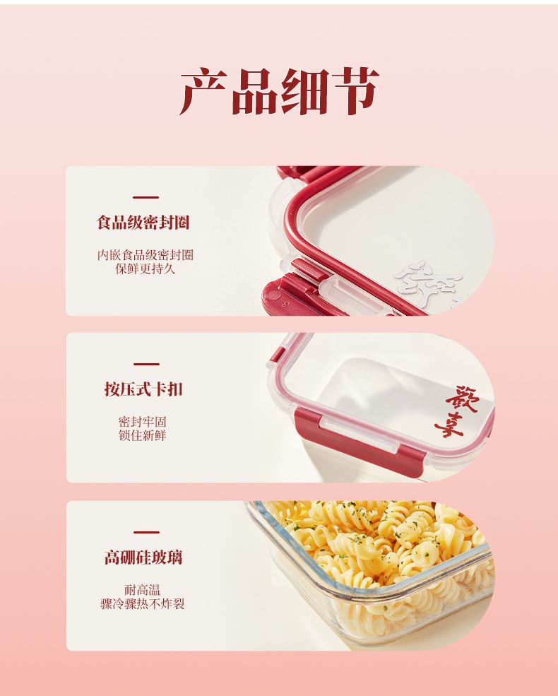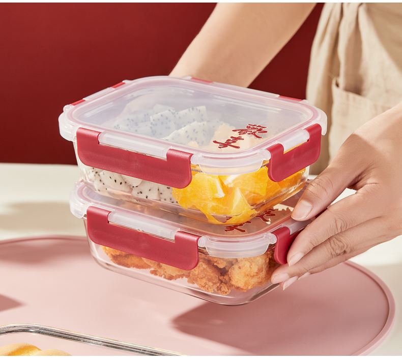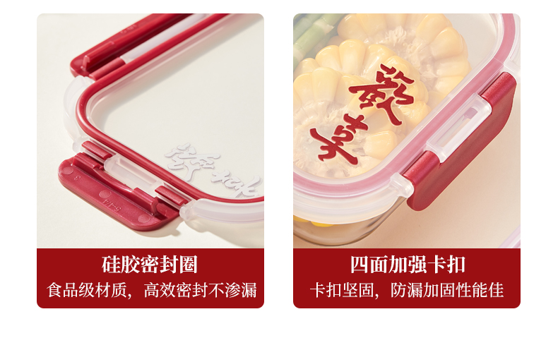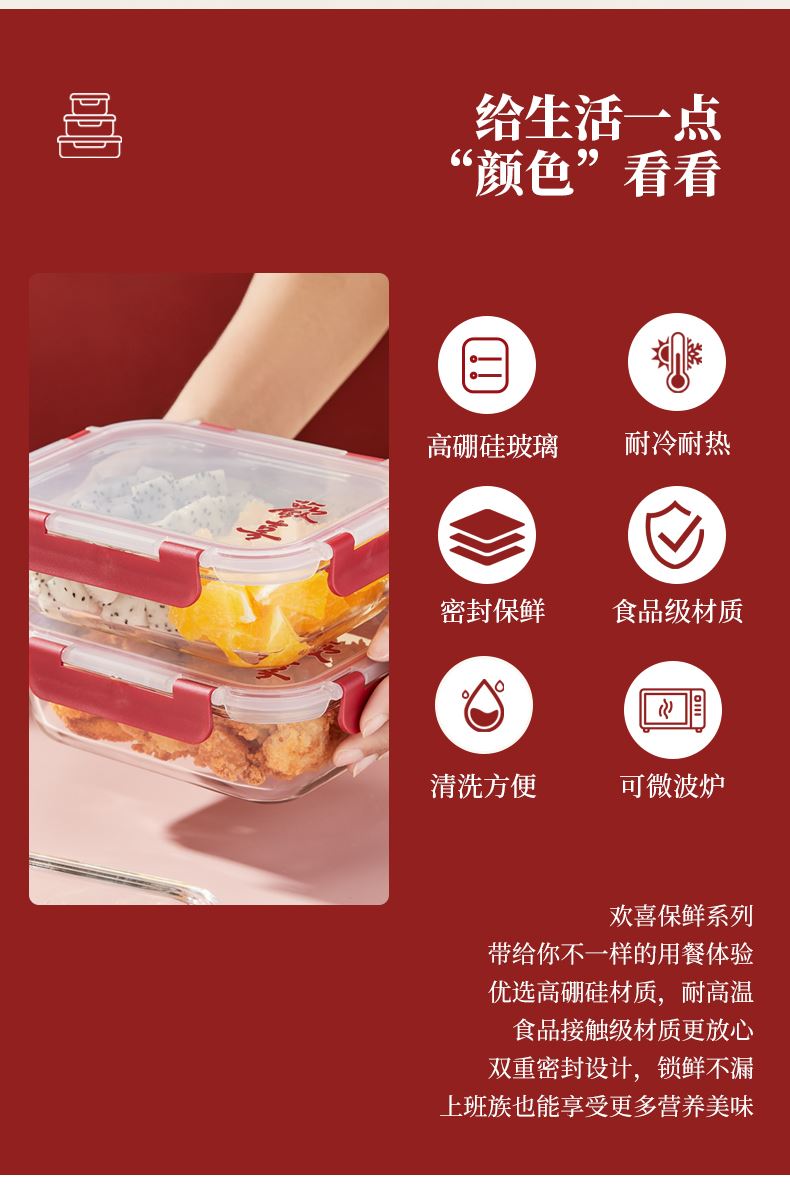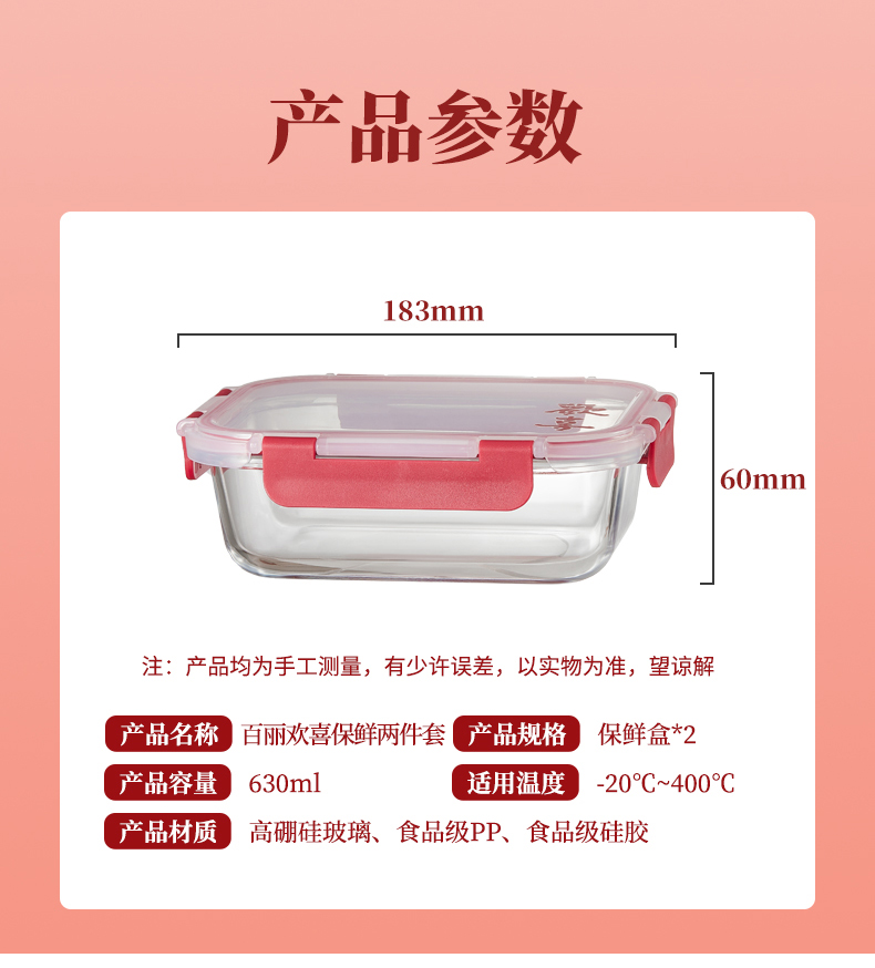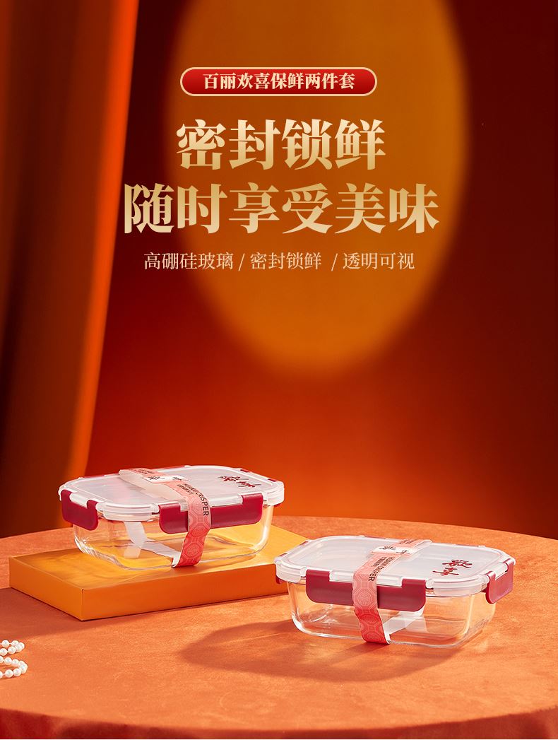 货 号:BL-BX/L2 适用温度:-20~400℃ 产品参数:中长保鲜盒630ml*2 材 质:高硼硅玻璃-20~400℃、食品级PP、食品级硅胶 彩盒尺寸:365*66*248mm 外箱尺寸:42*37.9*24.8cm 1、使用高硼硅耐热玻璃和食品级PP,安全无毒; 2、锁扣设计,透明视窗,密封防漏,有效保持食物的新鲜度; 3、适合微波炉、冰箱等多种用途,方便日常使用。 4、红色相间的外观设计,符合节日喜庆的氛围。
