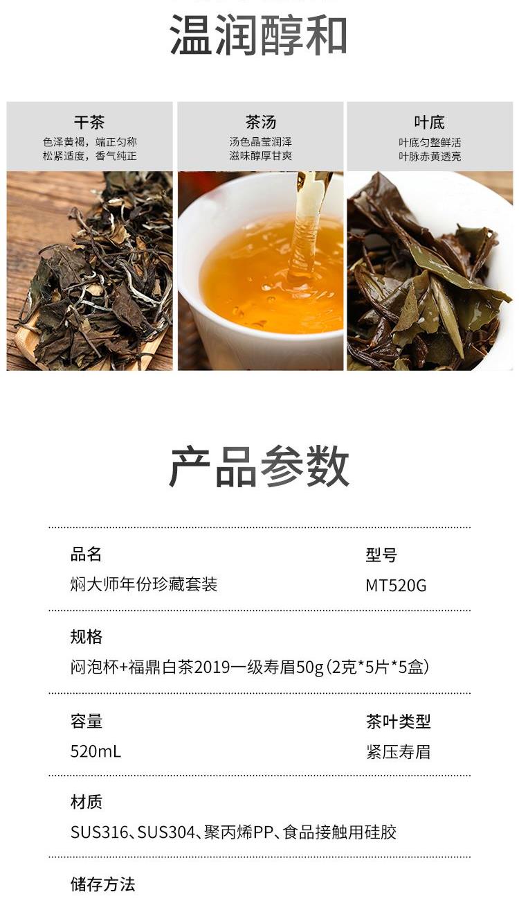 安全材质,健康守护 智能温显,随心掌控 一级寿眉,品质之选 闷泡随行,茶香随心 多用茶盅,茶趣盎然 外壳材质:奥氏体型不锈钢06Cr19Ni10(304) 内胆材质:奥氏体型不锈钢06Cr19Ni10(304) 茶隔材质:奥氏体型不锈钢06Cr17Ni12Mo2(316) 外 件:聚丙烯PP(食品接触用) 密 封 圈:食品接触用硅胶 保温效力:室温25℃条件下95℃满水测试24h≥41℃ 配 置:304不锈钢闷泡杯+316不锈钢茶隔+10G福鼎白茶*5 彩盒尺寸:180*100*280mm 装 箱 数:12只 茶叶参数: 产品:寿眉(紧压白茶) 产品类型:紧压寿眉 产品配料:2019年一级寿眉 净含量/规格:10g(2g"5袋)*5盒 贮存条件:密封、避光、防潮、防异味 产地:福建省宁德市福鼎市 生 产 商:福建省董德茶业有限公司