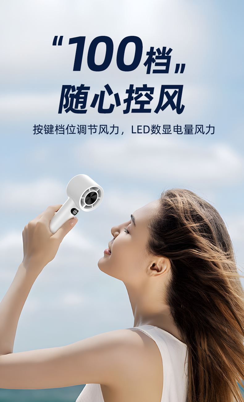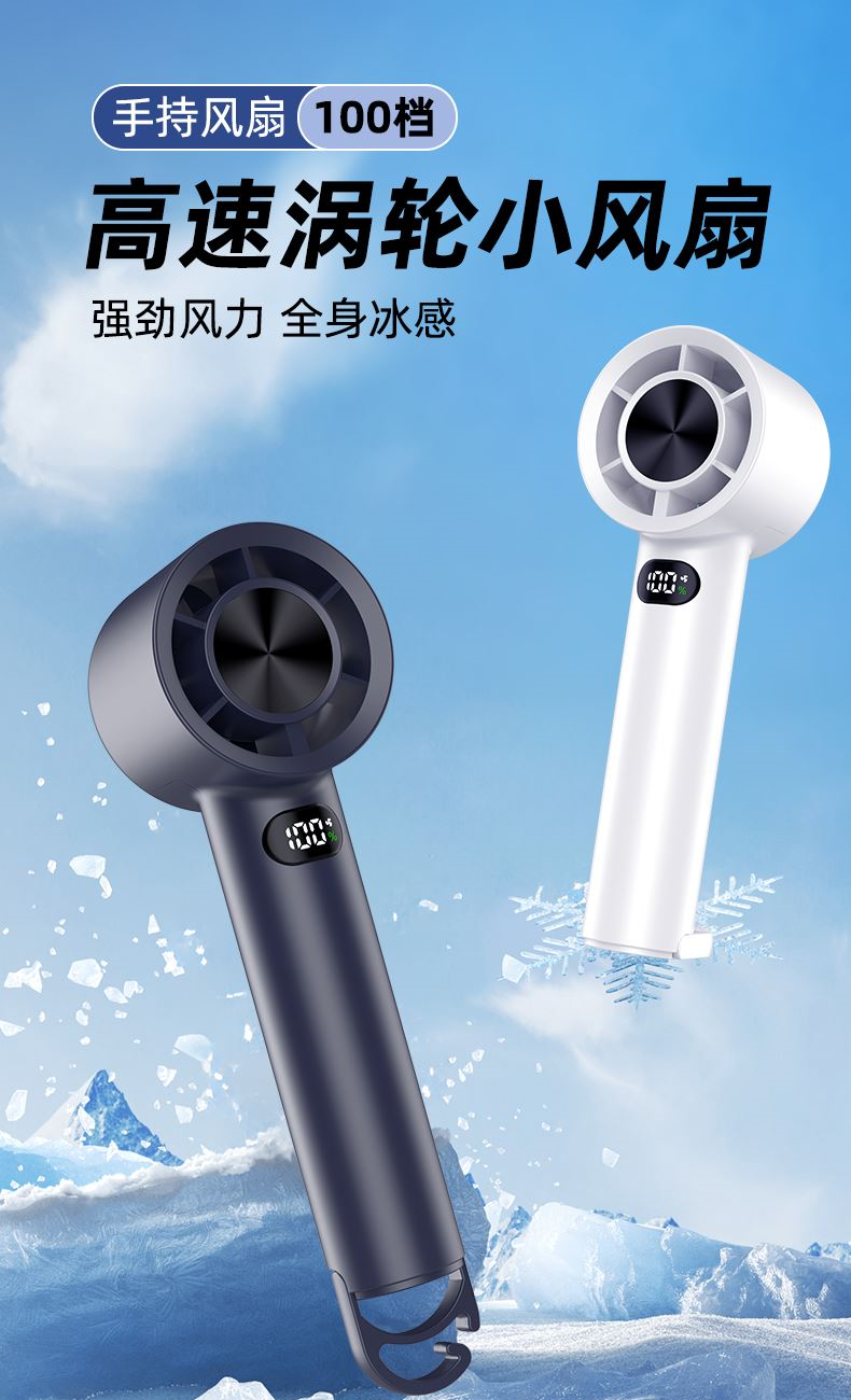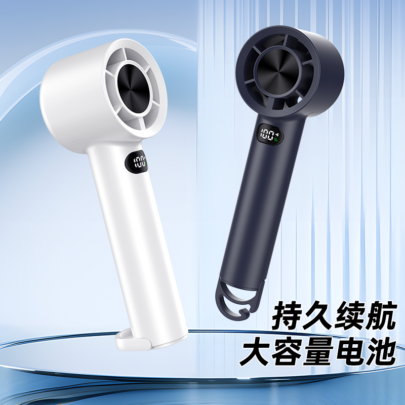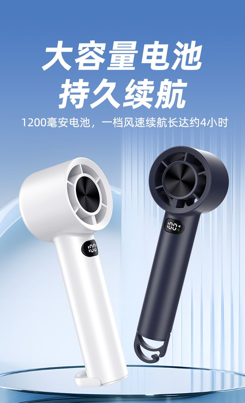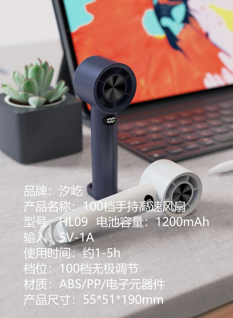 型号:HL09 电池容量:1200mAh 输入:5V-1A 使用时间:约1-5h 档位:100档无极调节 材质:ABS/PP/电子元器件 产品尺寸:55*51*190mm 产品重量:约133g 产品颜色:白色、蓝色,黑色,绿色,粉色 产品包装尺寸:57*53*170mm(彩盒) 产品卖点:100档风力随心调节,无刷电机大风力,智能数显,超长续航多场景使用,自带挂钩可户外可桌面。