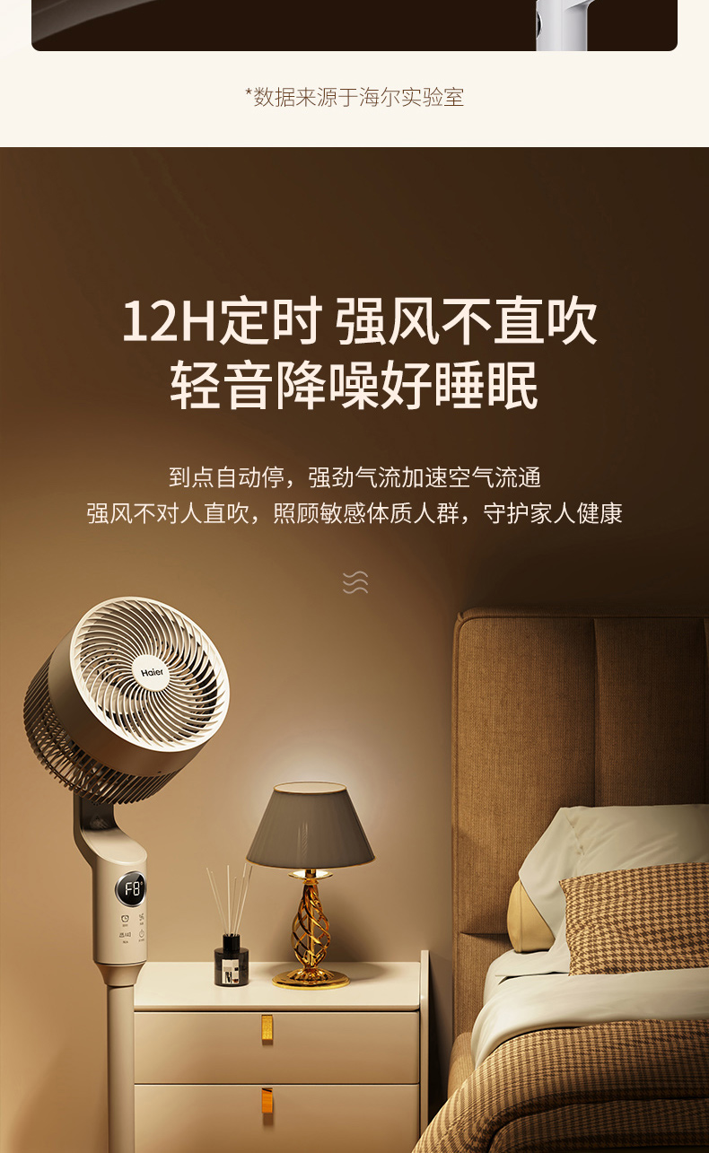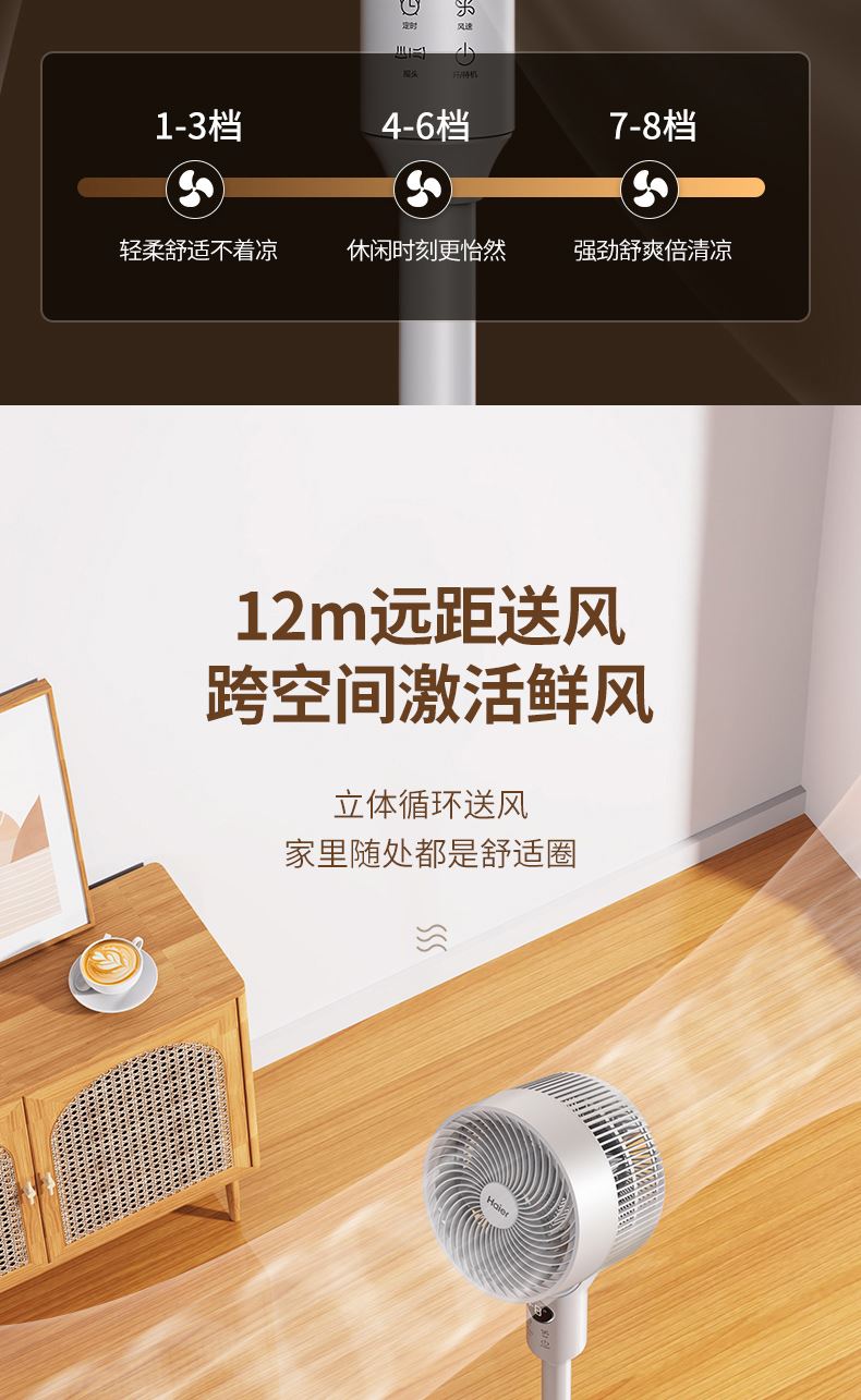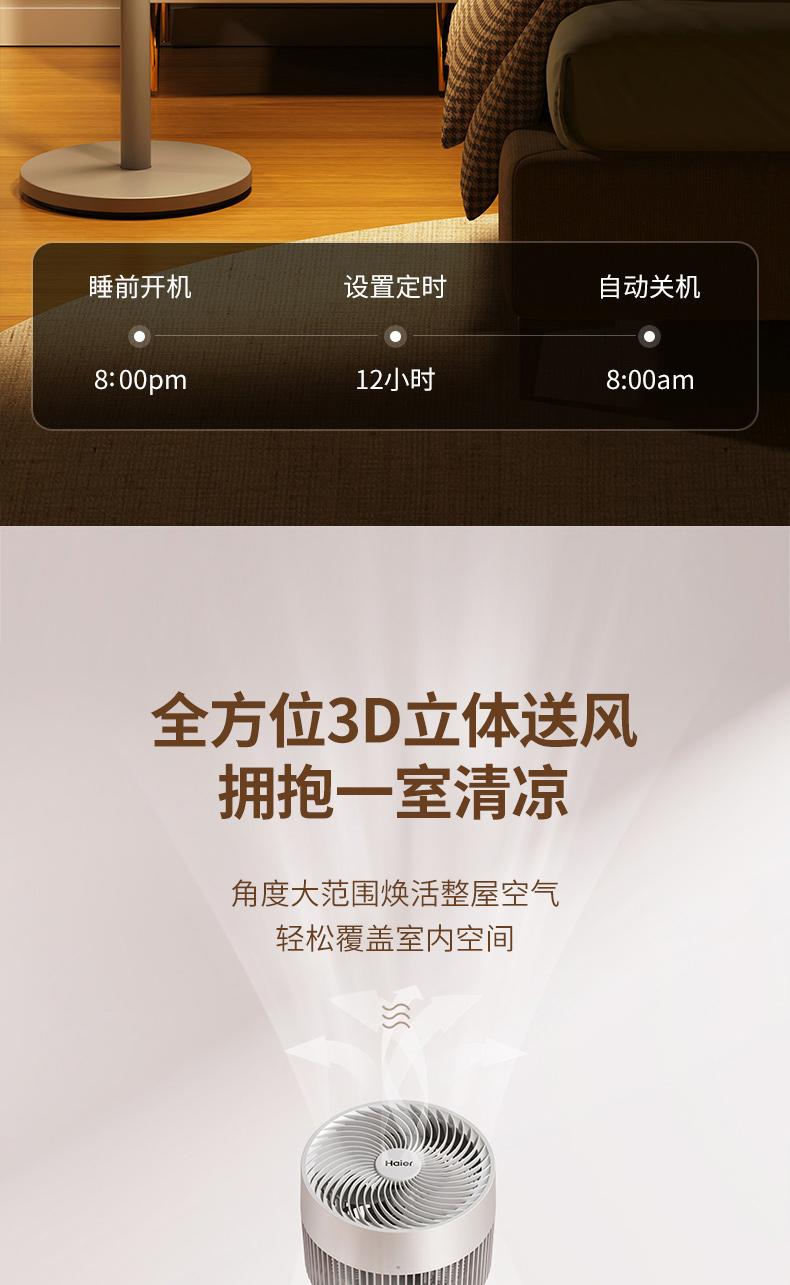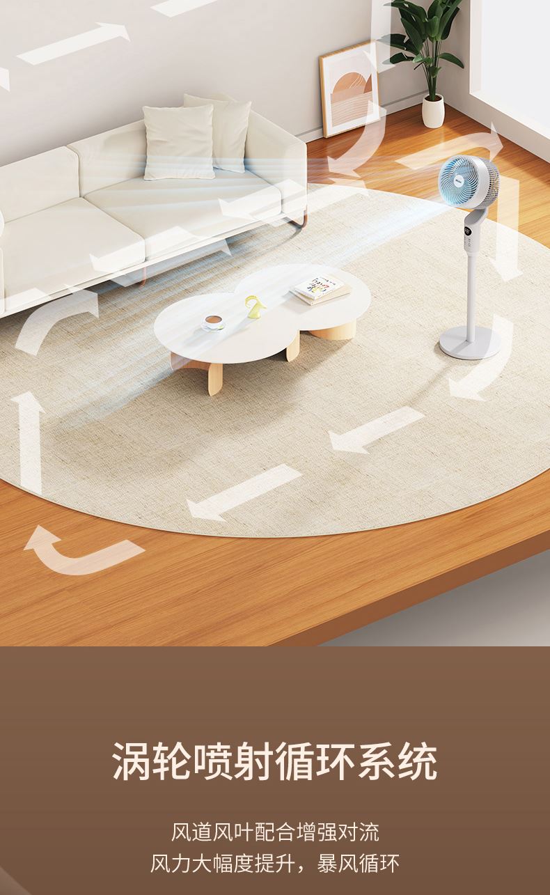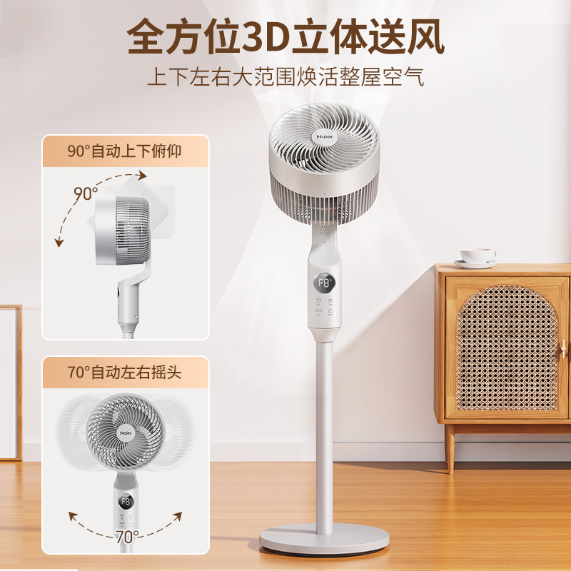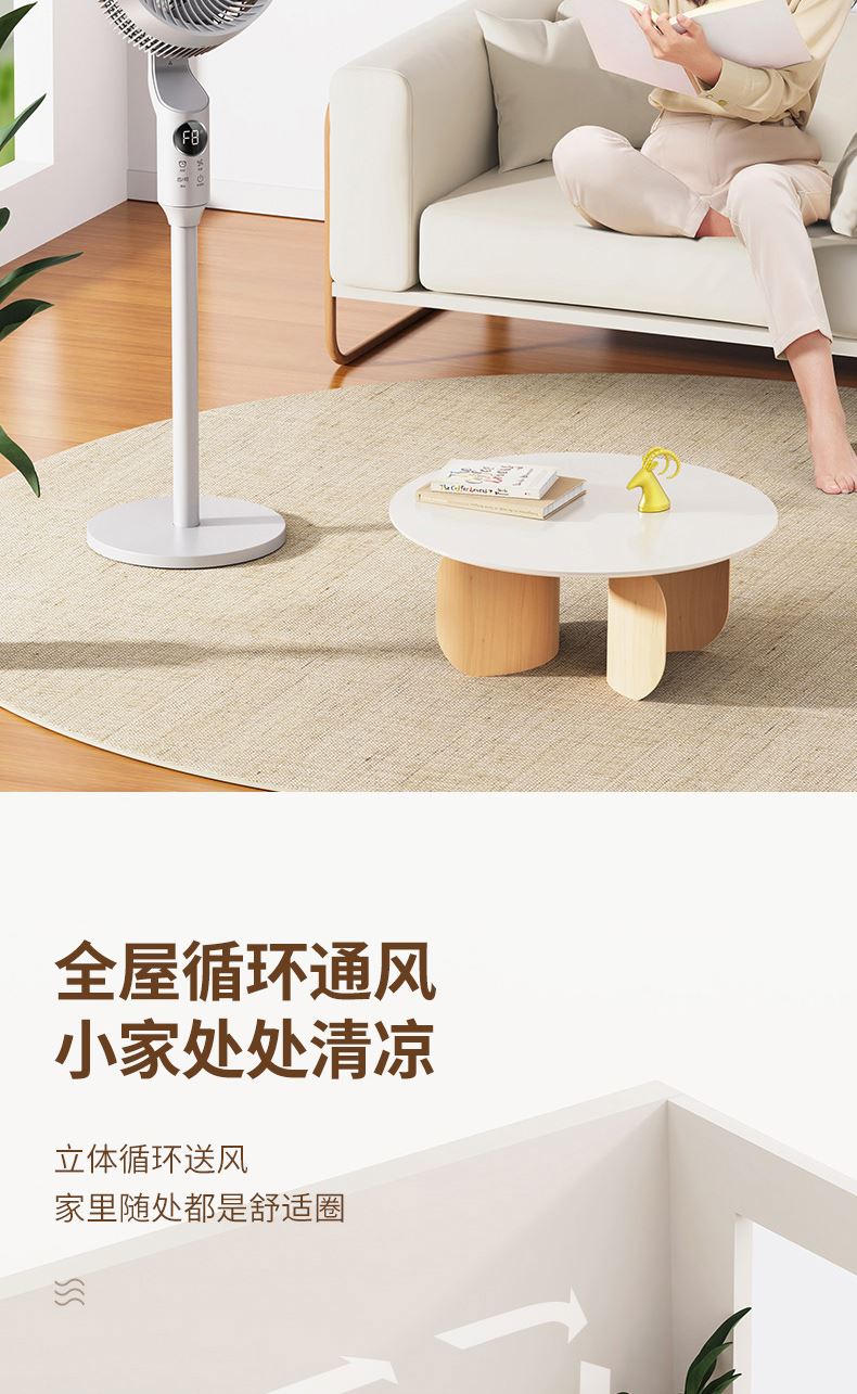 3D 立体循环送风:上下左右自动摇头,涡轮风道,12 米远距送风,快速全屋对流换气。 轻音低噪:运行安静(约 50dB),不扰睡眠,舒适柔风不直吹。 多档风速 + 定时:3/8 档风速(按版本), 12 小时定时,适配不同场景需求。 台地两用:可升降、可拆杆,落地 / 台式自由切换,客厅卧室书房通用。 节能安全:40W 低功率省电,过热保护,ABS 机身稳固耐用。