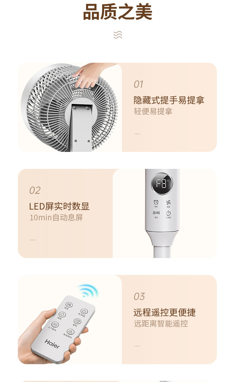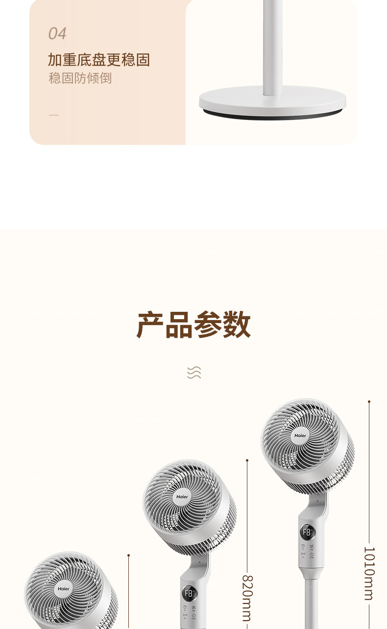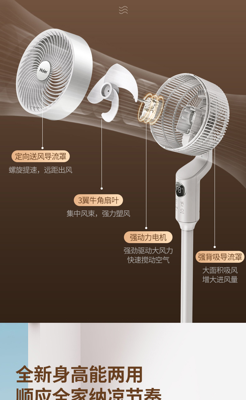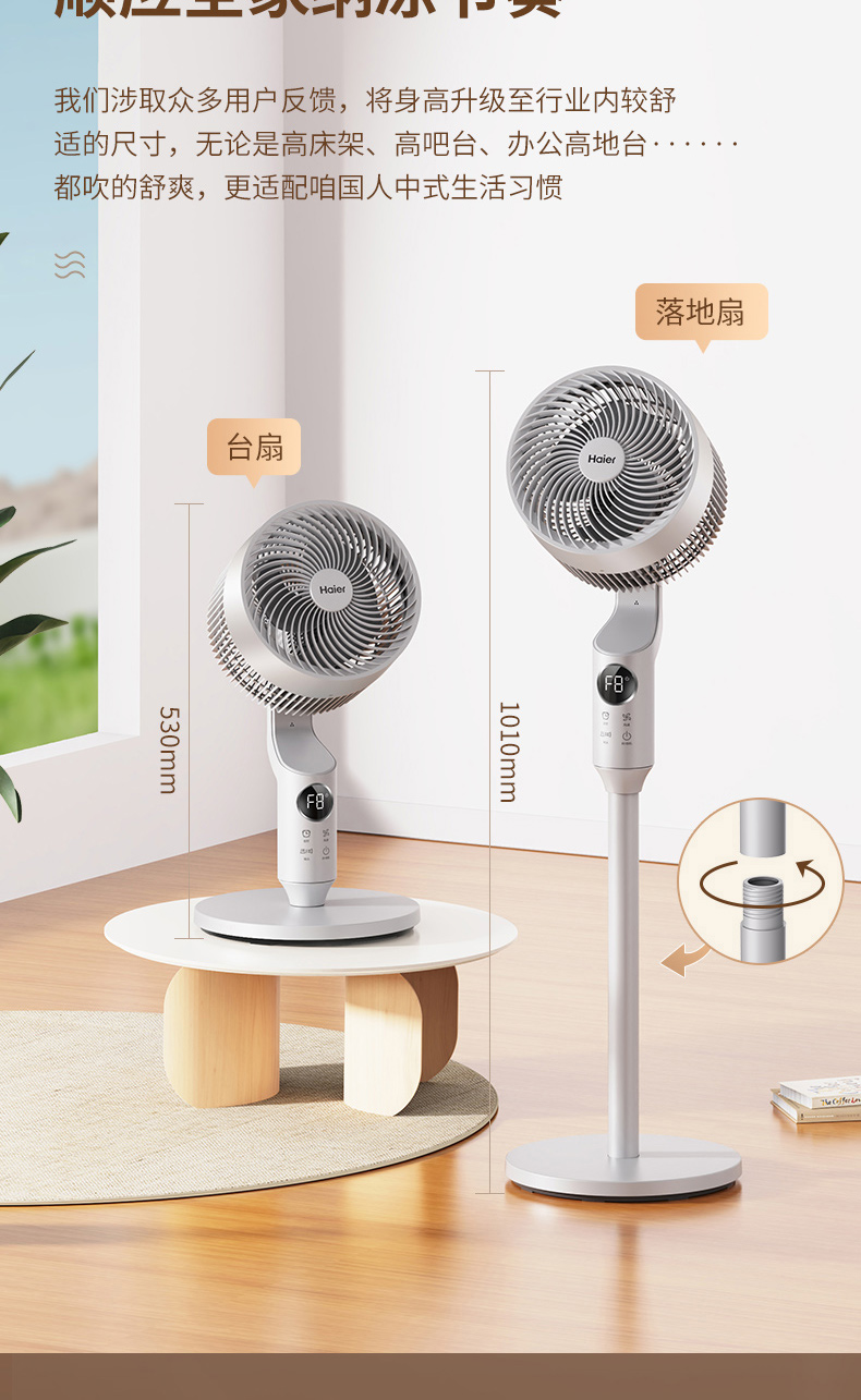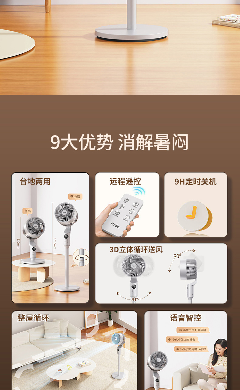 3D 立体循环送风:上下左右自动摇头,涡轮风道,12 米远距送风,快速全屋对流换气。 轻音低噪:运行安静(约 50dB),不扰睡眠,舒适柔风不直吹。 多档风速 + 定时:3/8 档风速(按版本), 12 小时定时,适配不同场景需求。 台地两用:可升降、可拆杆,落地 / 台式自由切换,客厅卧室书房通用。 节能安全:40W 低功率省电,过热保护,ABS 机身稳固耐用。