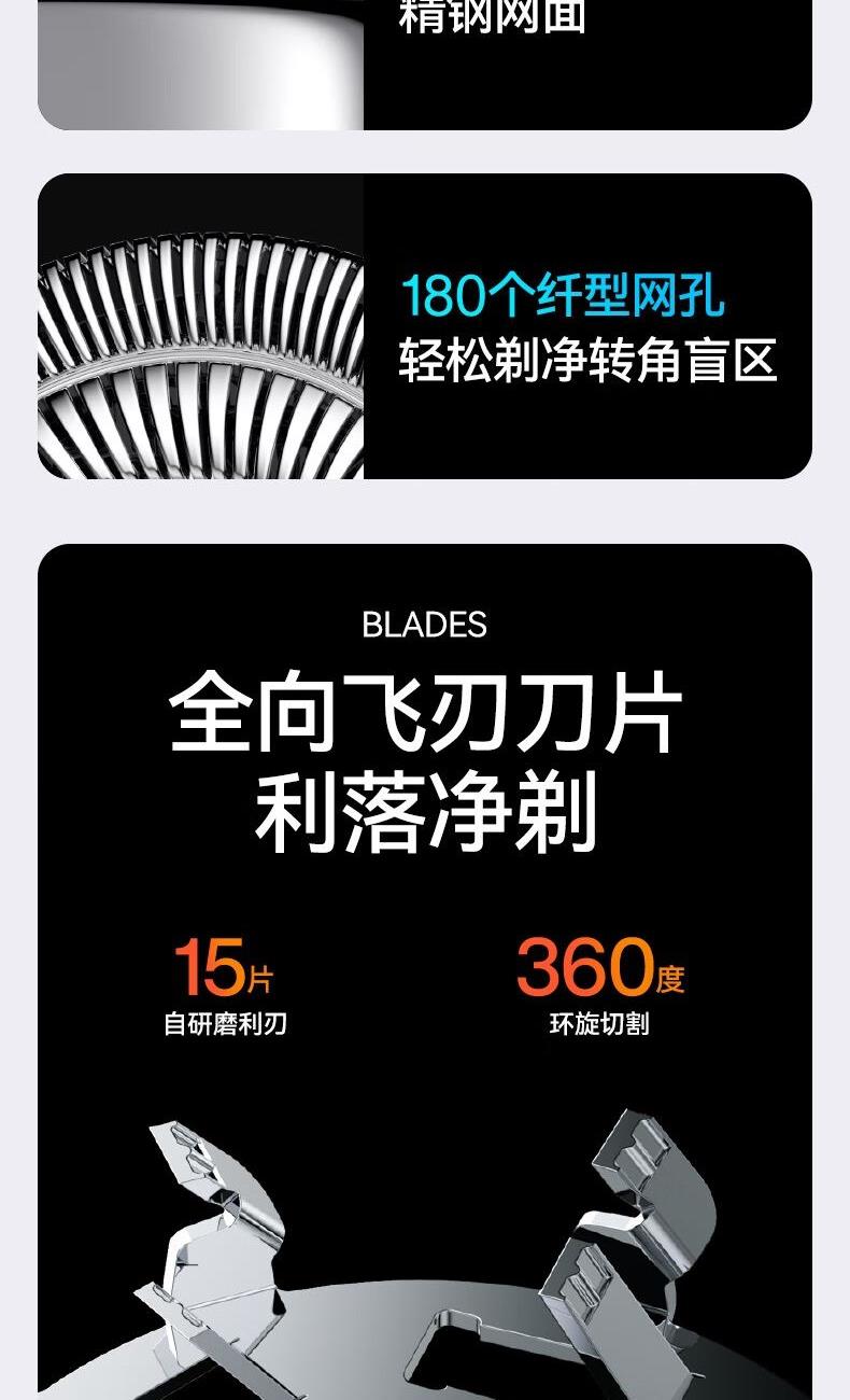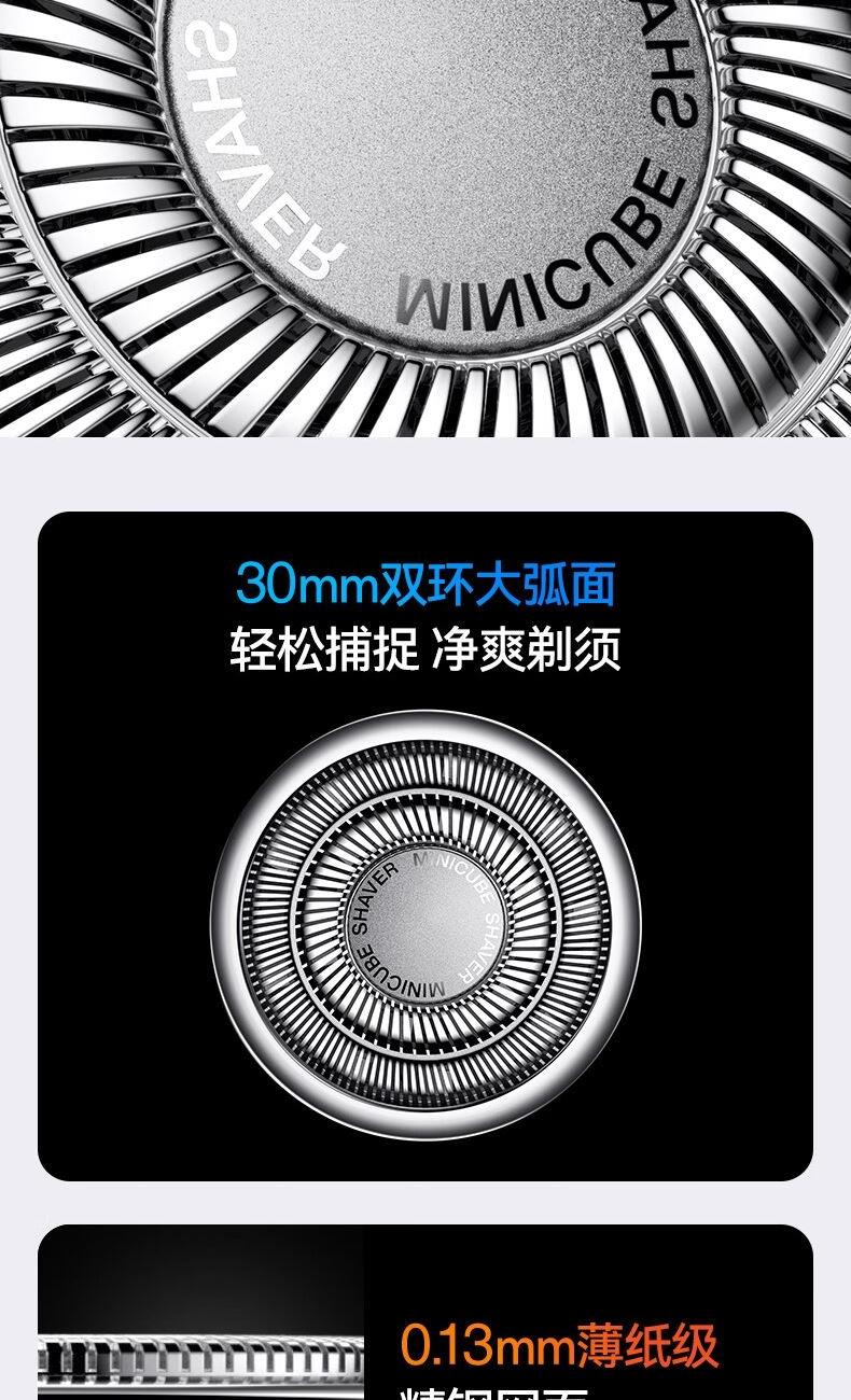机身材质:PC+ABS 刀网类型:单环弧面刀网 电池容量:360毫安 电池材质:集成式双电芯锂电池 电机材料:精细强磁悬浮电机,6800转/分 充电接口:Tpye-C 续航时间:50分钟 充电时长:1小时 防水等级:ipx7级别 刀片材质:航空级马氏体不锈钢 刀片工艺:动刀工艺 刀头设计:磁吸式耐高温 特殊技术:三种转速调校设计