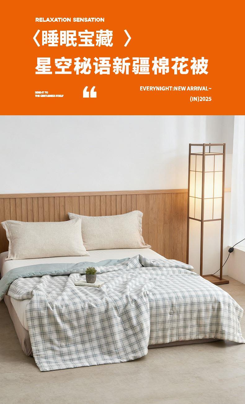 规格:200*230cm 面料:全棉 填充:棉花 克重:1500g 执行标准:GB/T22796-2021 安全类别:GB18401-2010 B类 1.采用优质纯棉面料,斜纹织造,水洗处理,手感柔糯,吸湿透气,贴身更舒适贴; 2.填充物选用优质A类整张羽丝棉纤维手感犹如羽绒般,轻盈蓬松,柔软舒适 3.采用单边暗合缝制,定点绗缝工艺,日式简约设计风格,简约时尚,让您感受科技生态睡眠!