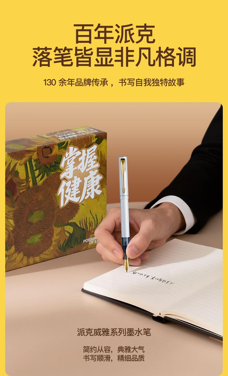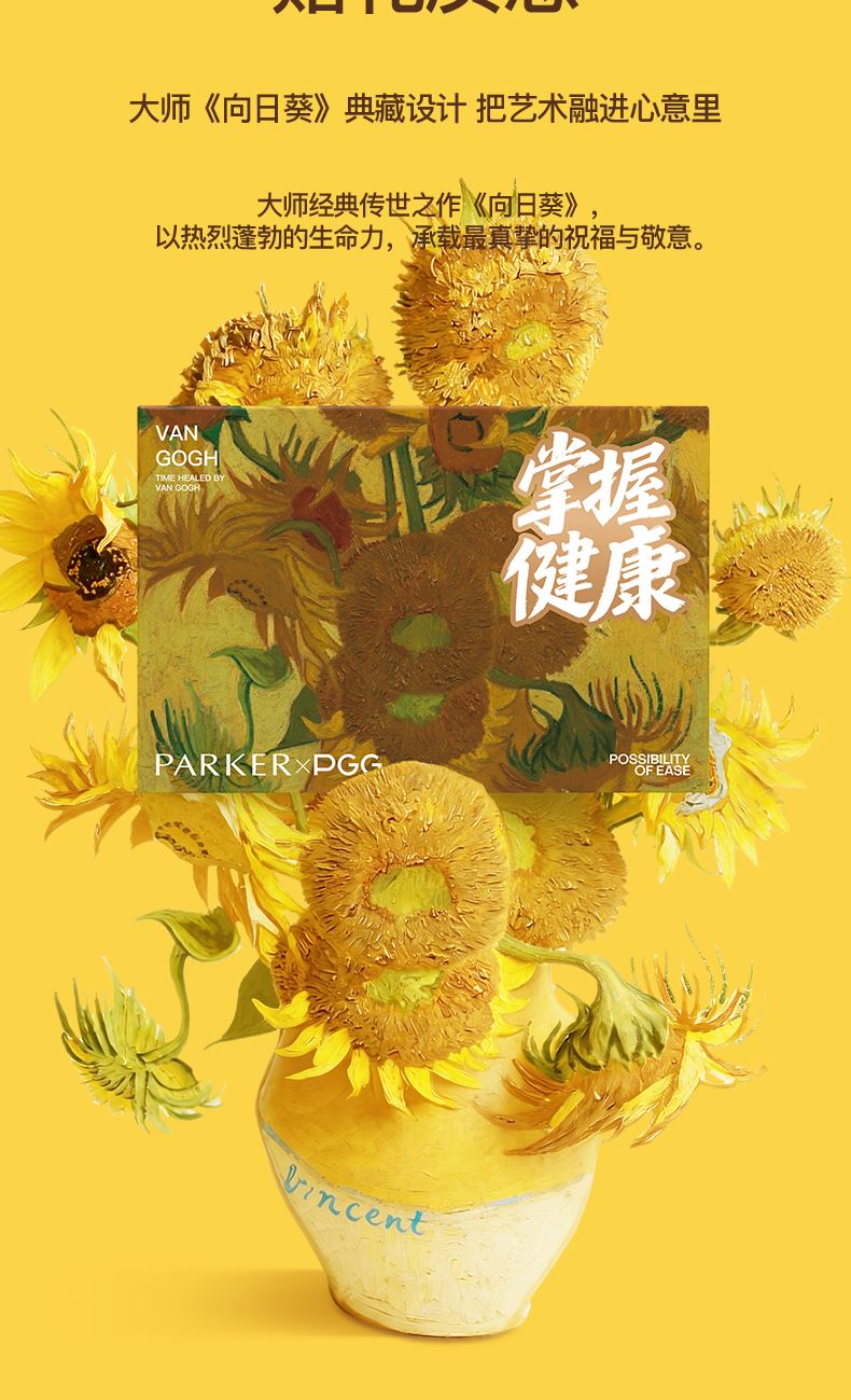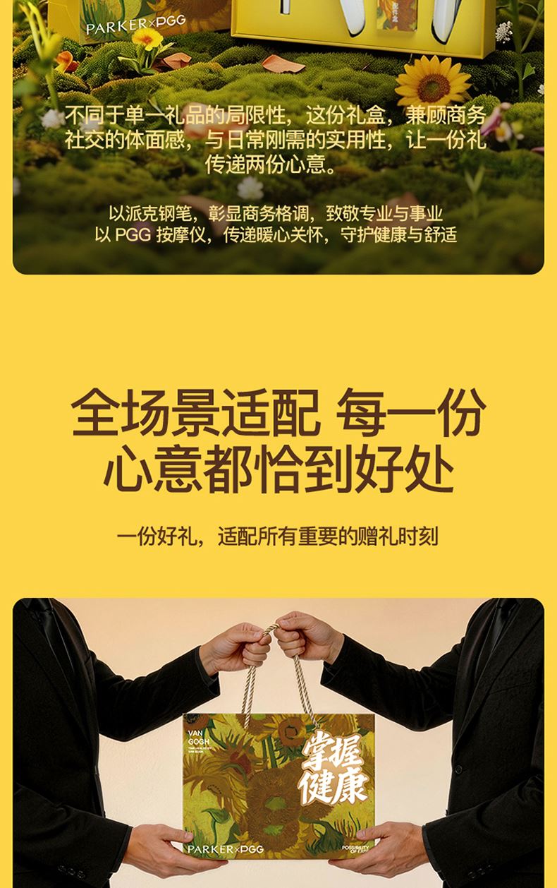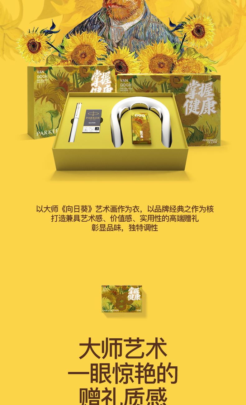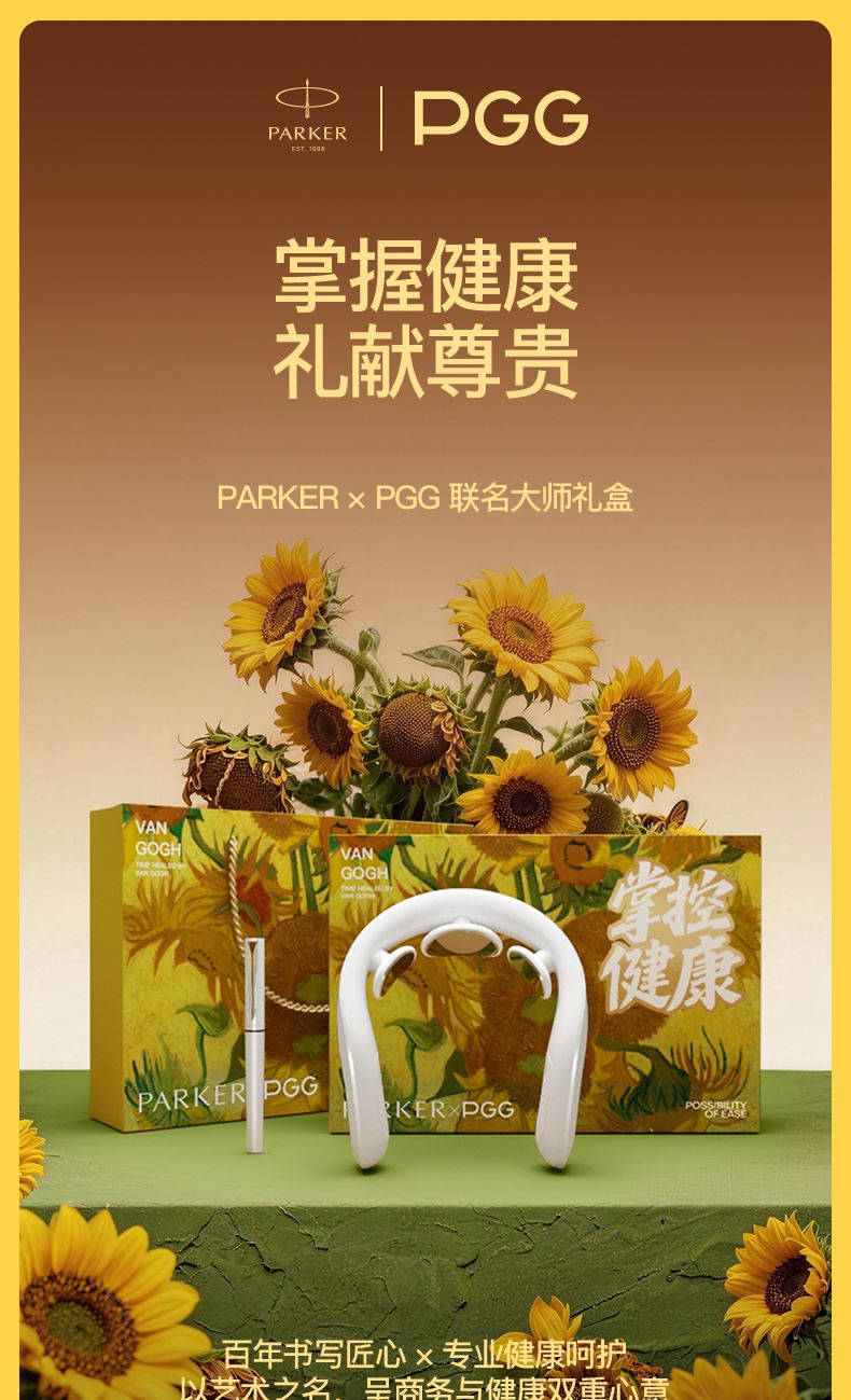 商务赠礼,选的是体面,送的是心意。 派克 ×PGG 梵高联名礼盒,以百年底蕴,以暖心健康呵护,以大师艺术质感,让每一份祝福,都掷地有声,被长久铭记。 底部 slogan:掌握健康,落笔生辉,礼赠优选