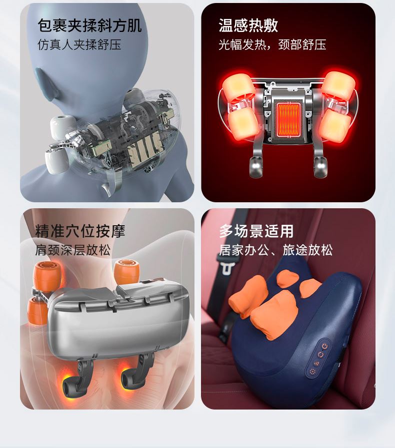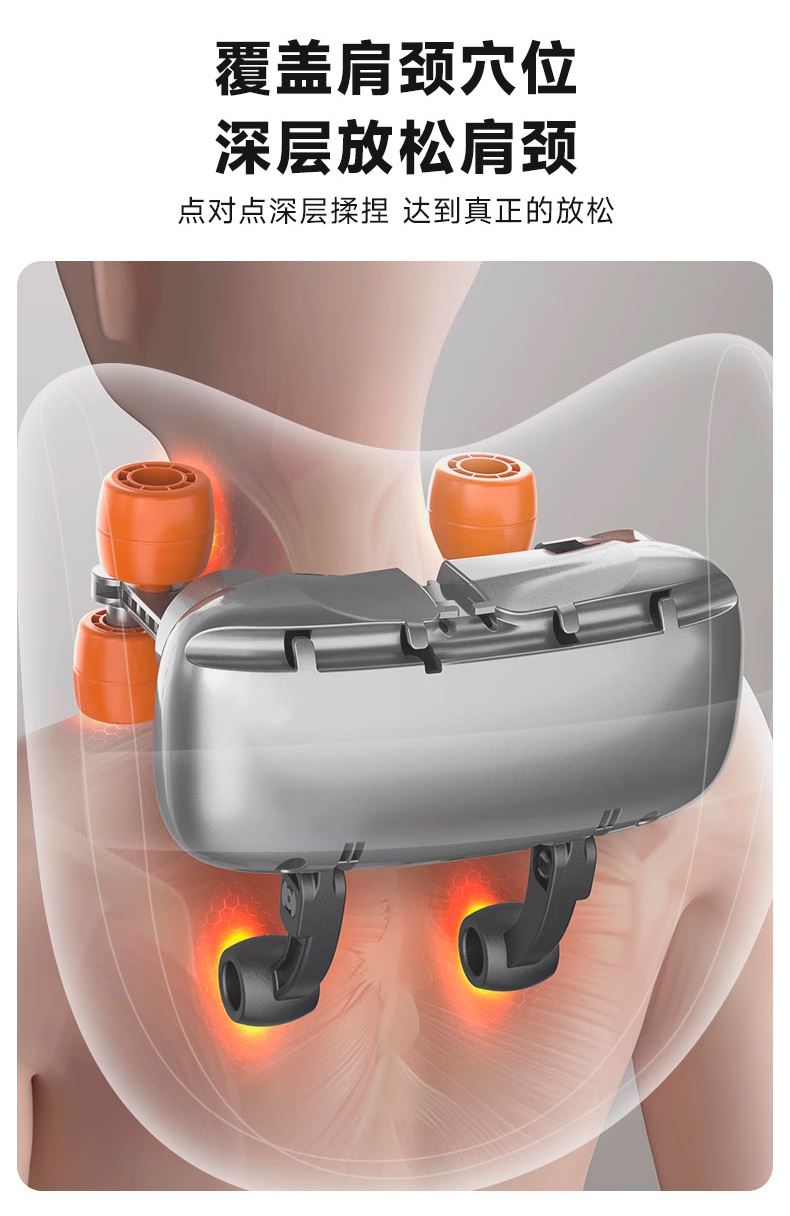 额定输入:DC5V 额定功率:10W 电池容量:2000mAh 产品净重:1.51kg 产品颜色:深蓝 你的专属按摩师,按摩斜方肌 加宽加大按摩手,仿人手揉捏 不只揉捏肩颈,按摩腰背同样给力 大面积热敷,边按边加热,筋骨更放松