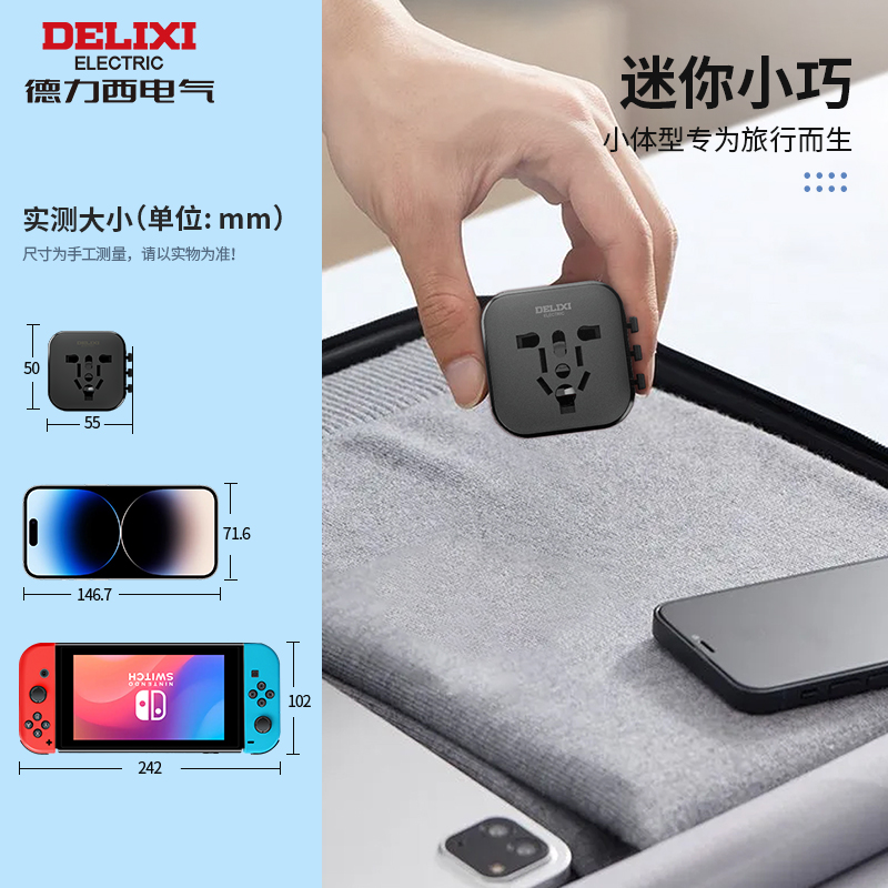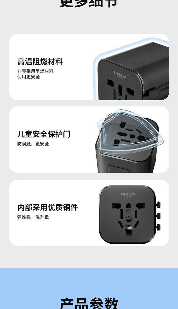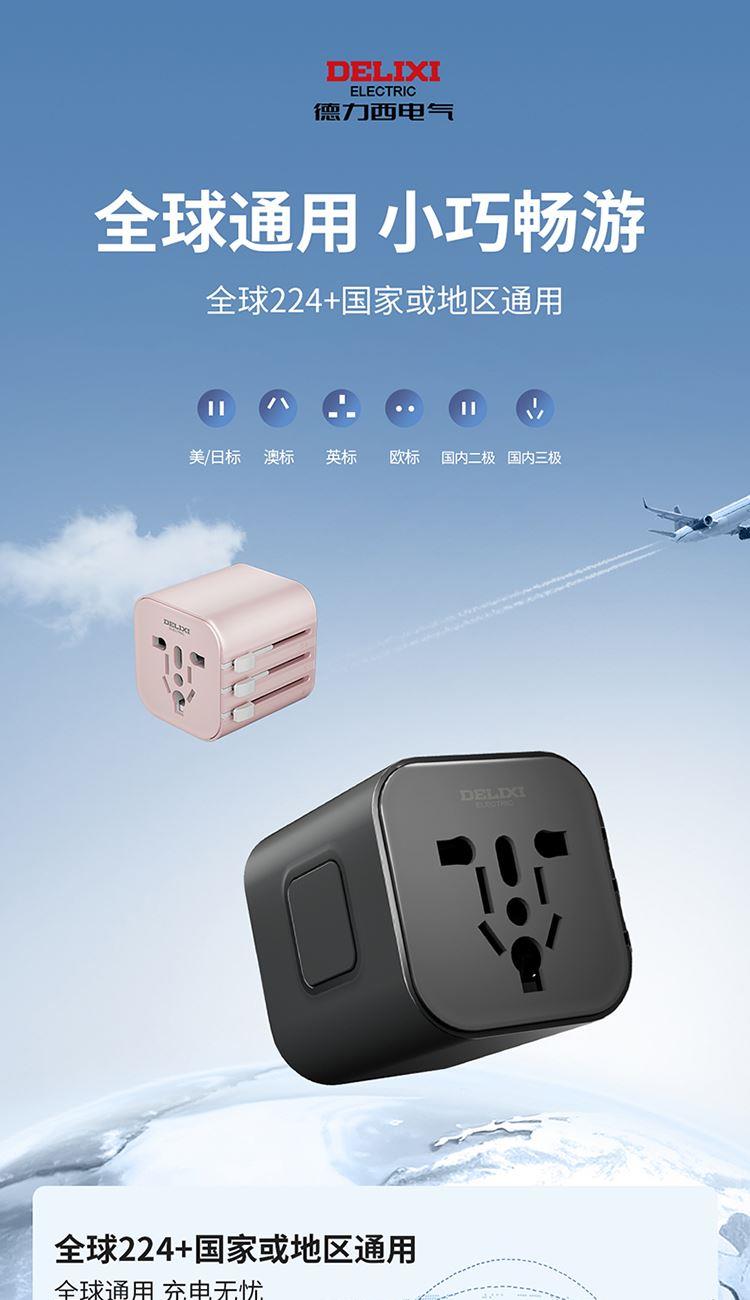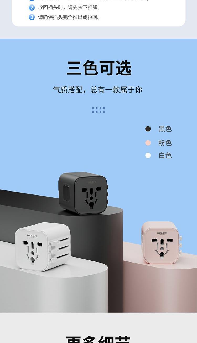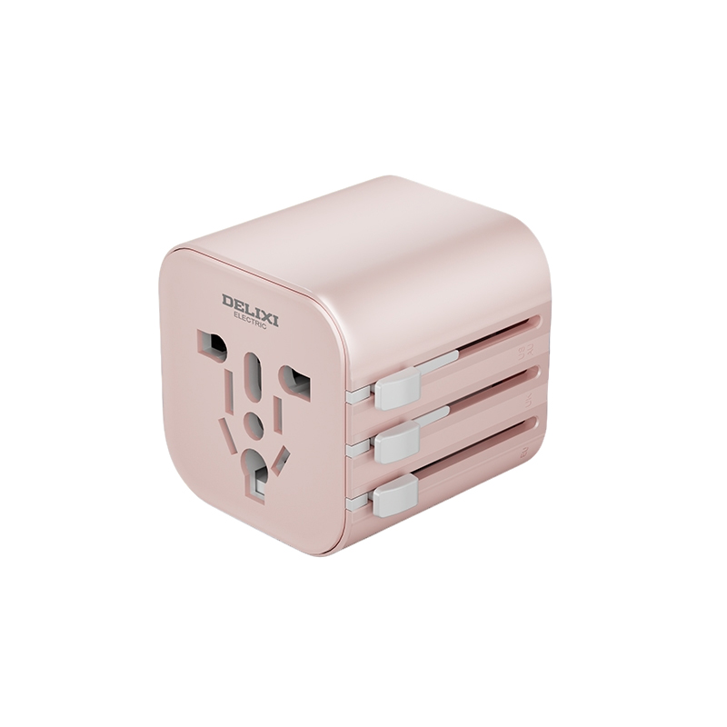产品:德力西电气全球通旅行插座 基础款 粉色 产品型号:CD98-SPQ(HE)Q (F) 产品颜色:粉色 宽幅电压:100-240V适配 产品尺寸:55*50* 52mm 产品材质:PC+ABS 阻燃材料 电流:6A MAX 产品位数:欧标、英标、美标、澳标、一位二孔、一位三孔、无线