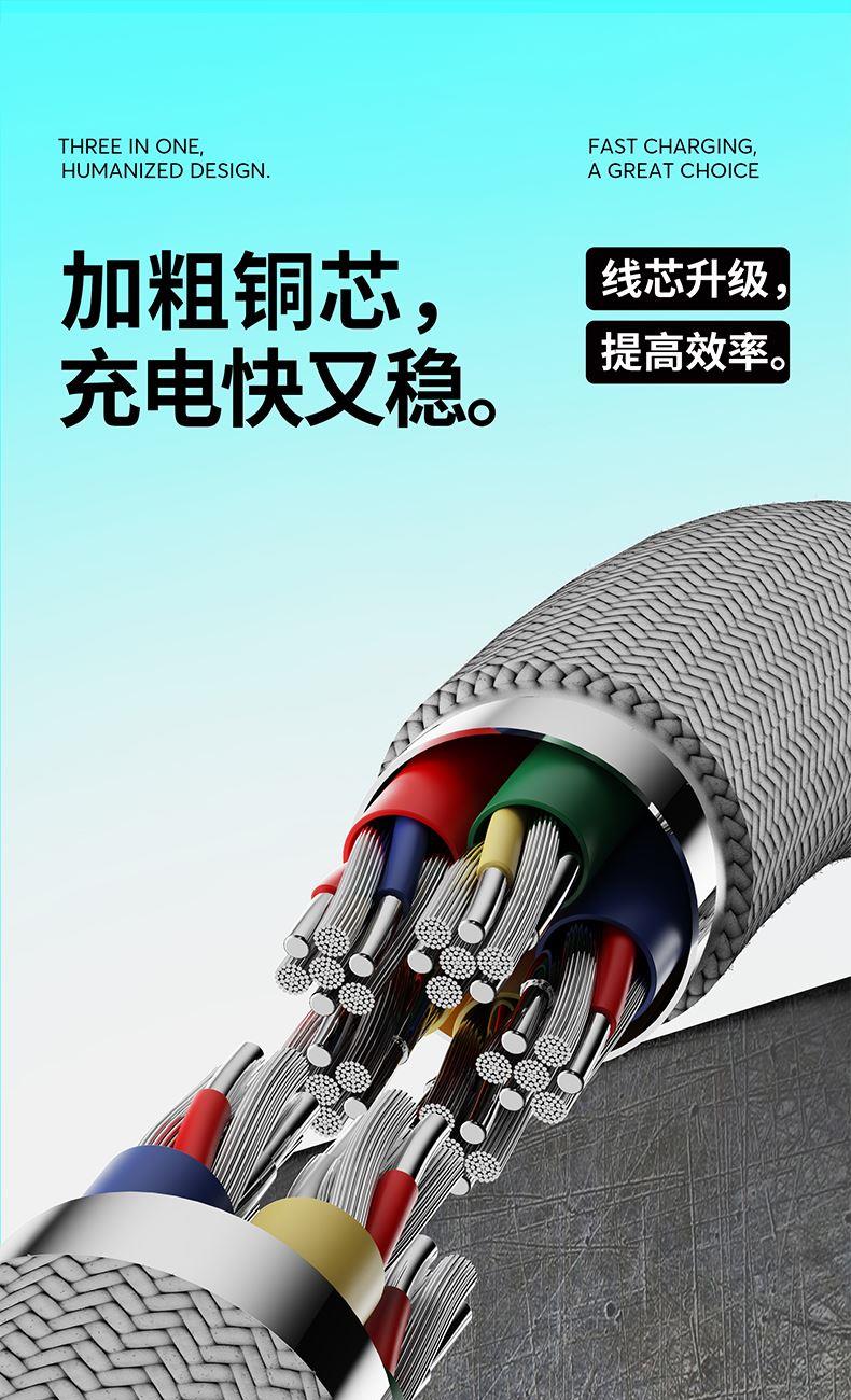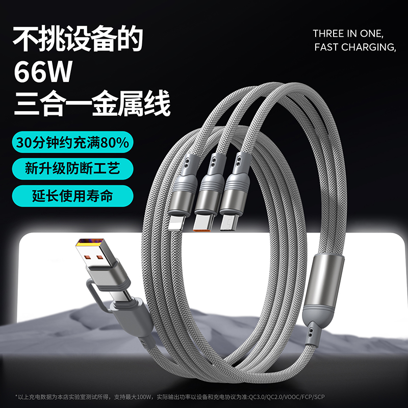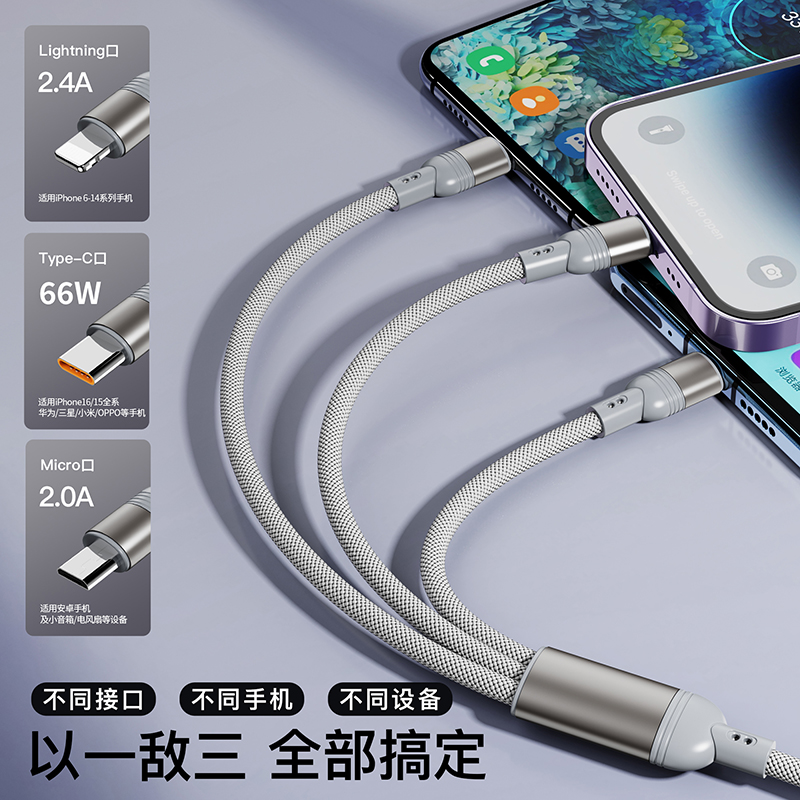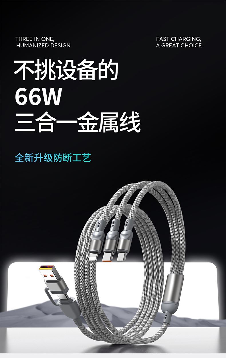66W超级快充,充电更快 加粗编织线,一体成型充电头 二拖三设计,接口满足各种手机 1.2米长度设计,使用方便 编织线耐磨耐用,不易折断