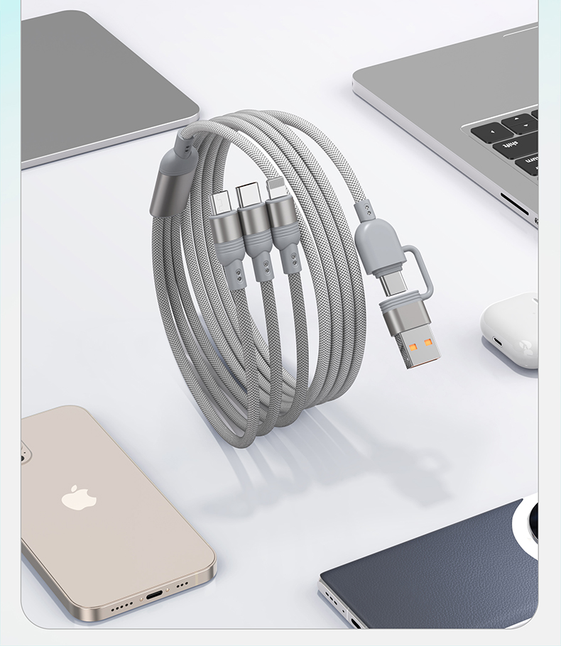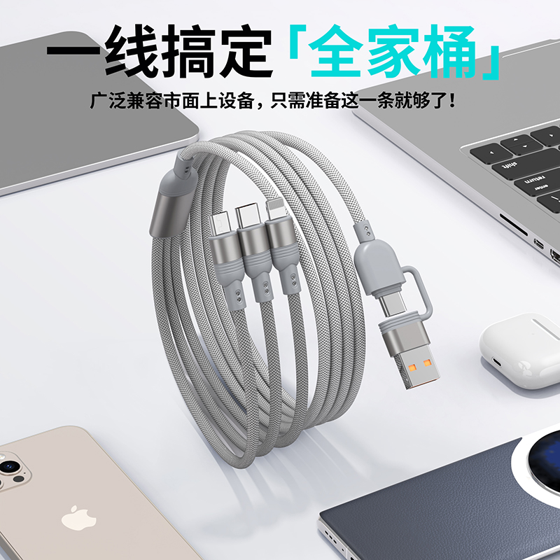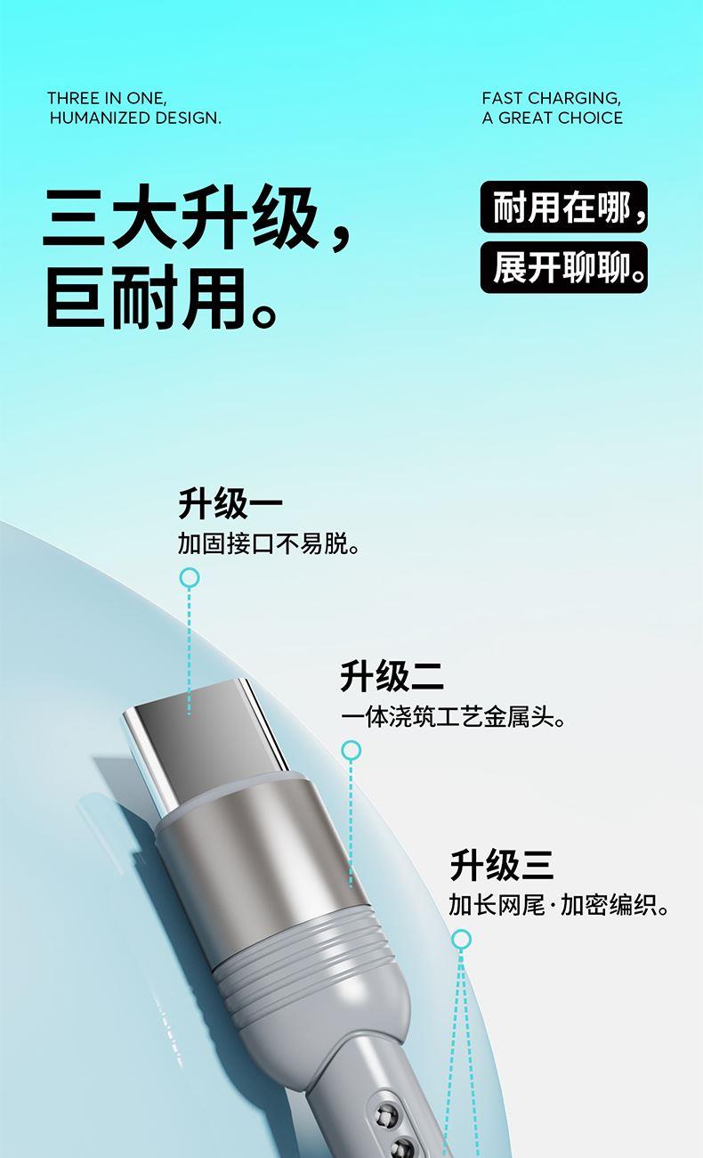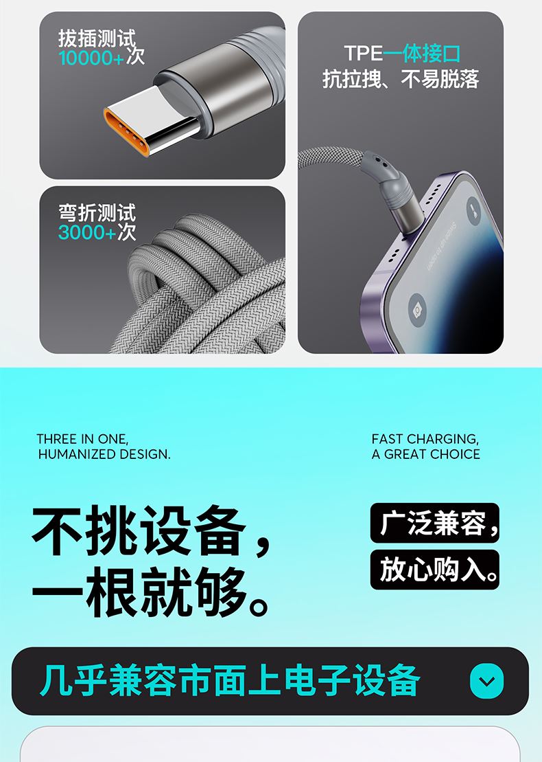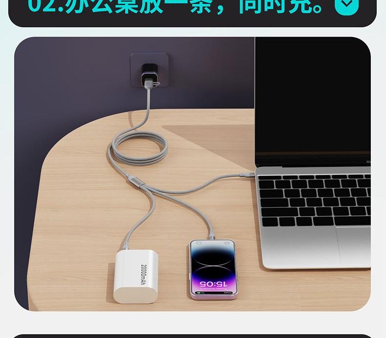 66W超级快充,充电更快 加粗编织线,一体成型充电头 二拖三设计,接口满足各种手机 1.2米长度设计,使用方便 编织线耐磨耐用,不易折断