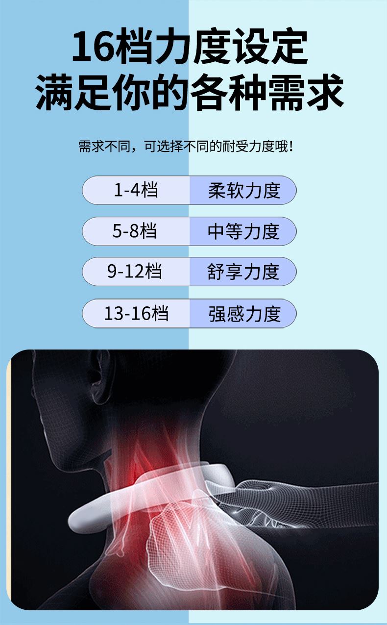 10 大模式 + 16 档力度 + 双频按摩:涵盖揉捏、捶打、脉冲等 10 大专业按摩模式,搭配 16 档细腻力度调节,再加上低 / 中双频按摩可选,无论是日常放松、运动后舒缓,还是针对性缓解颈椎不适,都能匹配需求,全家老少都能用