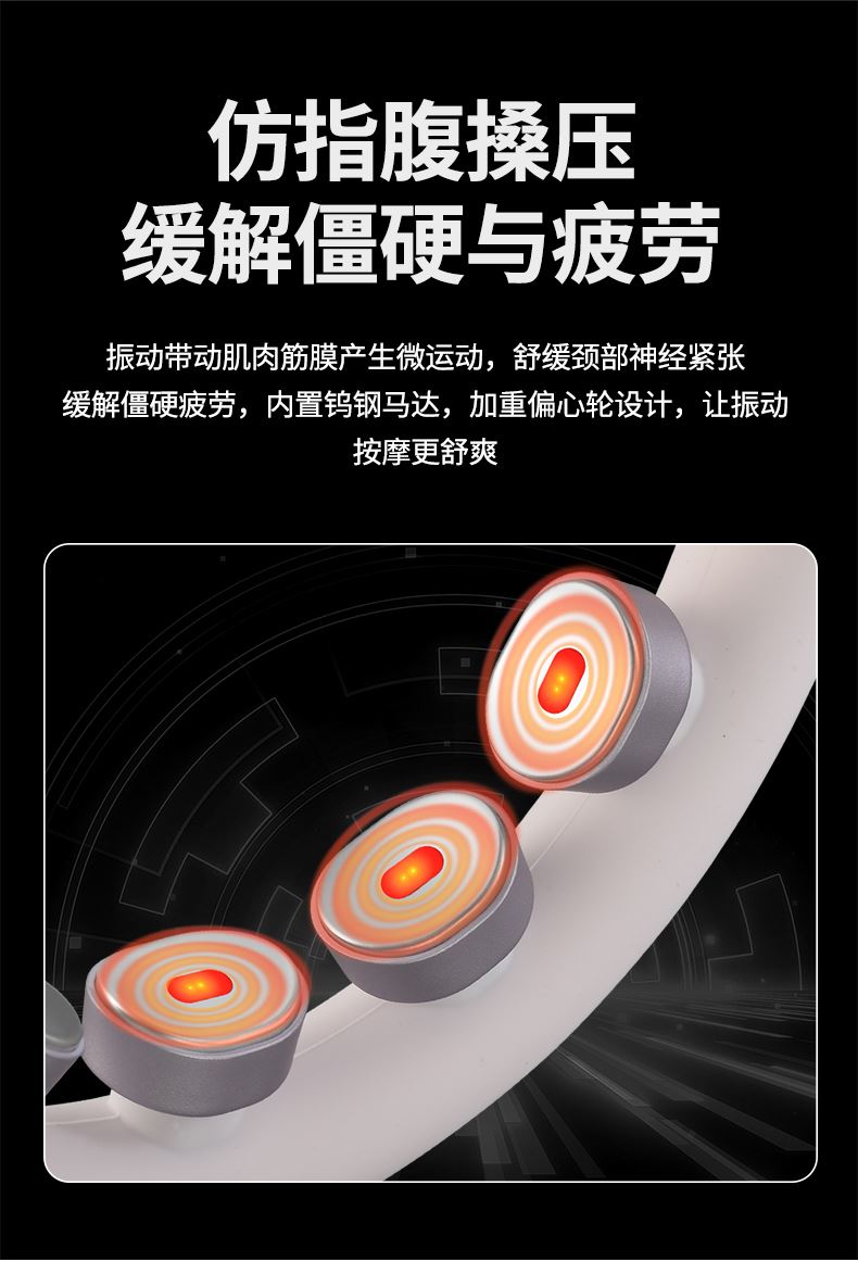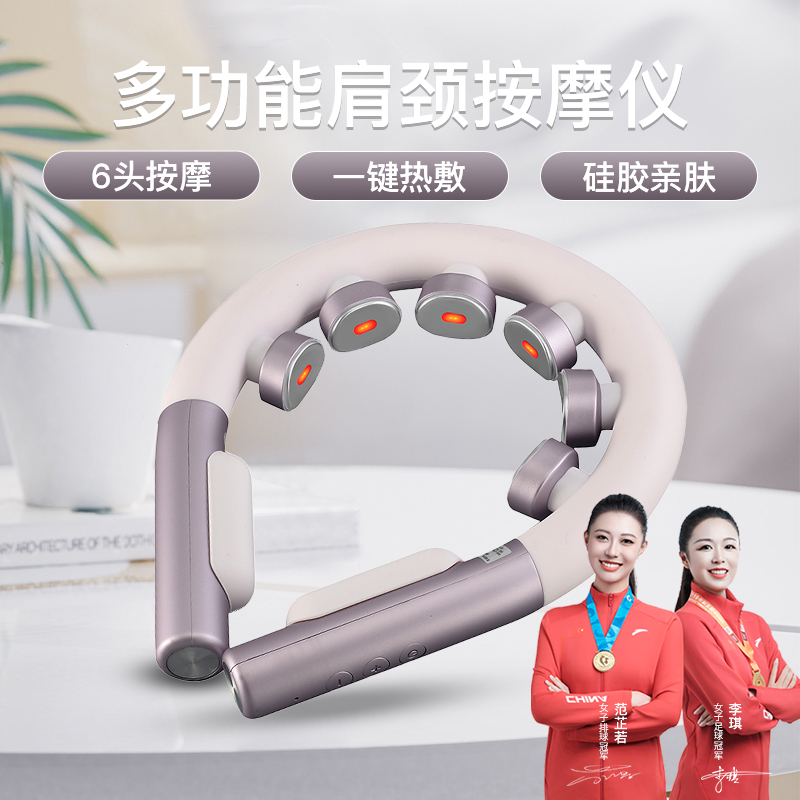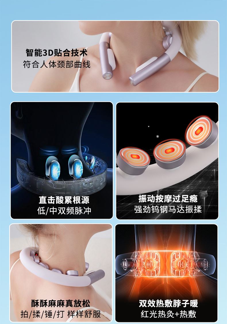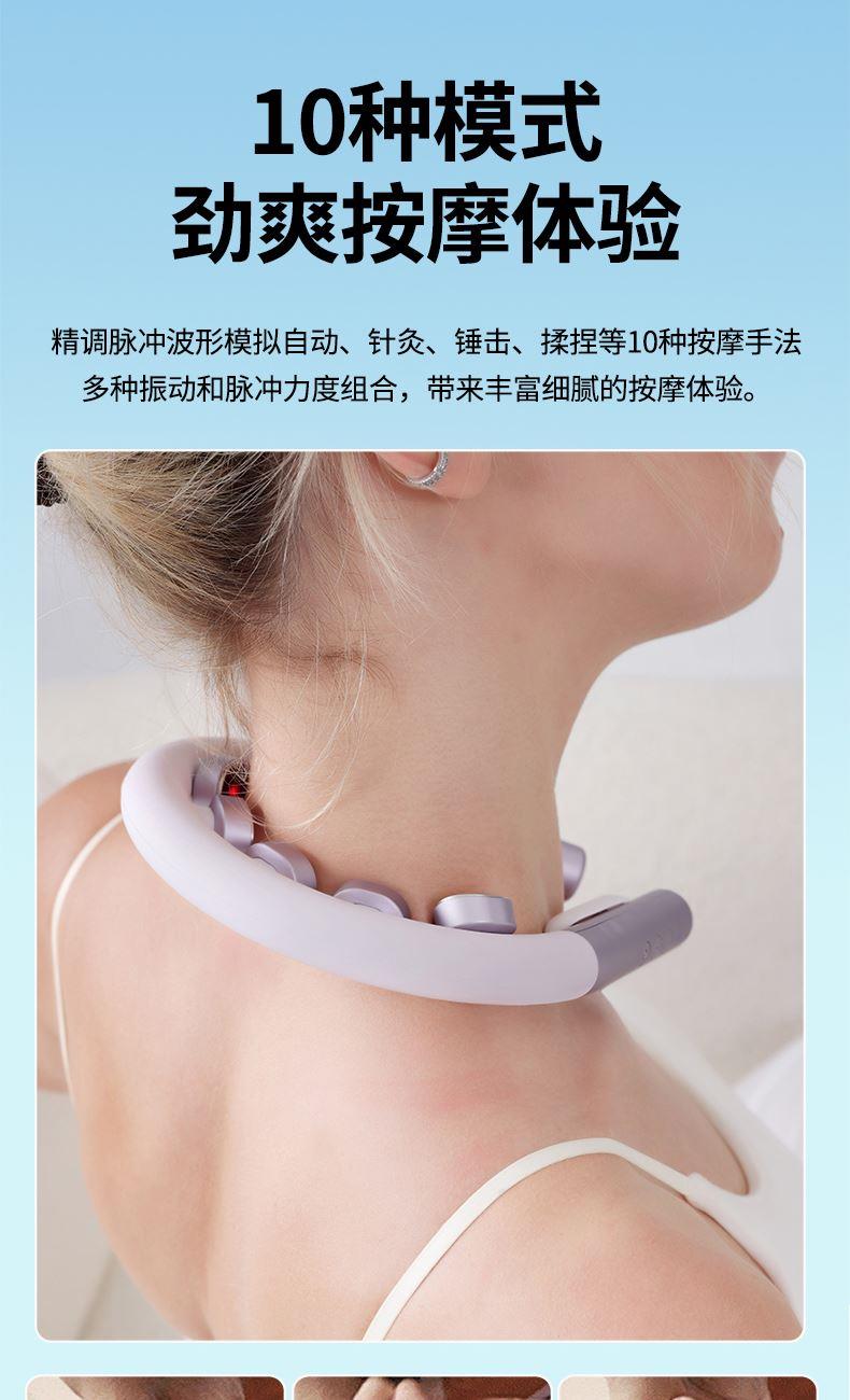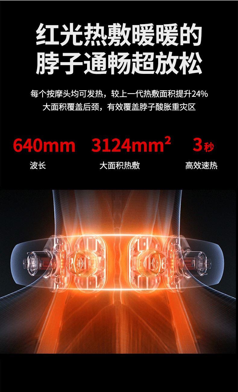 6 头立体按摩 + 360° 旋转:6 组按摩头搭配 360° 任性旋转设计,突破传统按摩局限,贴合颈椎曲线,覆盖后颈、肩周等酸痛区域,多维度模拟人手揉捏、按压,一次按摩即可缓解大面积肌肉僵硬