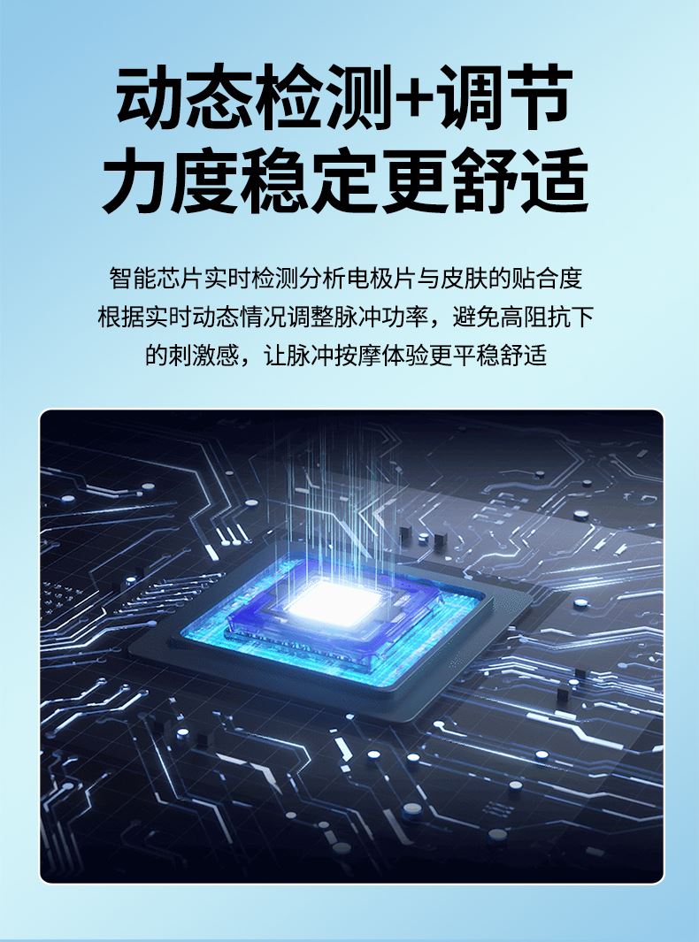智能芯片动态调节技术:内置高灵敏智能芯片,实时检测电极片与皮肤的贴合度,根据皮肤接触状态动态调整脉冲功率,避免高阻抗下的刺痛感,让脉冲按摩全程平稳舒适,新手也能轻松驾驭