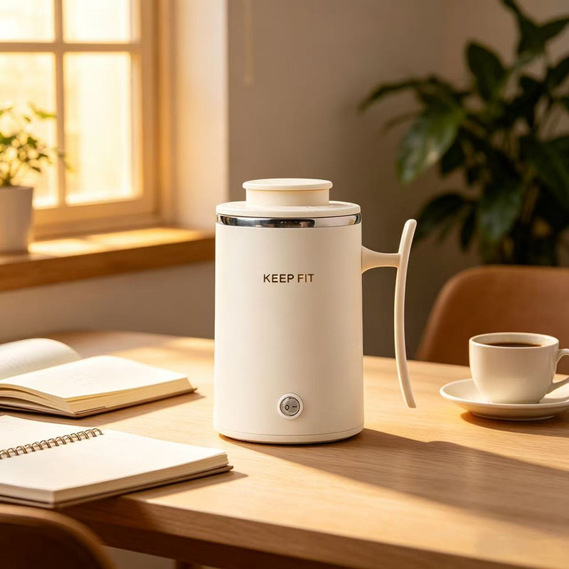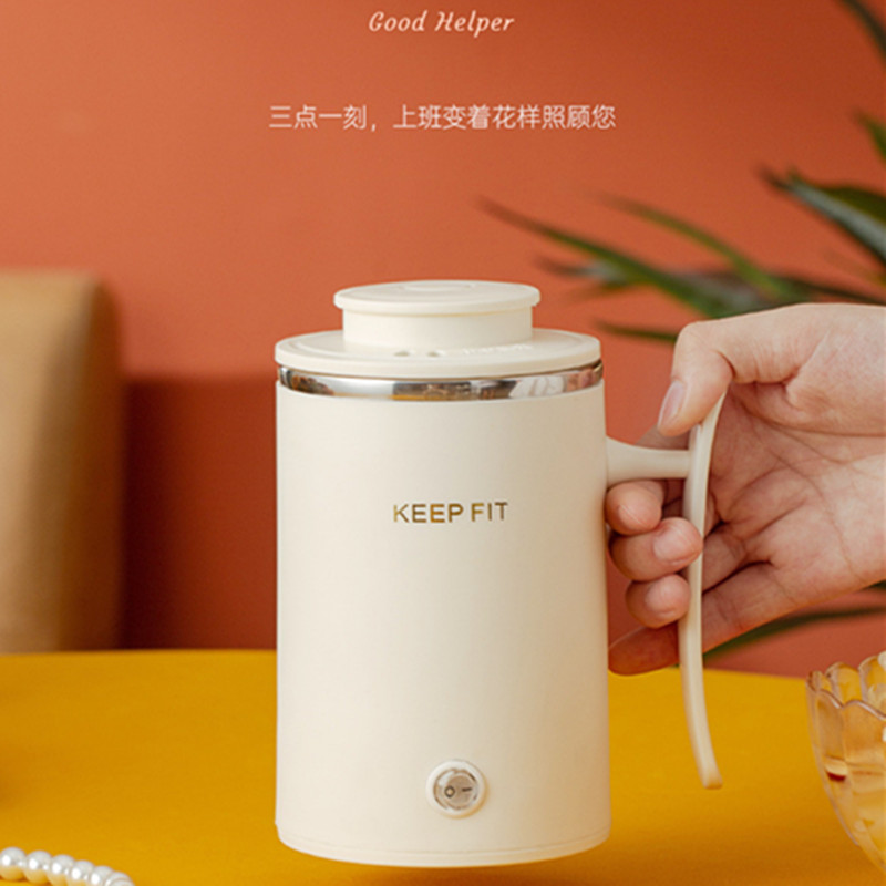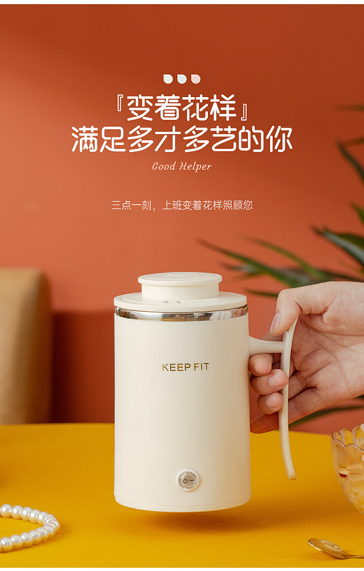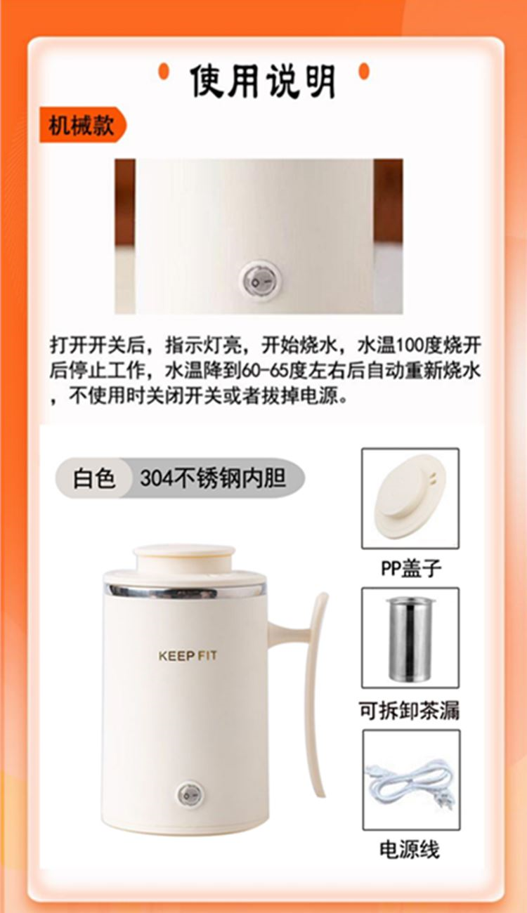 额定功率:300W 额定电压:220V 产品颜色:元气绿/樱花粉/象牙白 产品容量:400ML 产品款式:机械款 包装清单:主机、滤网、电源线、说明书 包装尺寸:13*13*17.5(cm) 特色功能 1、食品级食品可接触304不锈钢内胆 耐腐蚀材质 2、携带方便,出行好伴侣,轻巧实用颜值高 3、机械款方便操作,即插即用人体工程学 4、舒适提手,细密滤网,透气盖口 5、电热杯/水杯二合一,机械款开关档