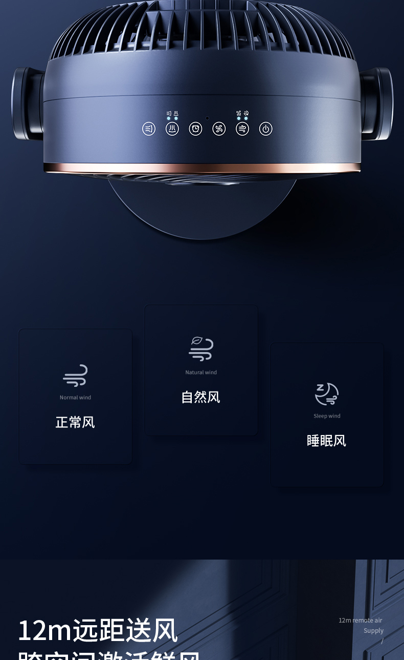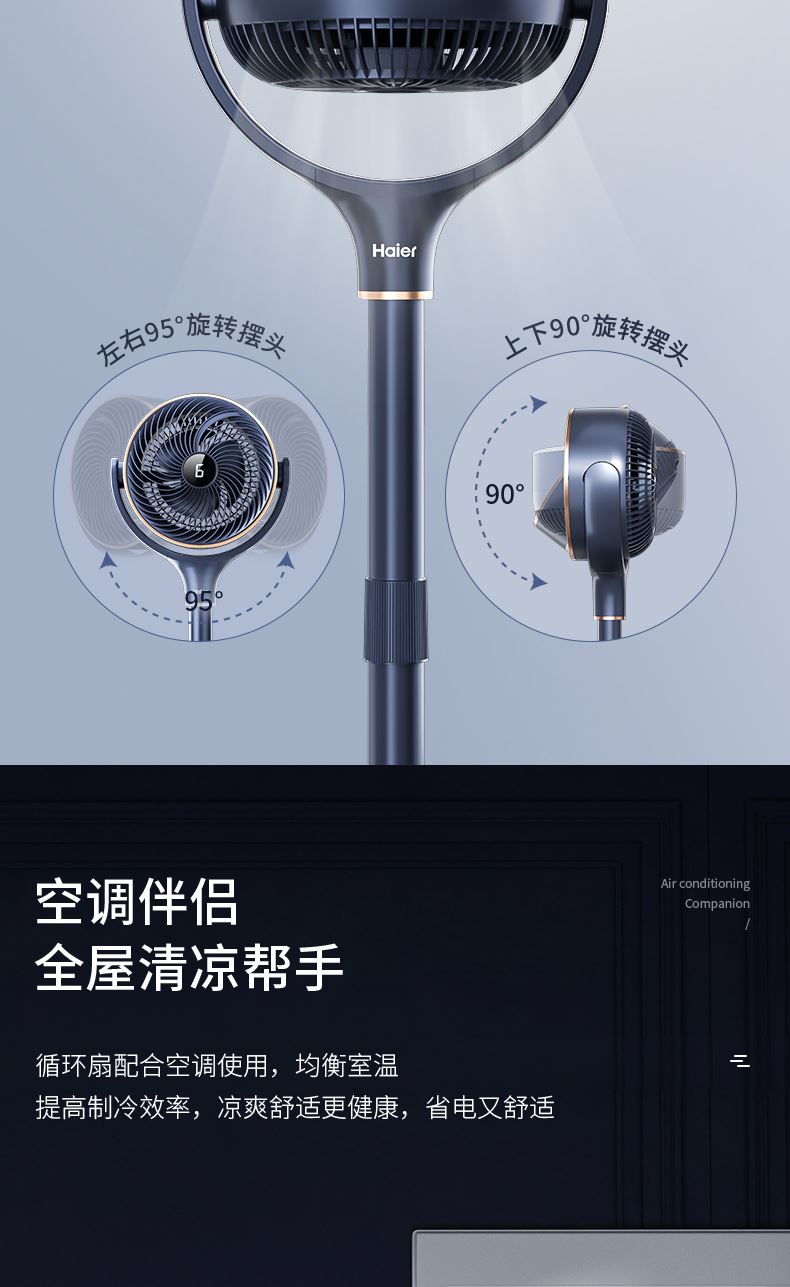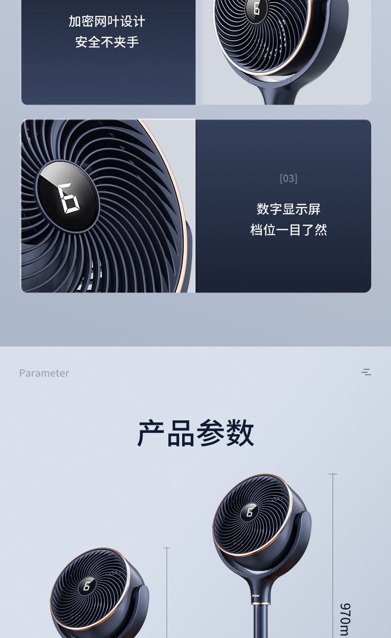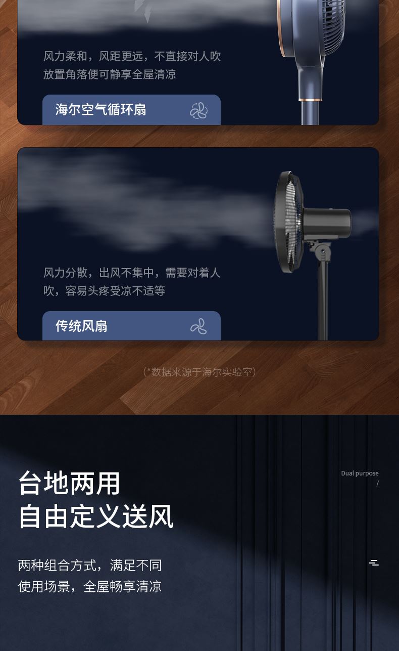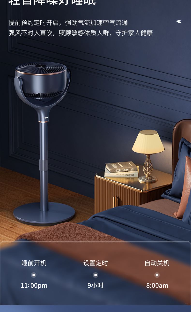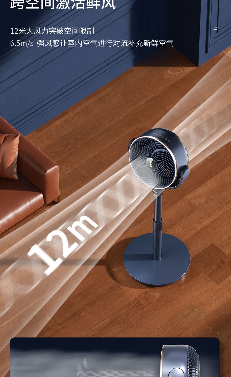 台地两用设计,适配多场景摆放 3D 立体摇头,全屋空气快速循环 6 档风速 + 3 种风类,风感舒适柔和 遥控 + 9 小时定时,操作便捷省心 轻音低噪运行,节能省电更安全