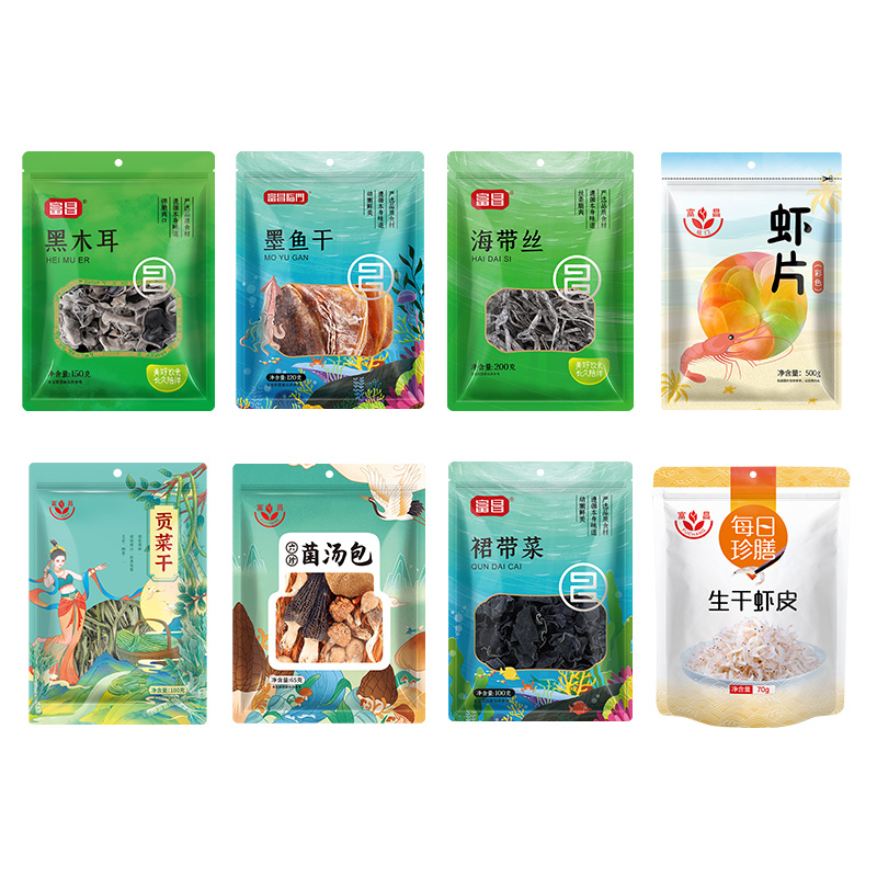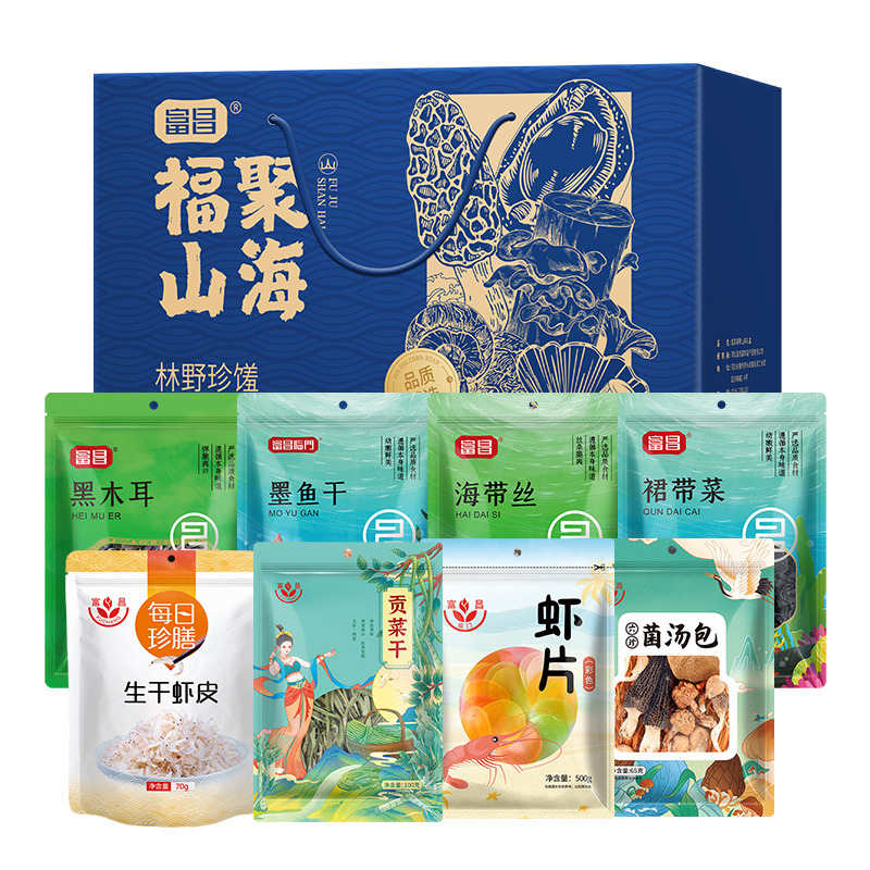 富昌贡菜干100g 富昌海带丝200g 富昌六珍菌汤包65g 富昌墨鱼干120g 富昌临门裙带菜100g 富昌临门虾片500g 富昌东北黑木耳150g 富昌生干虾皮70g