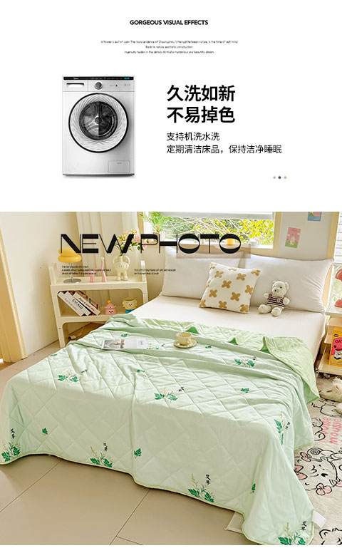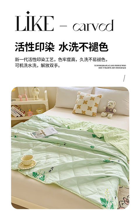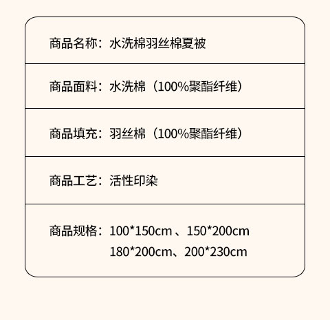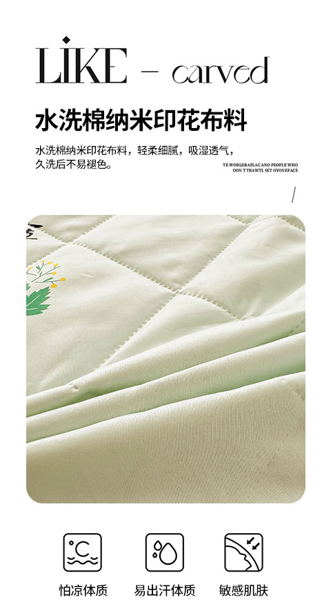 1:夏日专属夏凉被 纳米水洗棉印花夏被 2:水洗棉纳米印花布料,轻柔细腻,吸湿透气, 久洗后不易褪色。 尺寸:180*200cm 包装:彩盒