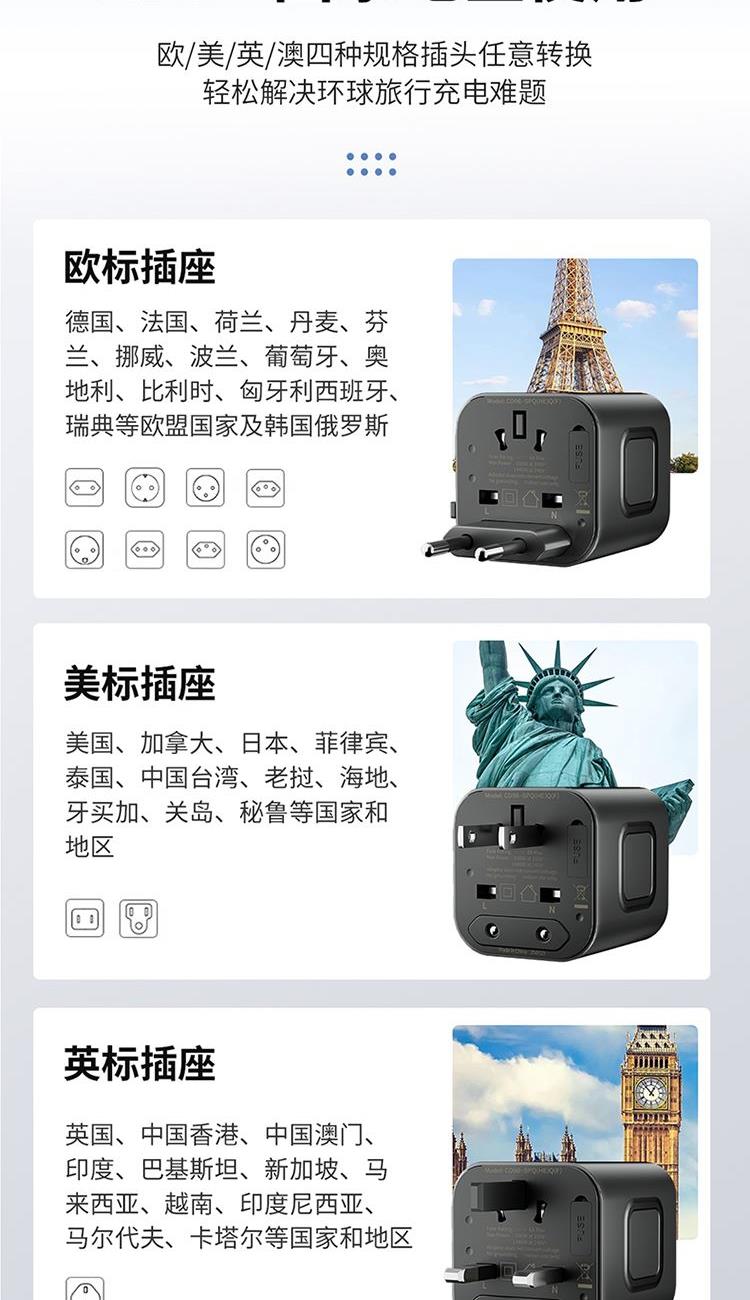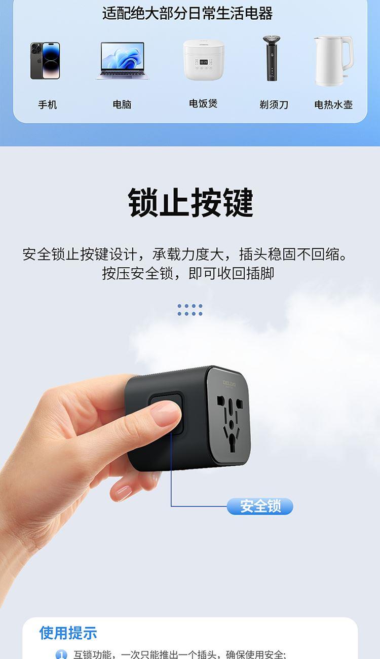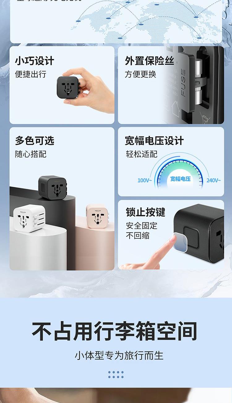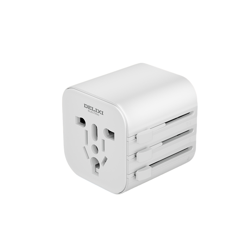 产品:德力西电气全球通旅行插座 基础款 白色 产品型号:CD98-SPQ(HE)Q (B) 产品颜色:白色 宽幅电压:100-240V适配 产品尺寸:55*50* 52mm 产品材质:PC+ABS 阻燃材料 电流:6A MAX 产品位数:欧标、英标、美标、澳标、一位二孔、一位三孔、无线