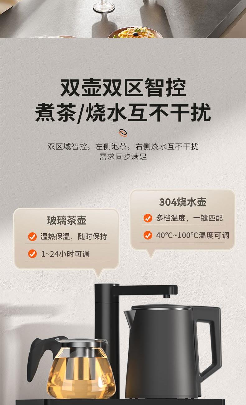 额定电压:220V~ 额定功率:1360W 额定频率:50Hz 容 量:养生壶900ML,烧水壶800ML 材 质:龙头:ABS,面板:钢化玻璃 烧水壶外观、玻璃壶把手、侧板:PP,玻璃壶:高硼硅玻璃,烧水壶内胆:304不锈钢 触控面板,操作简单 旋转水龙头,取水方便快捷 24H长效保温,畅想温热水 收纳储物柜,方便水杯茶叶收纳 大容量储水更多,下置换水省心省力