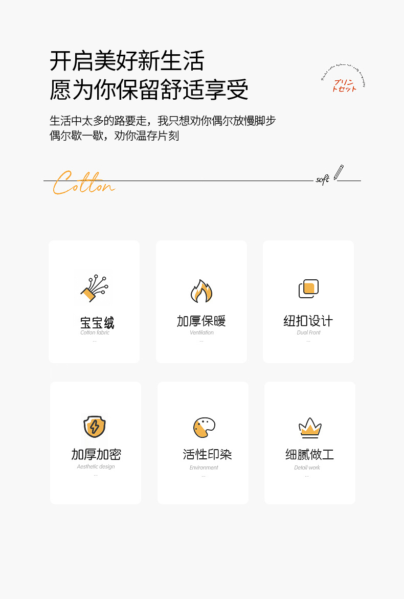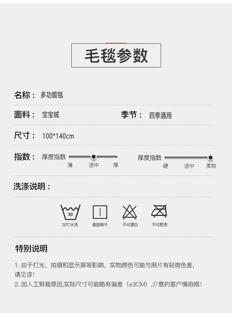 规格:100*140cm 面料:宝宝绒 克重:400g 产品包装:精美礼盒 产品特点: 1.宝宝绒面料手感佳,光滑柔软,易于清楚。 2.宝宝绒是一种独特的面料,非常适用在贴近皮肤。
