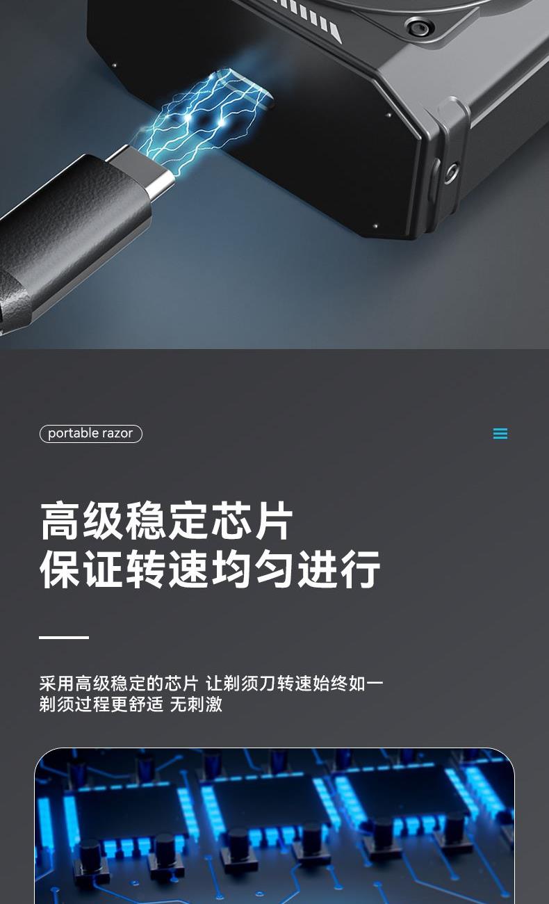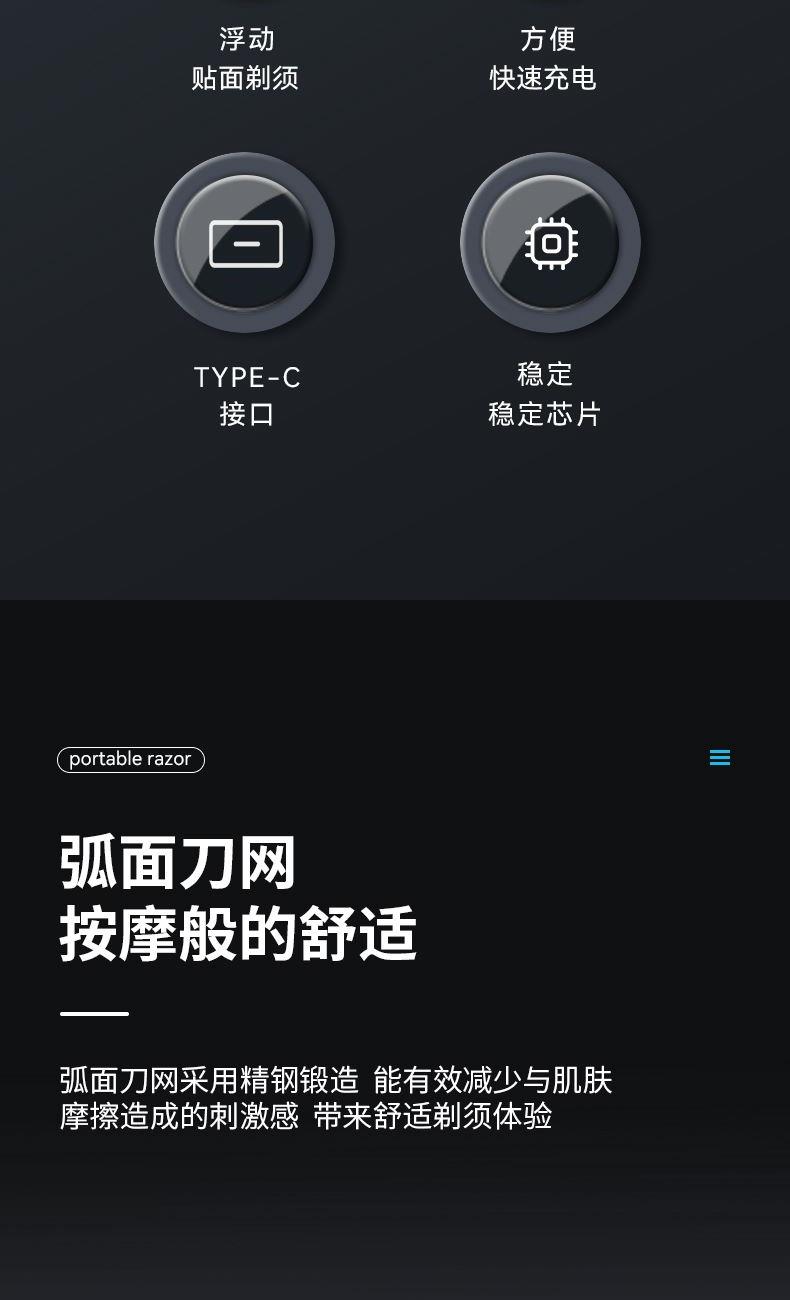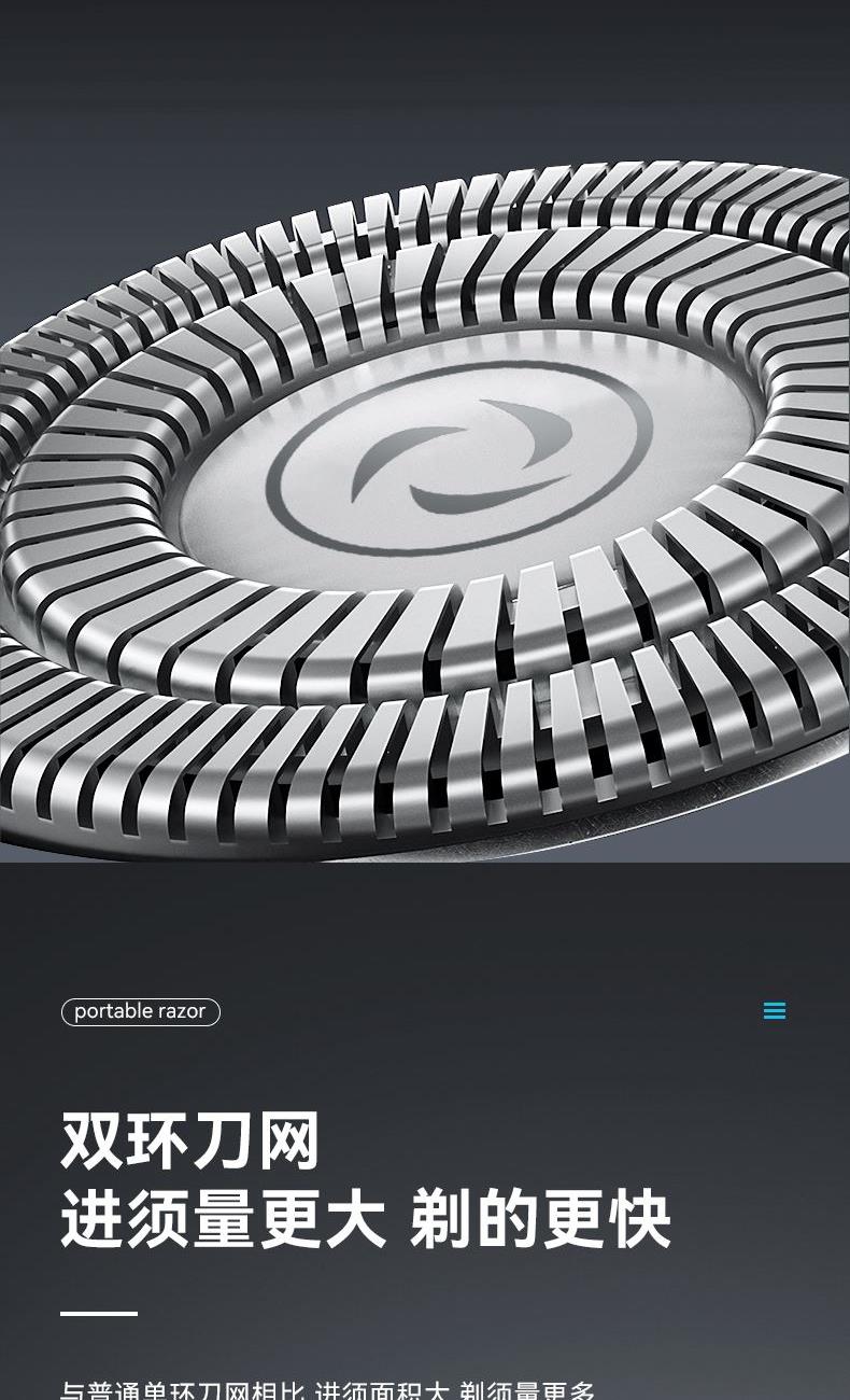 额定电压:3.7V⎓ 额定功率:5W 额定输入:5V~1A 电池容量:400mAh 防水等级:IPX6 包装清单:剃须刀,说明书,Type-C充电线,清洁刷 迷你便携,单手可握 双环浮动刀网,双倍提升进须量 TYPE-C快充,60天长效续航 IPX6级防水,机身随心洗 刀头磁吸设计,灵活好拆洗