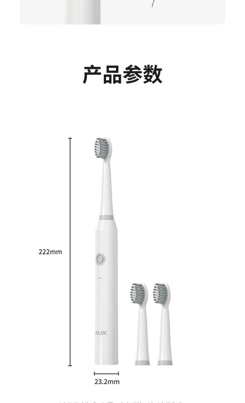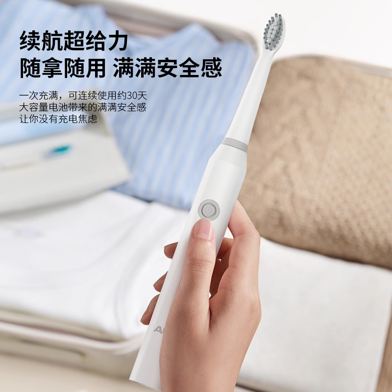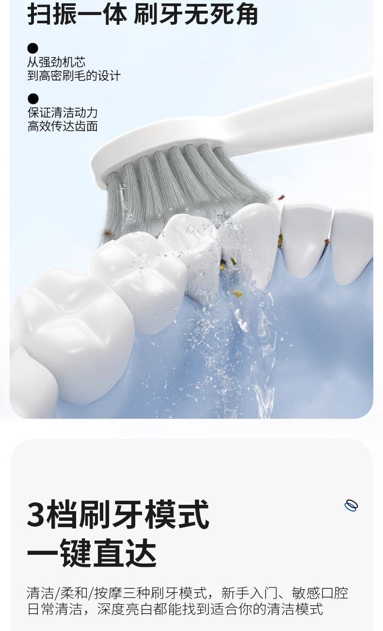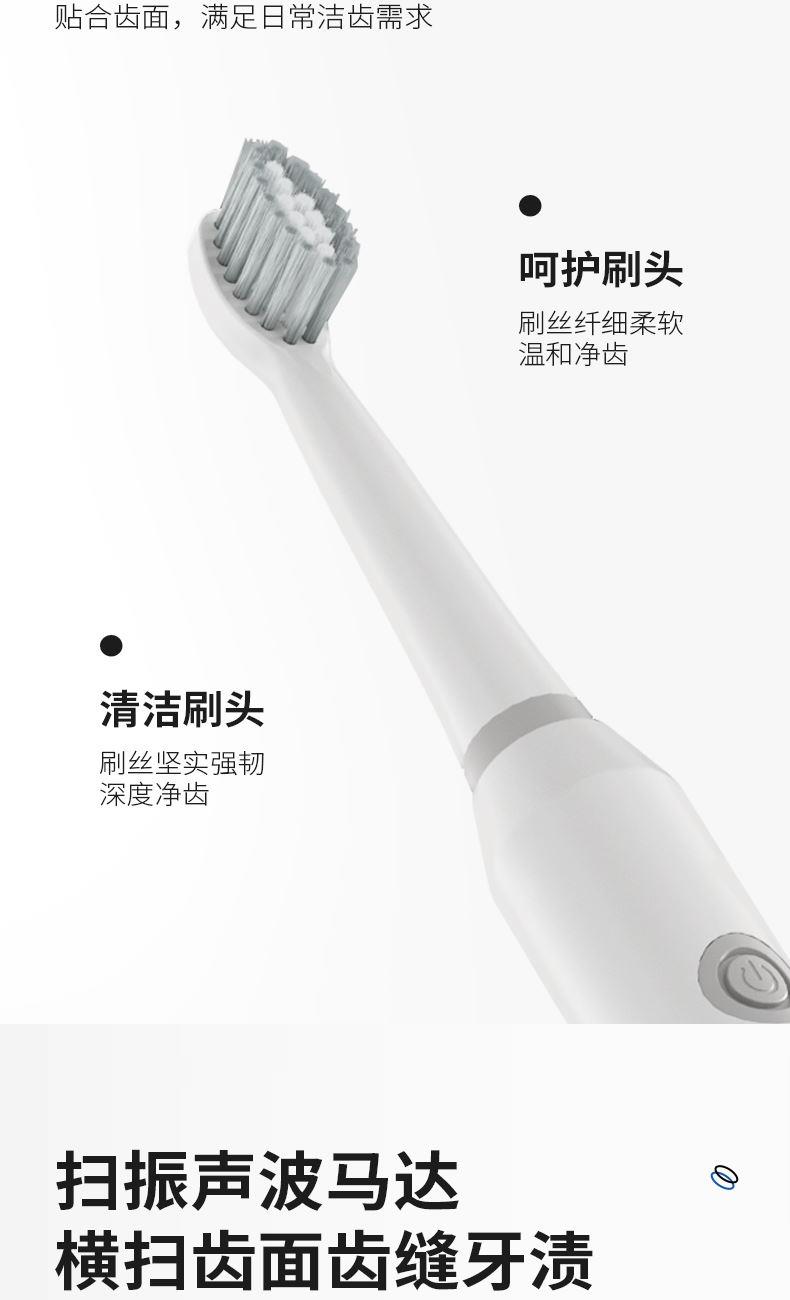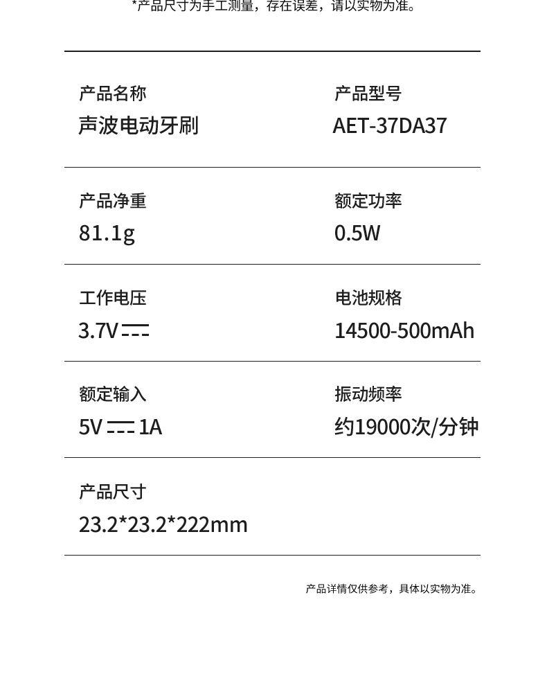 额定电压:3.7V⎓ 额定功率:0.5W 额定输入:5V~1A 电池容量:14500-500mAh 充电方式:Type-C直充充电 防水等级:IPX7 材质:手柄:ABS ,刷头:PP ,刷毛:PBT 精巧型刷头,柔韧软毛深入口腔 3种震动模式,多重选择,轻松洁齿 满电可持续使用30天,长续航更省心 高频率振幅,模拟人体刷牙习惯 IPX7全身防水,全身可放心水洗