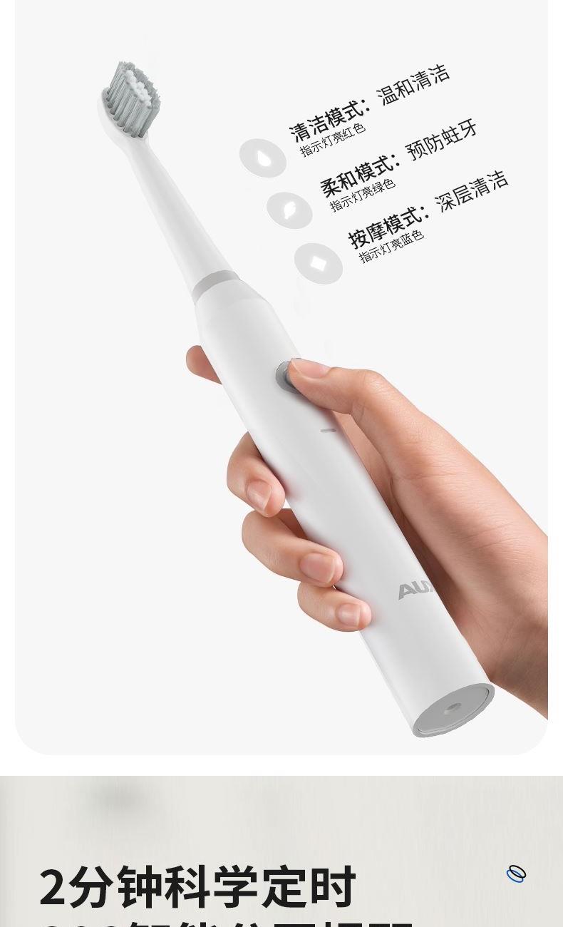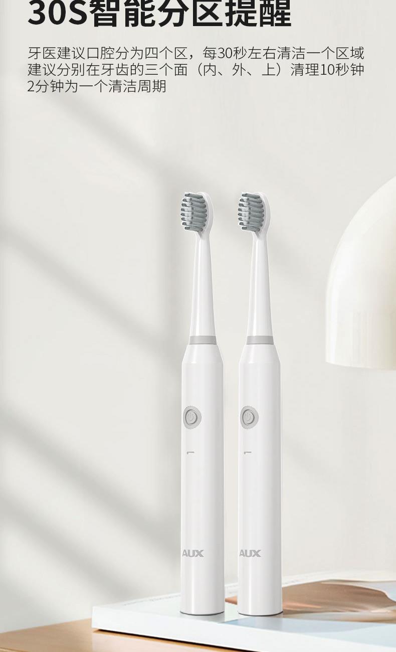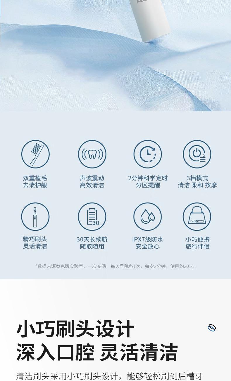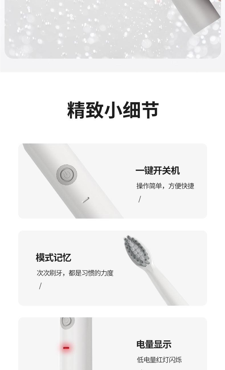 额定电压:3.7V⎓ 额定功率:0.5W 额定输入:5V~1A 电池容量:14500-500mAh 充电方式:Type-C直充充电 防水等级:IPX7 材质:手柄:ABS ,刷头:PP ,刷毛:PBT 精巧型刷头,柔韧软毛深入口腔 3种震动模式,多重选择,轻松洁齿 满电可持续使用30天,长续航更省心 高频率振幅,模拟人体刷牙习惯 IPX7全身防水,全身可放心水洗