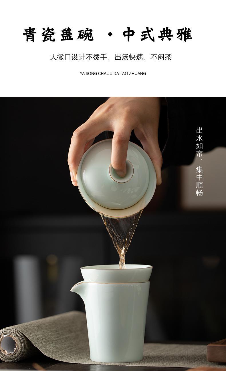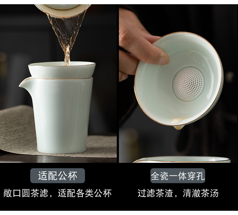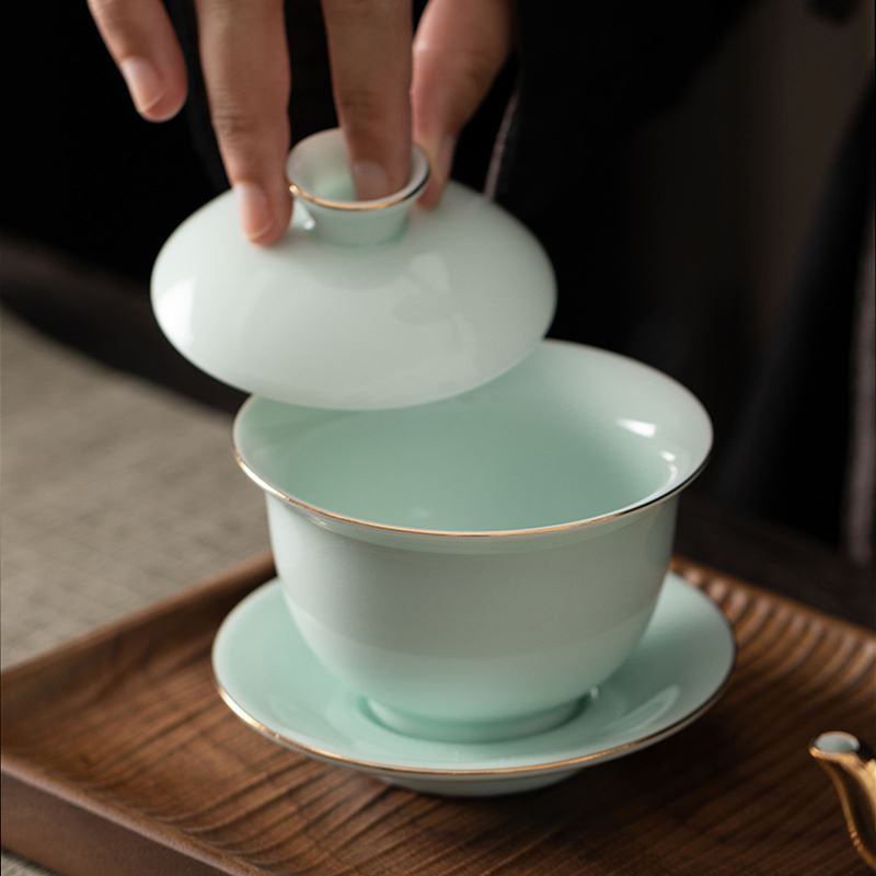 配制:1盖碗6杯 1公道杯1茶托1茶漏 1锦盒 规格: 公道杯:9.2*9.1cm 茶杯:6cm*5cm 盖碗:9.5*9.5cm 材质:青山玉 24K真金 推荐说明:青山玉是青瓷新品,以瓷质细腻,线条明快流畅,色泽纯洁而斑斓著称。青如玉,明如镜,声如磬,描24K真金奢华装饰,被称为瓷器之花。