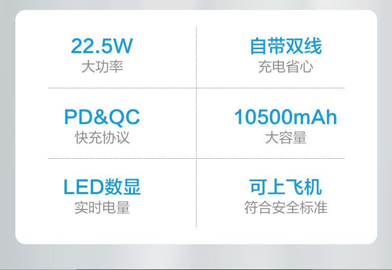 产品型号:KC-DY16 电池能量:10500mAh(典型)38.85Wh 输入:5V-2A,9V-2A,12V-1.5A 产品重量:约251g 颜色:云初白
