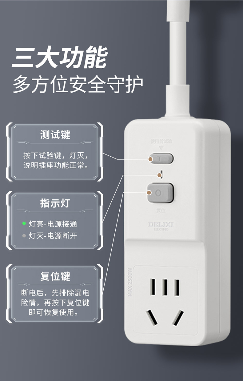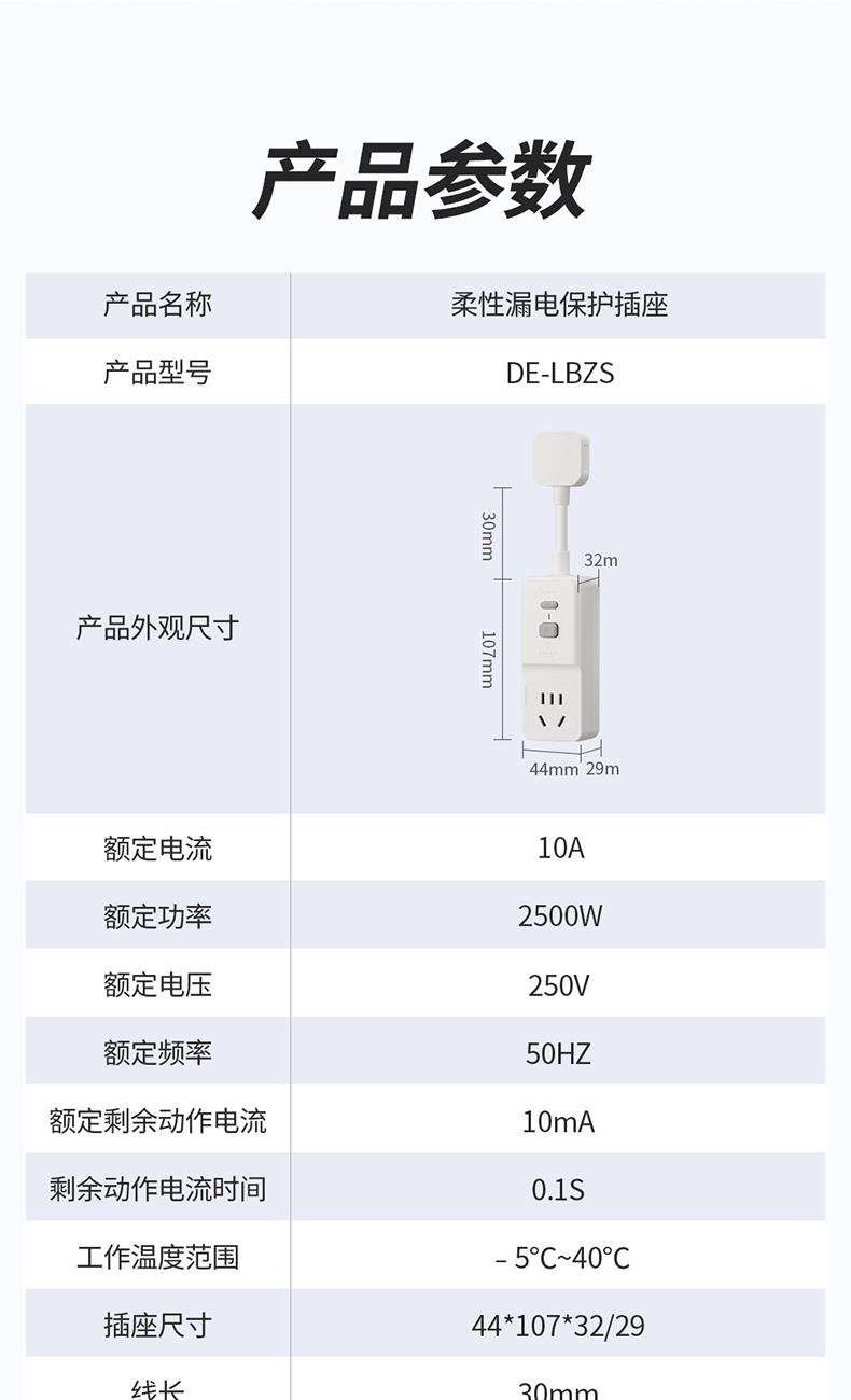德力西电气柔性漏电保护插座 一位五孔 10A 产品型号:DE-LBZS 额定电流:10A 额定功率:2500W 额定电压:250V 额定频率:50HZ 额定剩余动作电流:10mA 剩余动作电流时间:0.1S 工作温度范围:-5℃~40℃ 插座尺寸:44*107*32/29 产品线长:30mm 执行标准:GB/T 20044