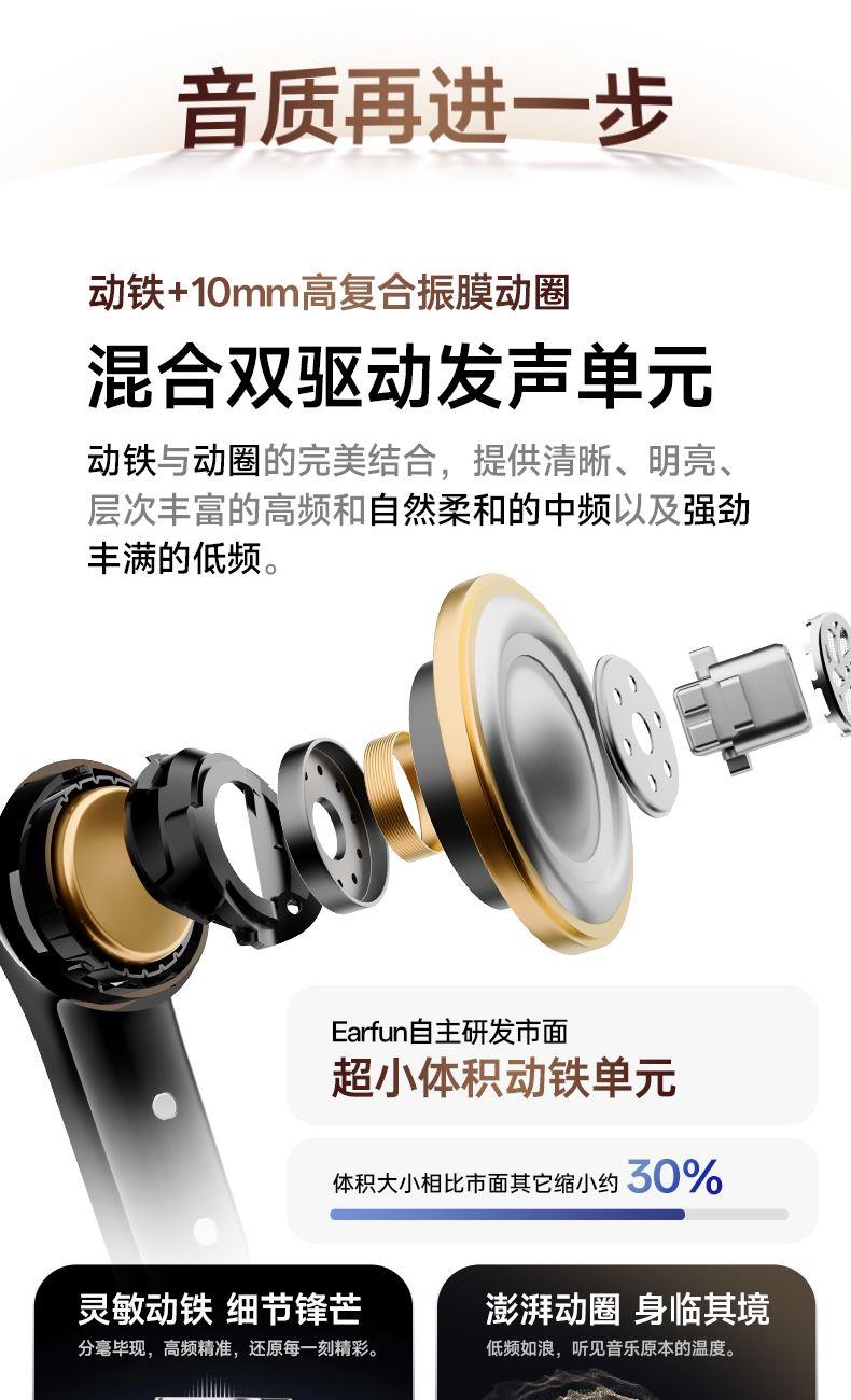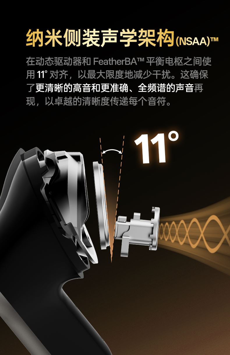 ● 10mm复合动圈+定制动铁双驱动单元,高音明亮清晰,低音强劲丰满