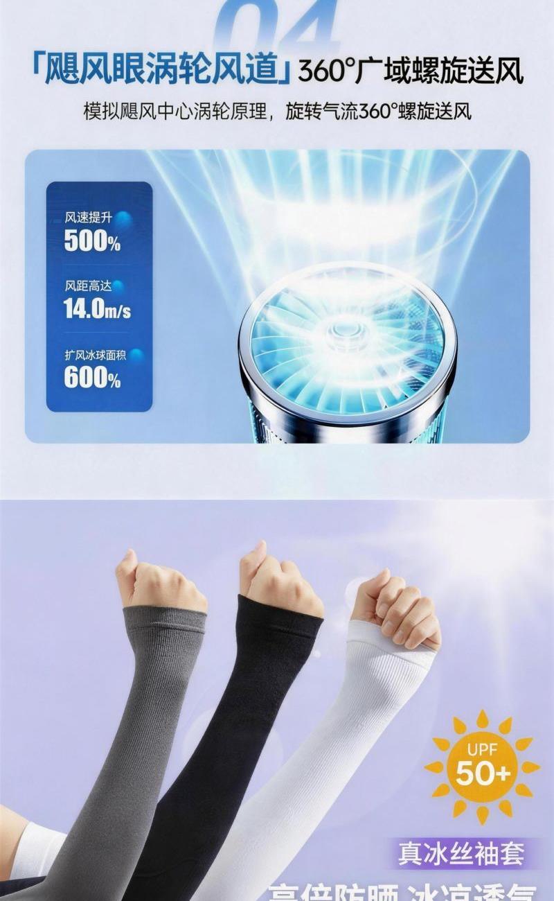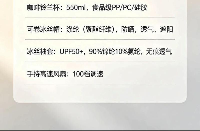 配置: 可卷双面冰丝帽*1 手持高速风扇*1 冰丝袖套*1 塑料铃兰咖啡杯*1 主要材质和功能: 可卷冰丝帽:涤纶(聚酯纤维),防晒,透气,遮阳 冰丝袖套:UPF50+,90%锦纶10%氨纶 手持高速风扇:100档调速 咖啡铃兰杯:550ml,食品级PP/PC/硅胶