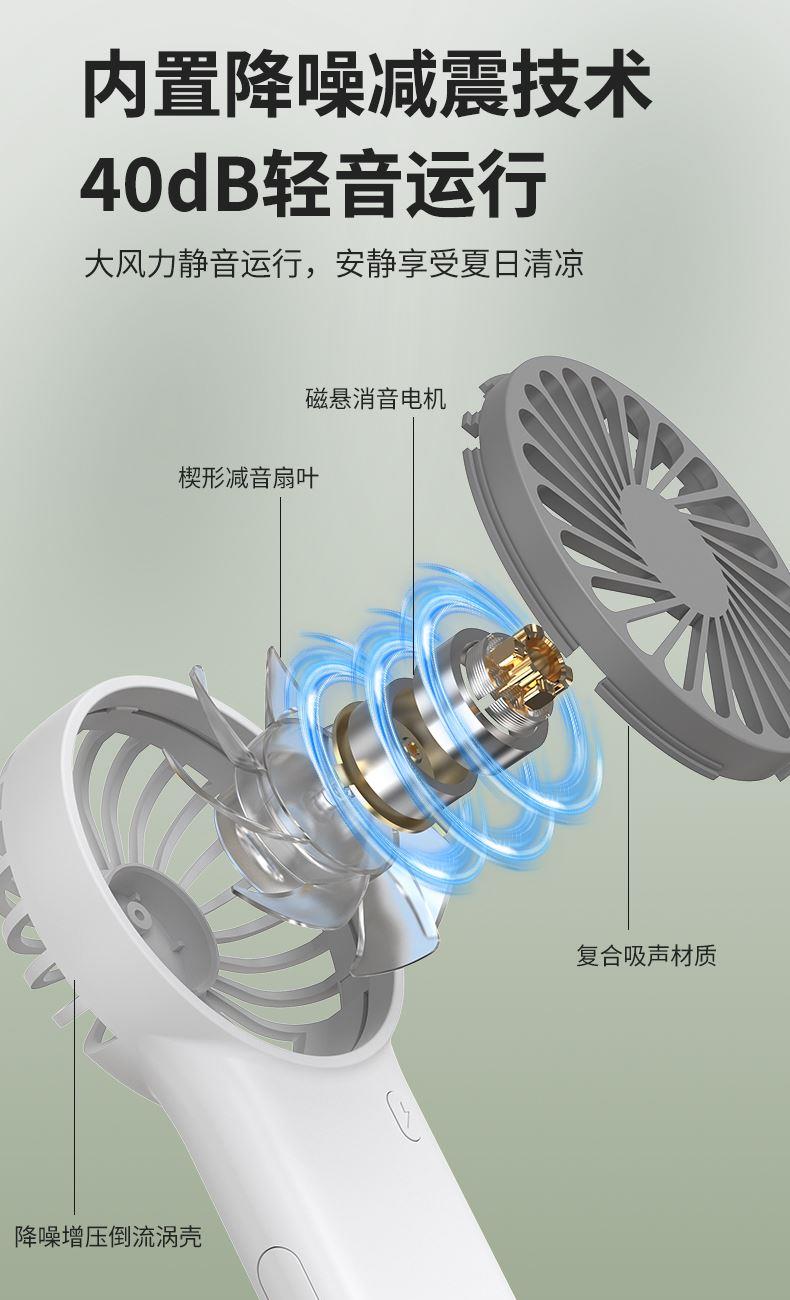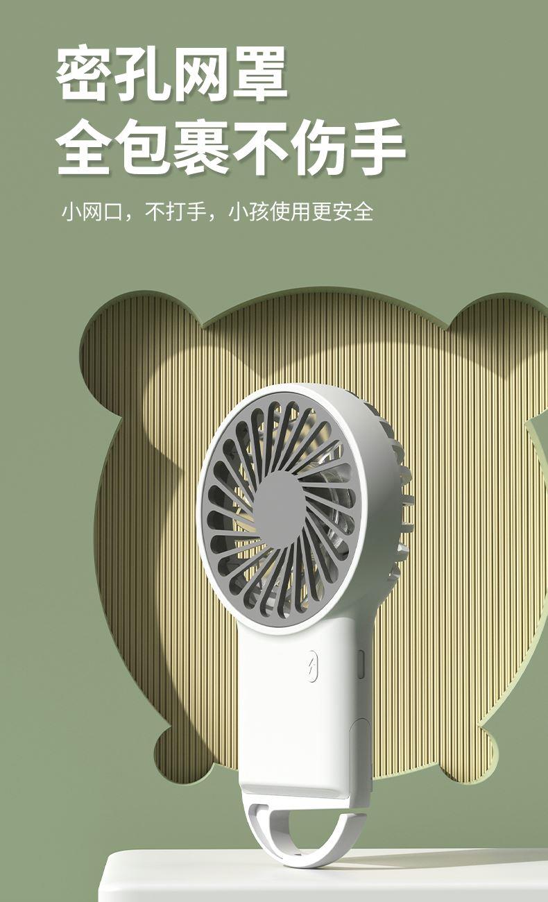【推荐理由】: 精致小巧,方便携带 可挂背包,可立桌面 多场景 三档风速可调 风扇罩可拆卸清洁 颜色:绿色 白色 橙色 尺寸:85*33*160mm 容量:300mAh 包装:彩盒包装