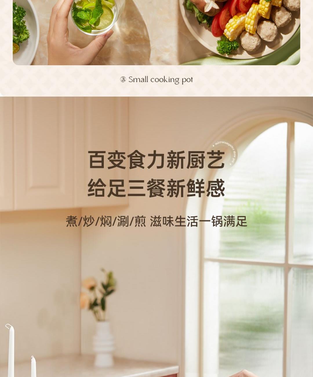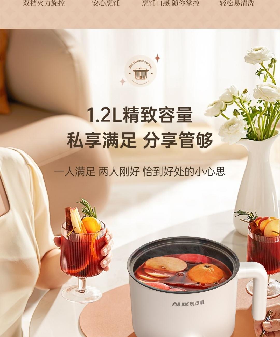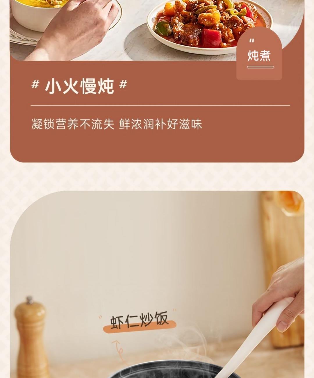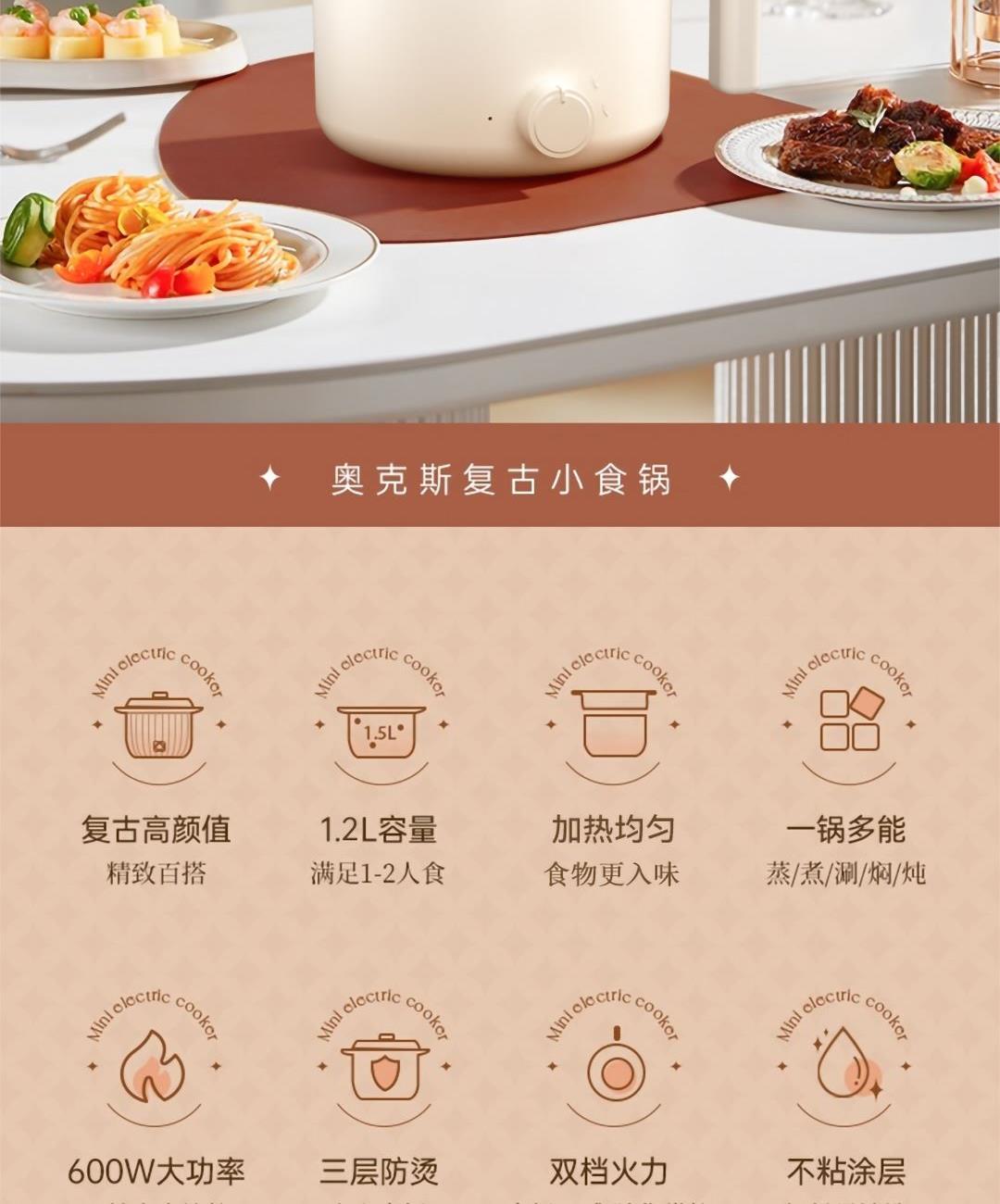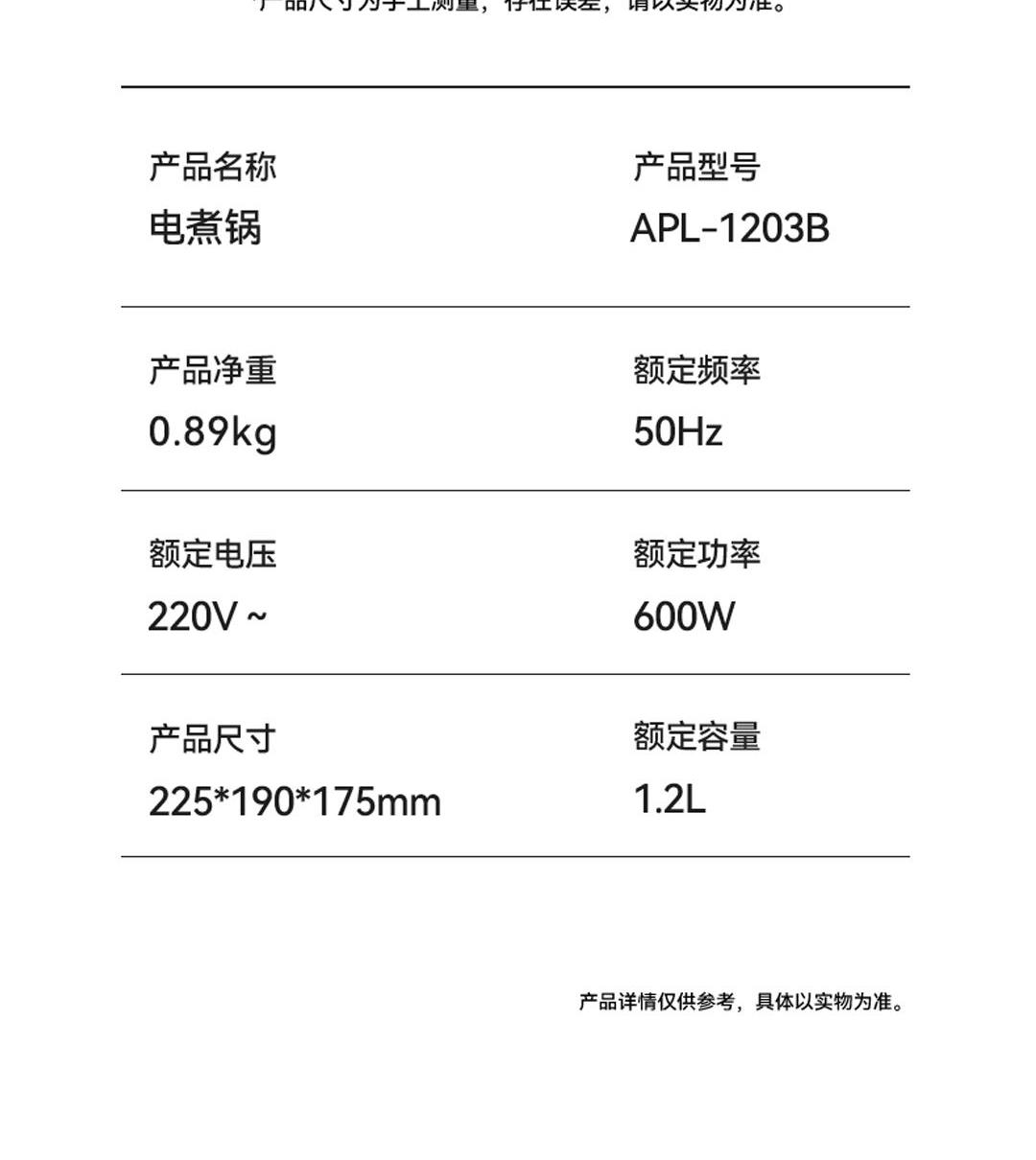 额定电压:220V~ 额定功率:1500W 额定频率:50Hz 容量:1200M 材质:内胆:聚四氟乙烯喷涂内胆,三角护套、电源线 一锅多滋味,满足三餐花式美味 两档火力可调,快煮慢炖随心选 不沾内胆,轻油烹饪更健康 双重跳断保护,烹饪更安心 1.2L容量,小巧机身免收纳