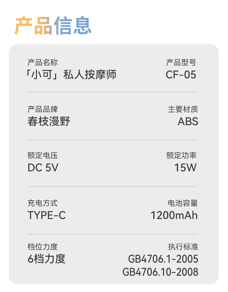 充电电压: DC 5V 额定功率: 15W 电机转速: 3800r/min 电池容量: 1200mAh 产品重量: 860g 产品颜色: 奶黄色 强悍性能,高性价比 快速放松,即刻享受 Type-C闪电快充,时刻补充能量 让按摩融入生活,肆意挥汗,悦享身心