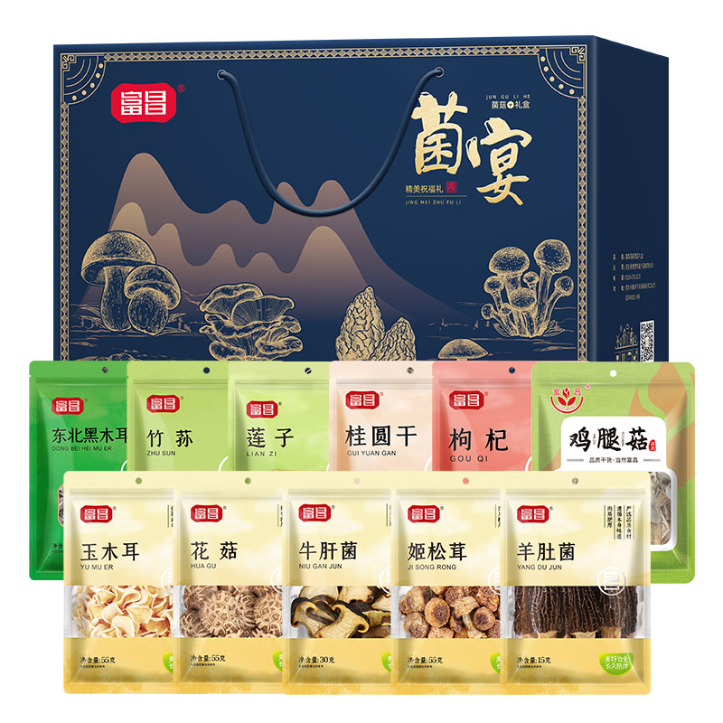 富昌东北黑木耳80g 富昌白玉耳55g 富昌花菇55g 富昌竹荪30g 富昌鸡腿菇100g 富昌黑牛肝菌30g 富昌姬松茸55g 富昌羊肚菌15g 富昌枸杞100g 富昌莲子250g 富昌桂圆干400g