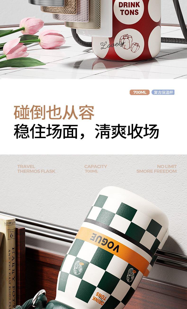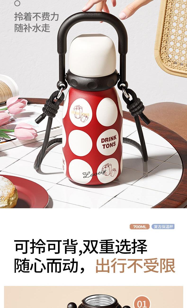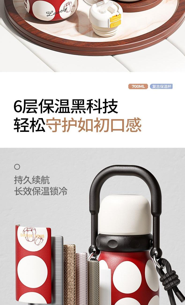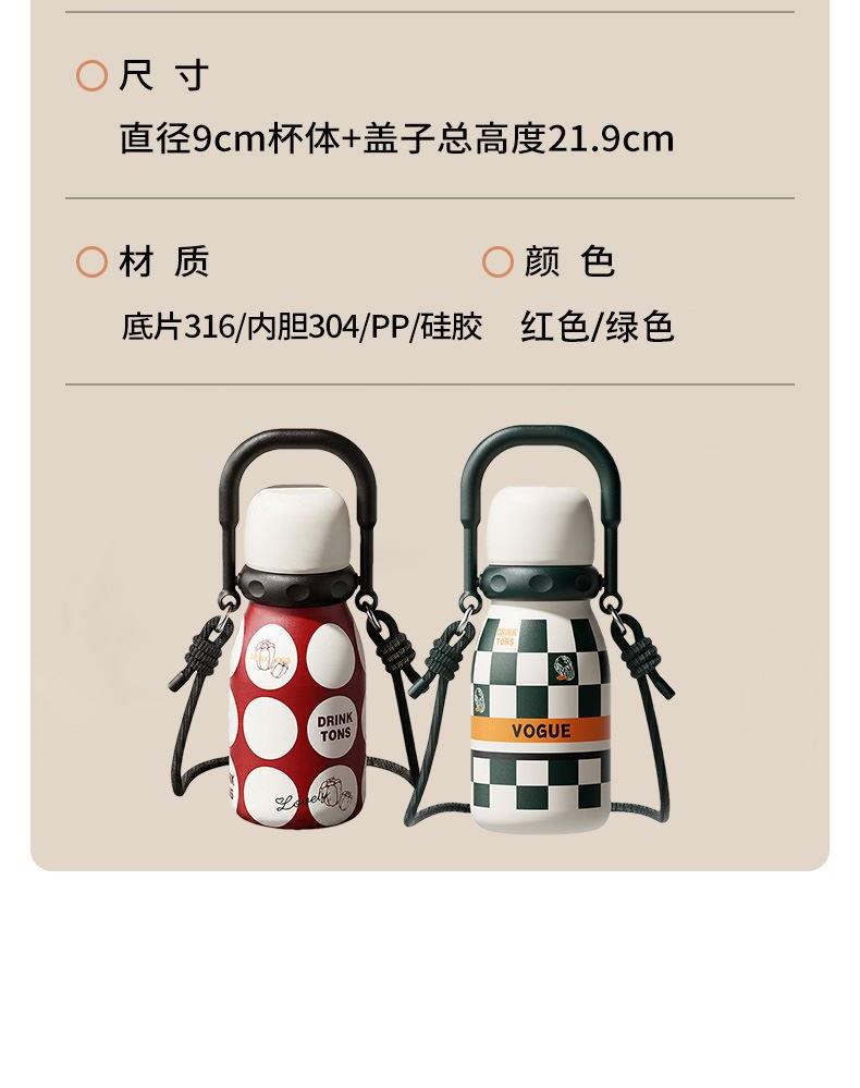容量:700ml 颜色:红色/绿色 底片材质:316不锈钢 内胆材质:304不锈钢 保温时间:6-12小时 产品尺寸:90*219mm 1、6层保温黑科技,轻松守护如初口感 2、升级大口径杯口,软硅胶吸管,可拆卸PP内塞,两用式杯盖 3、可拎可背,双重选择,随心而动,出行不受限