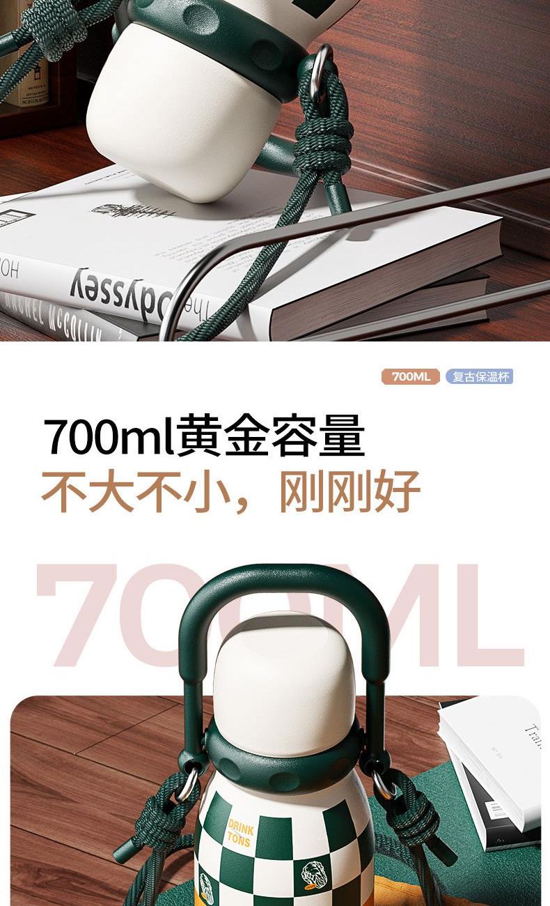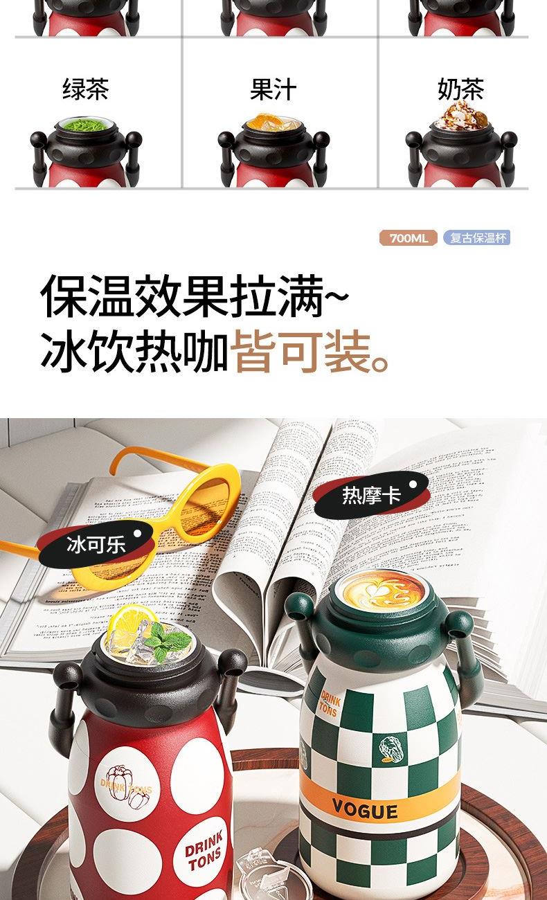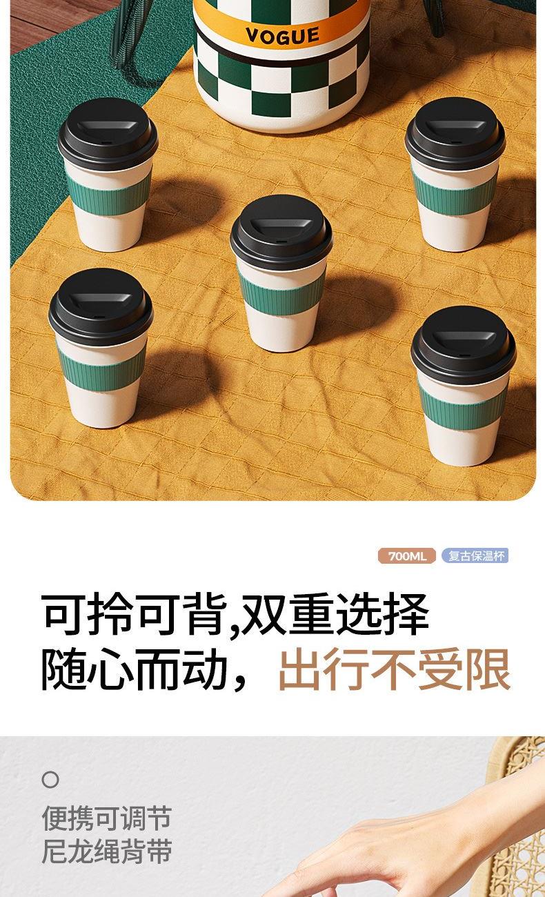 容量:700ml 颜色:红色/绿色 底片材质:316不锈钢 内胆材质:304不锈钢 保温时间:6-12小时 产品尺寸:90*219mm 1、6层保温黑科技,轻松守护如初口感 2、升级大口径杯口,软硅胶吸管,可拆卸PP内塞,两用式杯盖 3、可拎可背,双重选择,随心而动,出行不受限