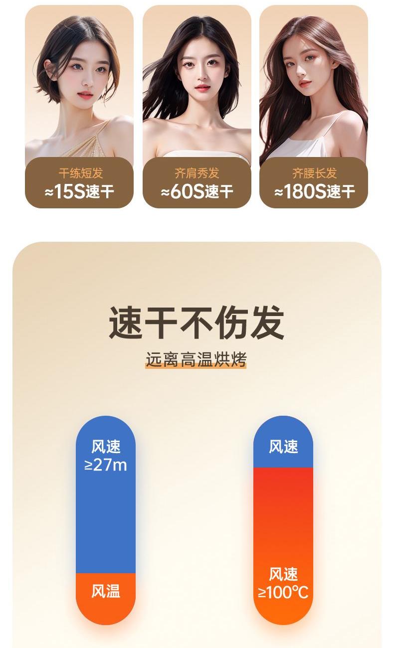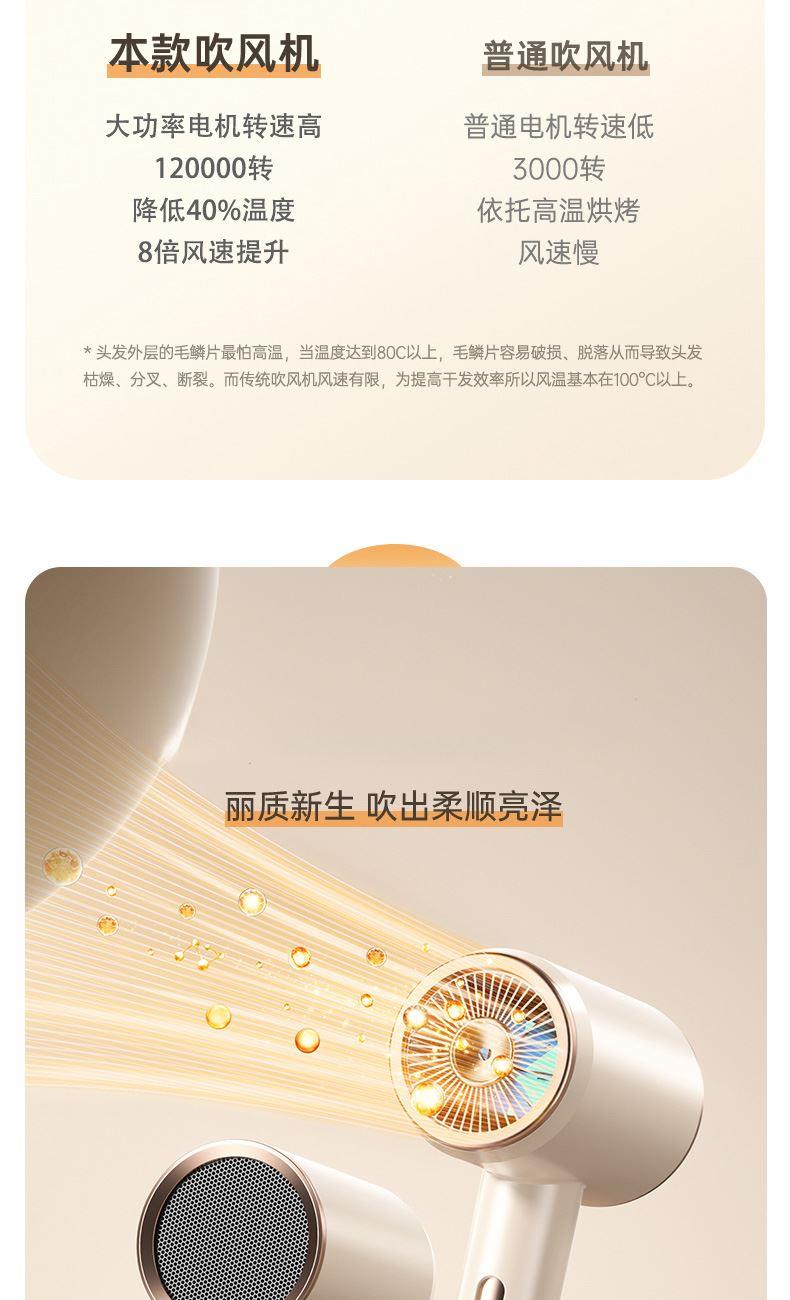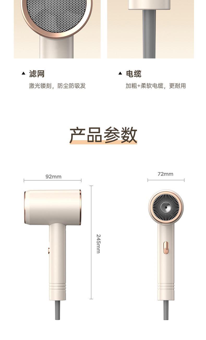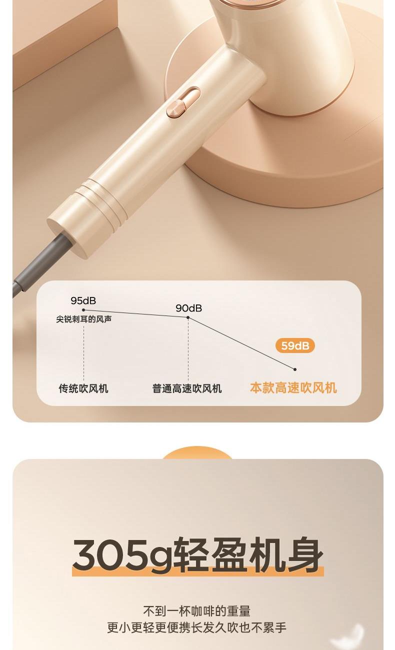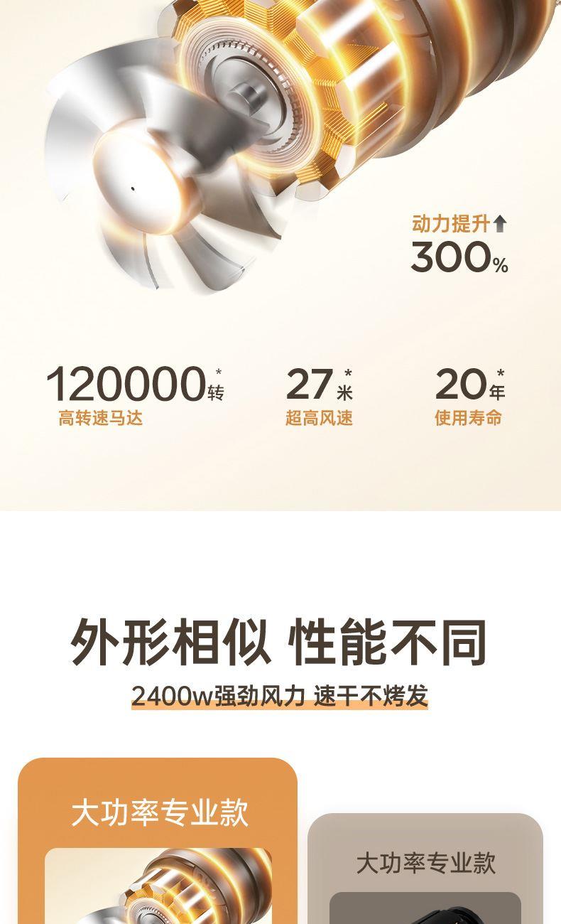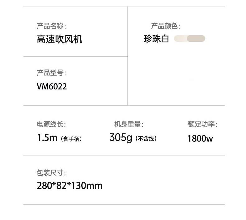 颜色:米白色 额定功率:1800W 档位:3档调节 机身克重:305g(不含线) 产品尺寸:245*72*92mm 1、大功率120000转,8倍风速提升 2、新一代V16电机,干发速度倍增 3、风力强劲,27米超高风速 4、智能温控检测NTC和微处理器MCU每秒50次实时监测调控风温,保护头皮和发丝。
