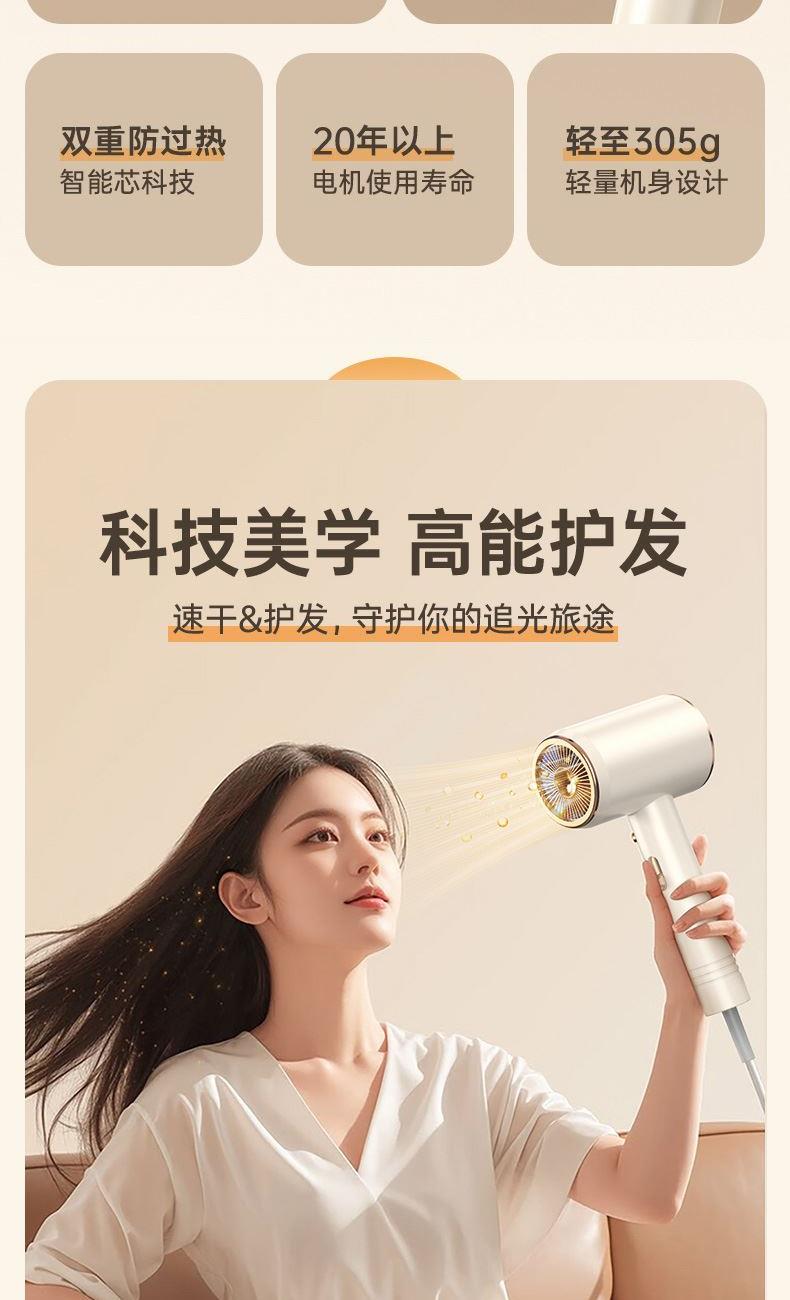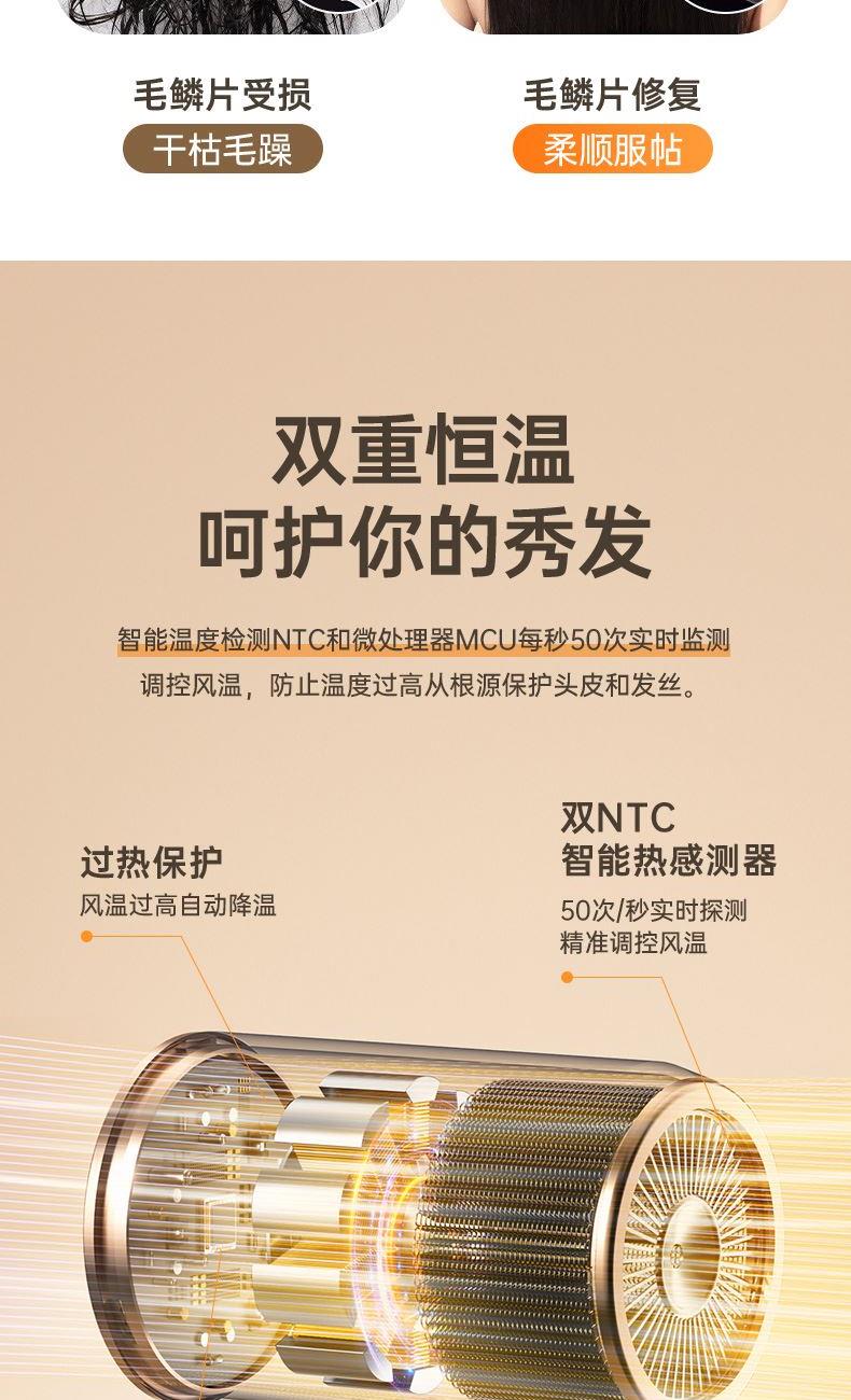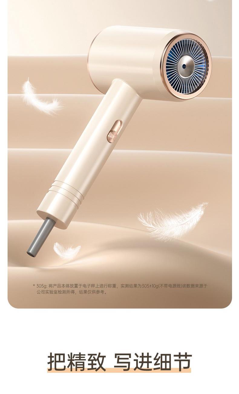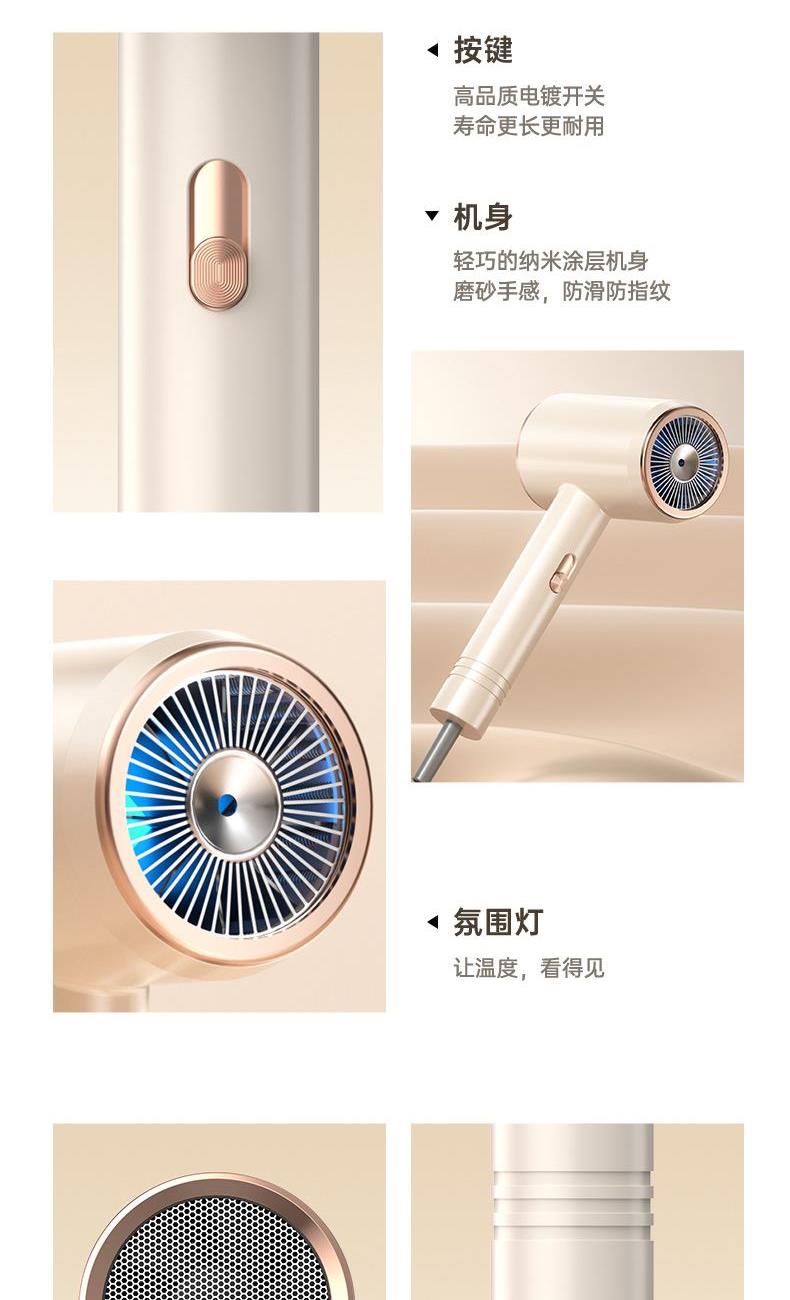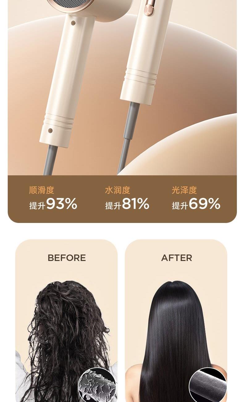 颜色:米白色 额定功率:1800W 档位:3档调节 机身克重:305g(不含线) 产品尺寸:245*72*92mm 1、大功率120000转,8倍风速提升 2、新一代V16电机,干发速度倍增 3、风力强劲,27米超高风速 4、智能温控检测NTC和微处理器MCU每秒50次实时监测调控风温,保护头皮和发丝。
