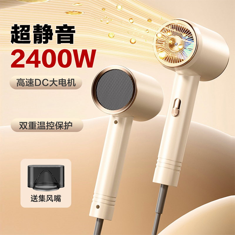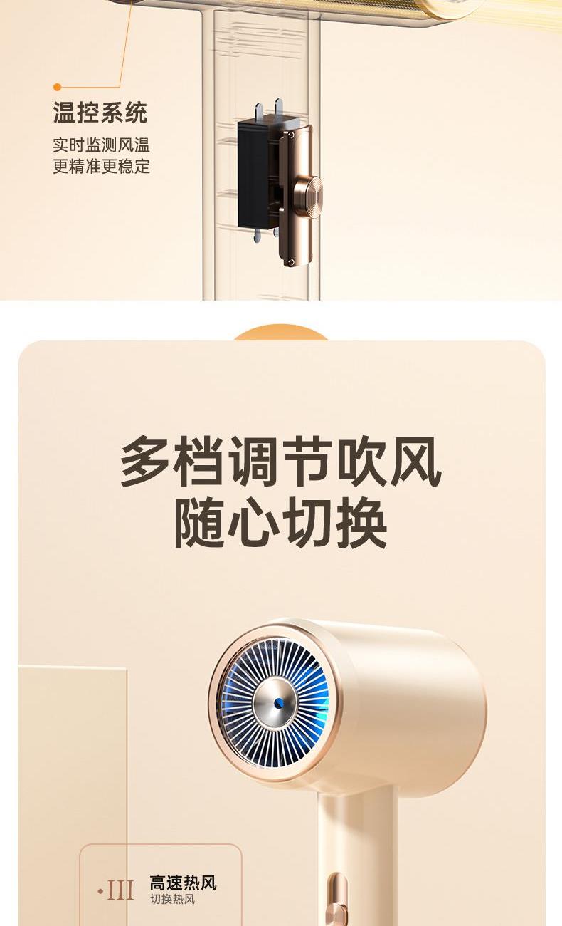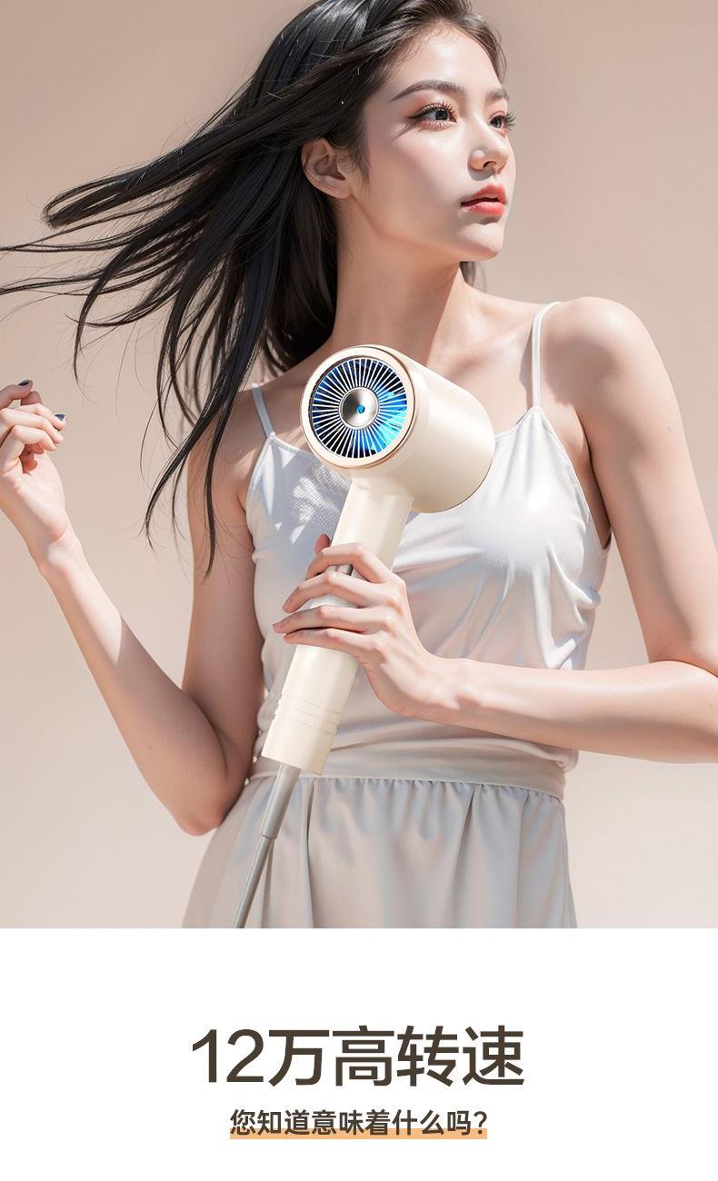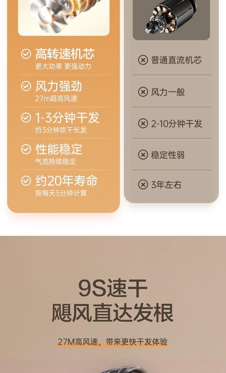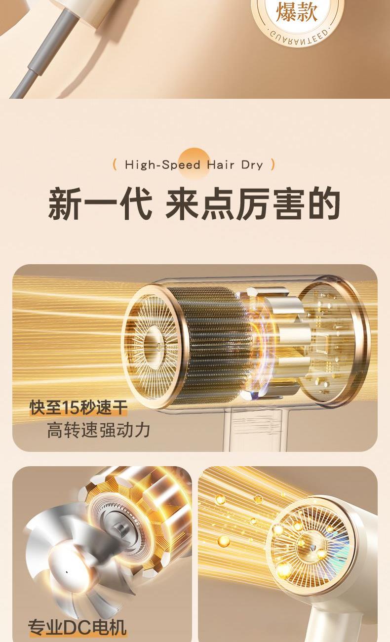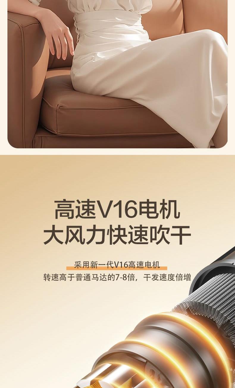 颜色:米白色 额定功率:1800W 档位:3档调节 机身克重:305g(不含线) 产品尺寸:245*72*92mm 1、大功率120000转,8倍风速提升 2、新一代V16电机,干发速度倍增 3、风力强劲,27米超高风速 4、智能温控检测NTC和微处理器MCU每秒50次实时监测调控风温,保护头皮和发丝。