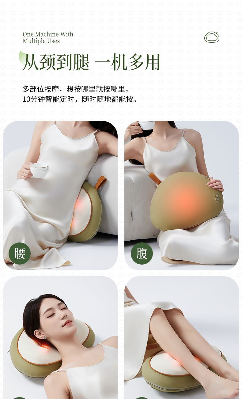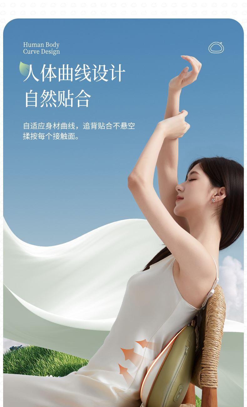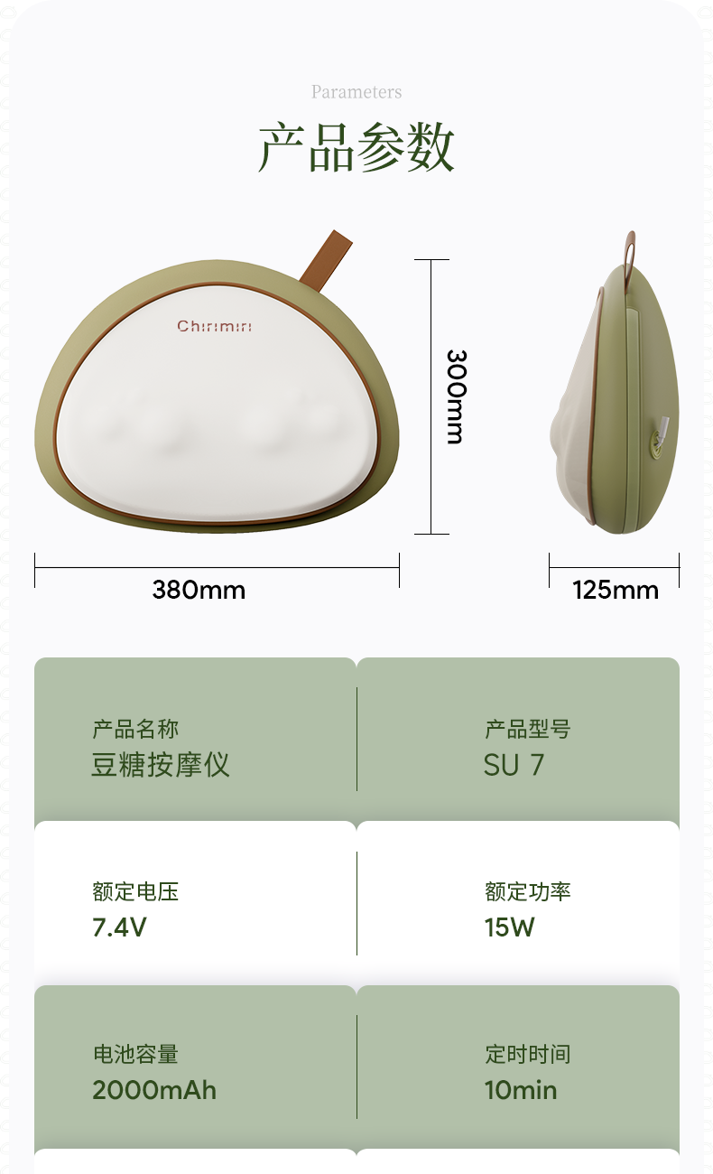 额定输入:DC 7.4V 额定功率:15W 电池容量:2000mAh 充电方式:Type-C 产品材质:猫爪 瑜伽布 产品颜色:抹茶绿 产品毛重:1.05kg 趣味颜值,集科技与美学,造就好体验 3D立体揉捏,轻享肩颈细致呵护 10分钟智能定时,浅歇一刻,能量回归 为你撑腰,仿生曲线设计,足够贴合 恒温热敷,深透舒缓,重现身体活力 不止腰背按摩,一机按遍全身