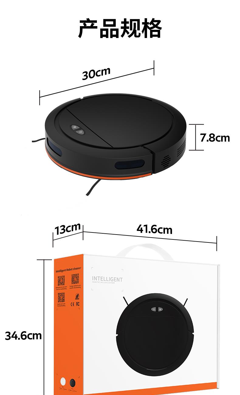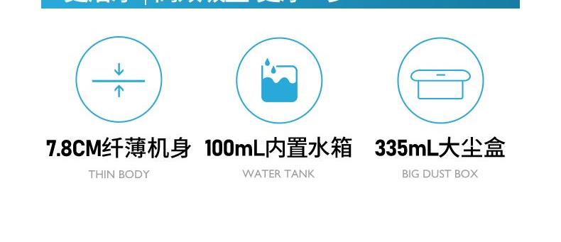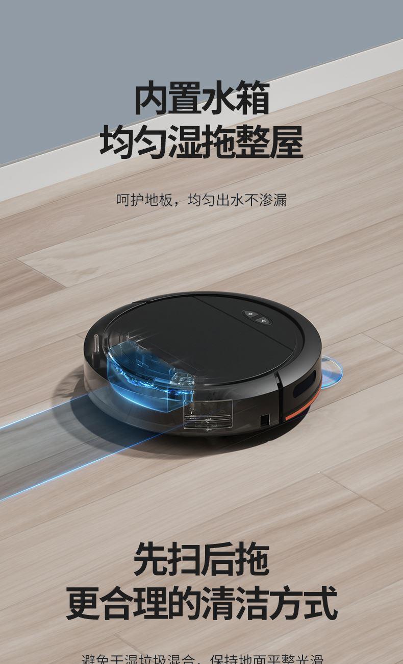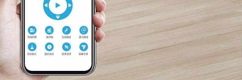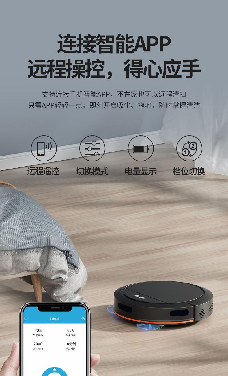 手机App功能:wifi远程控制、启动开关,定时预约,方向控制、强力清扫、定点清扫,返航回充,手机APP,定时功能,自动回充,带水箱拖地功能;