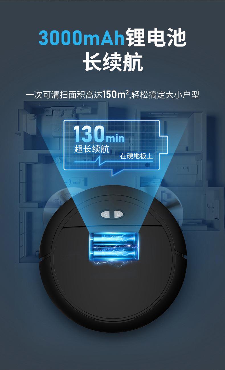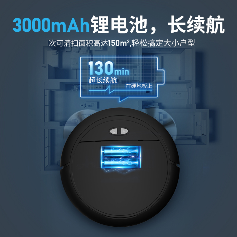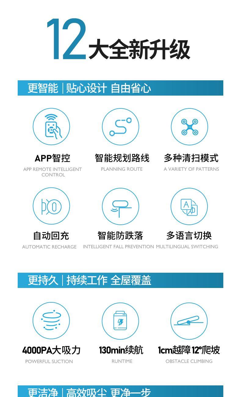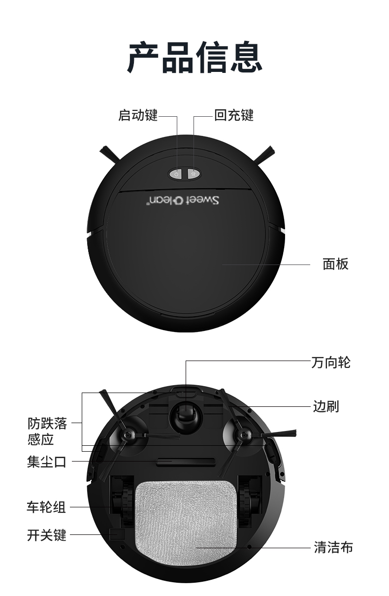 手机App功能:wifi远程控制、启动开关,定时预约,方向控制、强力清扫、定点清扫,返航回充,手机APP,定时功能,自动回充,带水箱拖地功能;
