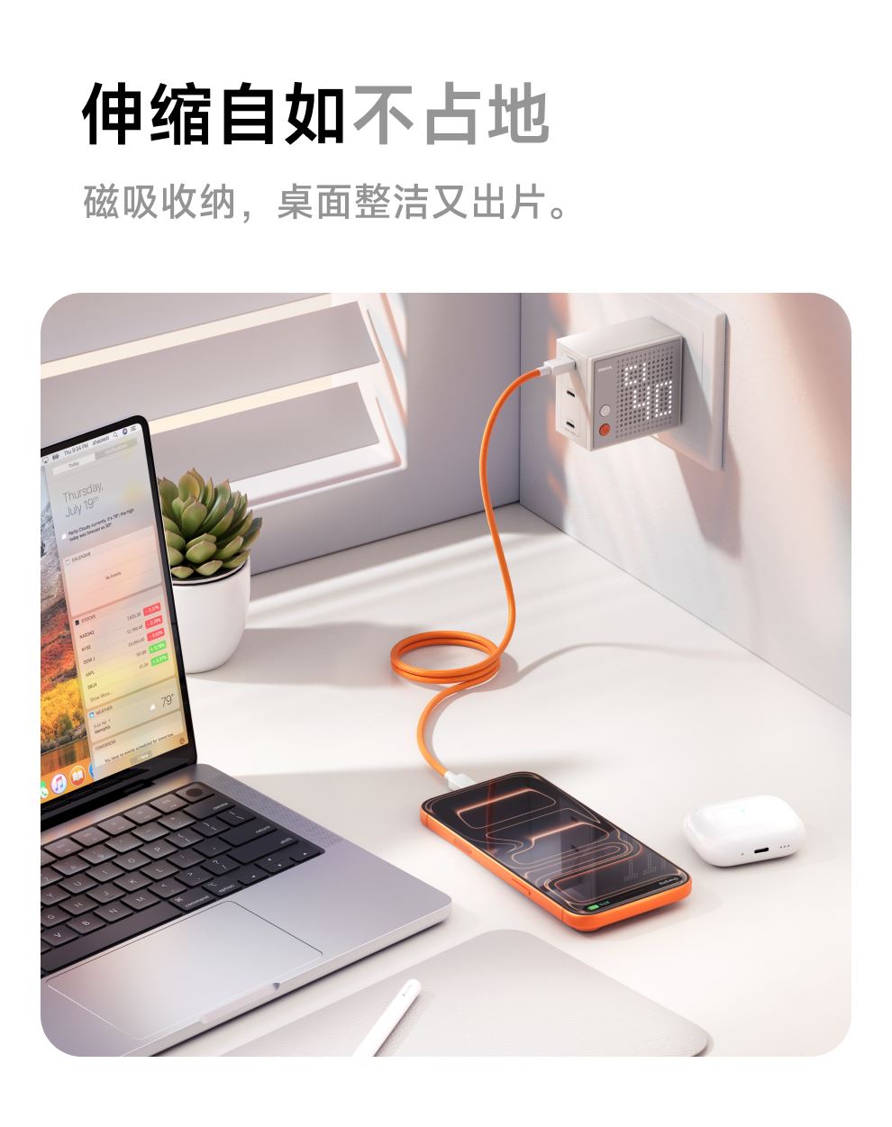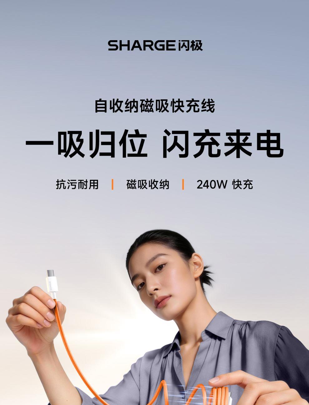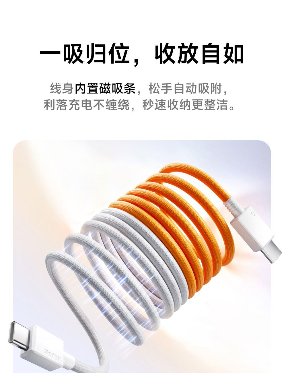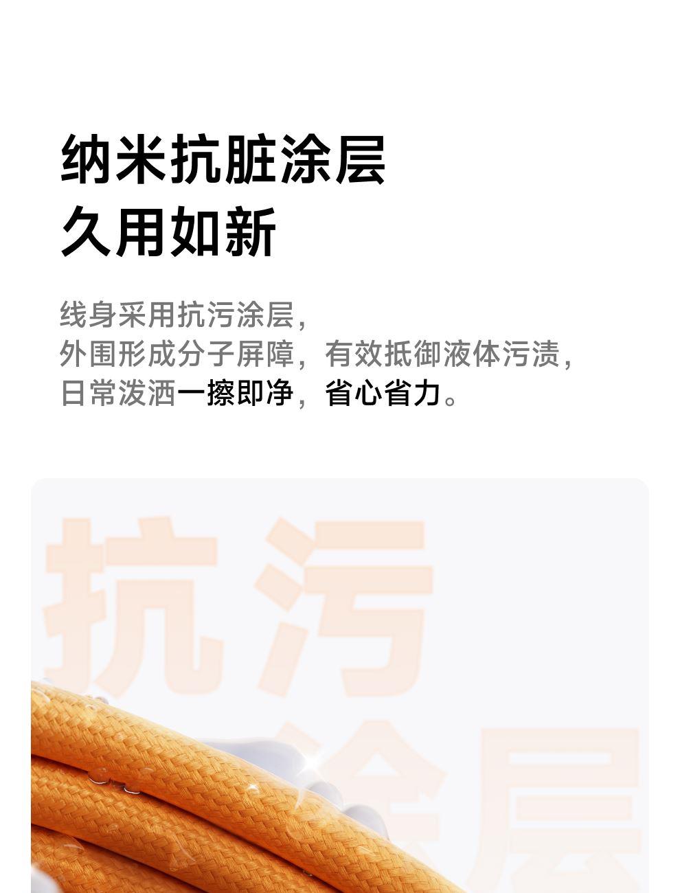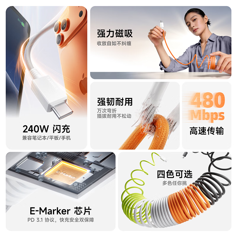 PD3.1协议,240W快充 纳米抗脏涂层编织线,坚韧耐用 E-Marker芯片,智控畅享安全快充 480Mbps传输数据,秒传不等待 手机、平板、笔记本,PD3.1安全快充不伤机 线身内置磁吸条,松手自动吸附收纳