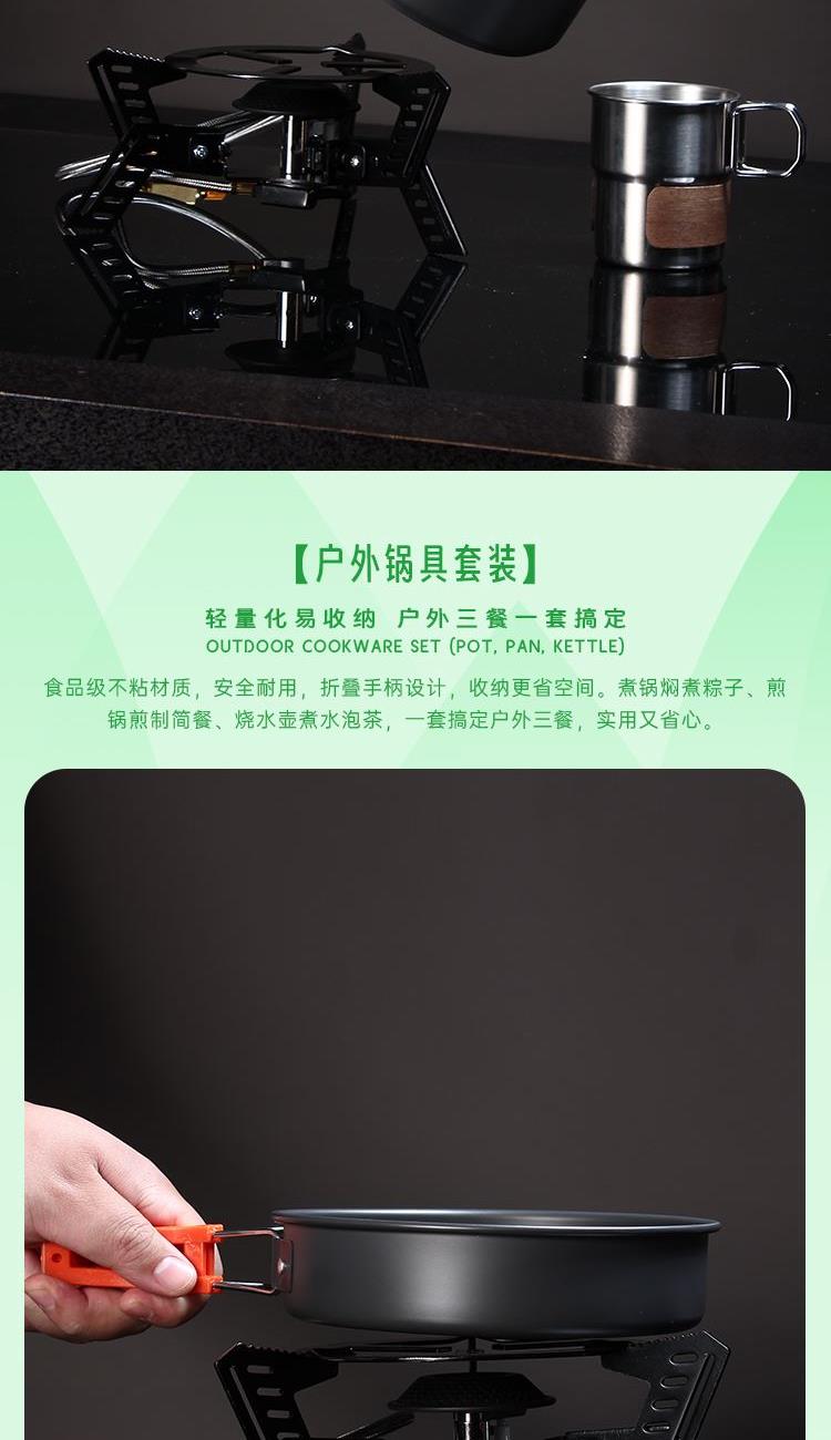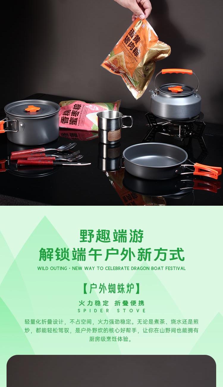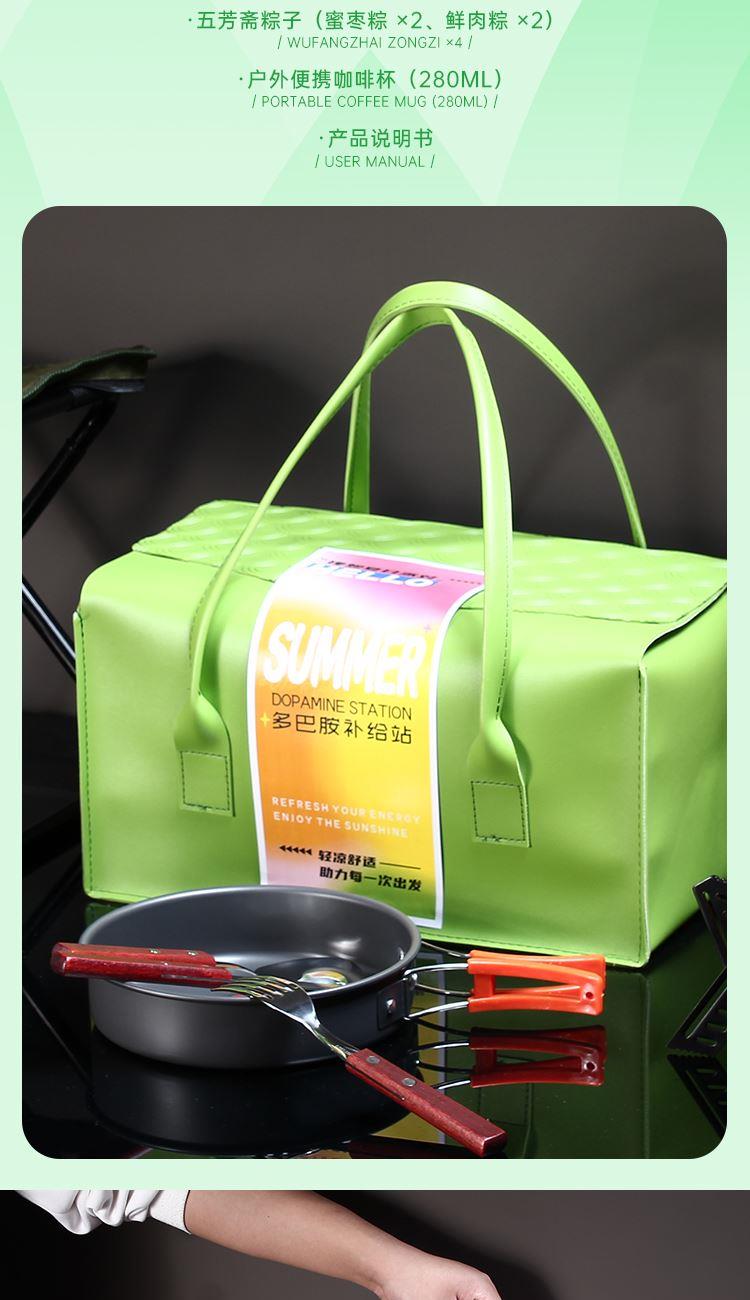配置 户外蜘蛛炉*1户外煮锅煎锅烧水壶*1套 户外折叠收纳凳*1 刀叉勺套装*1 五芳斋粽x4只(蜜枣粽*2-鲜肉粽*2) (备注:如需不需粽子可替换颈枕) 户外便携咖啡杯x1容量280ml 说明书*1 青草绿皮质手提包*1 材质 户外餐具:铝 1 蜘蛛炉:304钢 皮革 尺寸 手提包:340*200*165mm