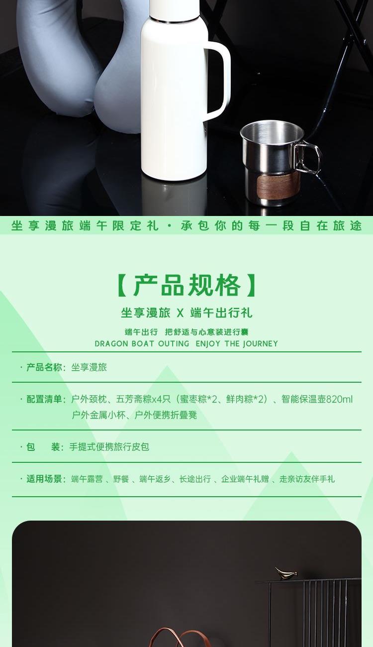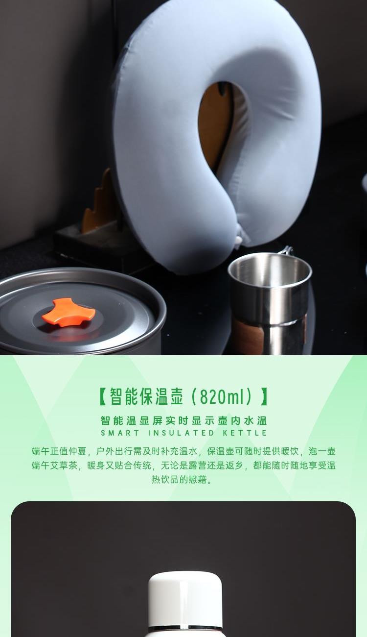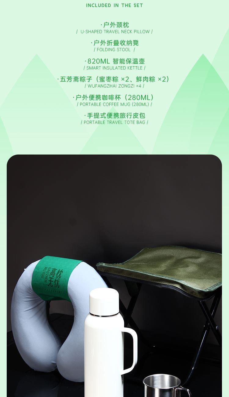 配置 手提式便携旅行皮包*1 户外颈枕*1五芳斋粽x4只(蜜枣粽*2-鲜肉粽*2) 智能保温壶*1 820ml 户外金属小杯*1 户外便携折叠凳*1 材质 水杯:316材质 皮革 定制工艺 激光 镭射 腰封印刷赠送场景:商务拜访 会议随手礼 企业形象推广礼
