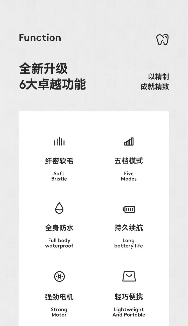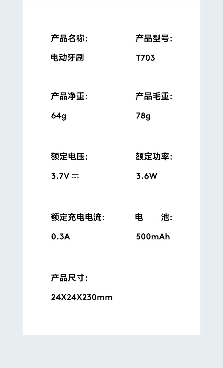 额定电压:3.7V~ 额定功率:3.6W 产品毛重:78g 额定容量:64g 额定充电电流:0.3A 电 池:500mAh 产品尺寸:24x24x230mm 1、纤密软毛; 2、五档模式; 3、全身防水; 4、持久续航; 5、强劲电机