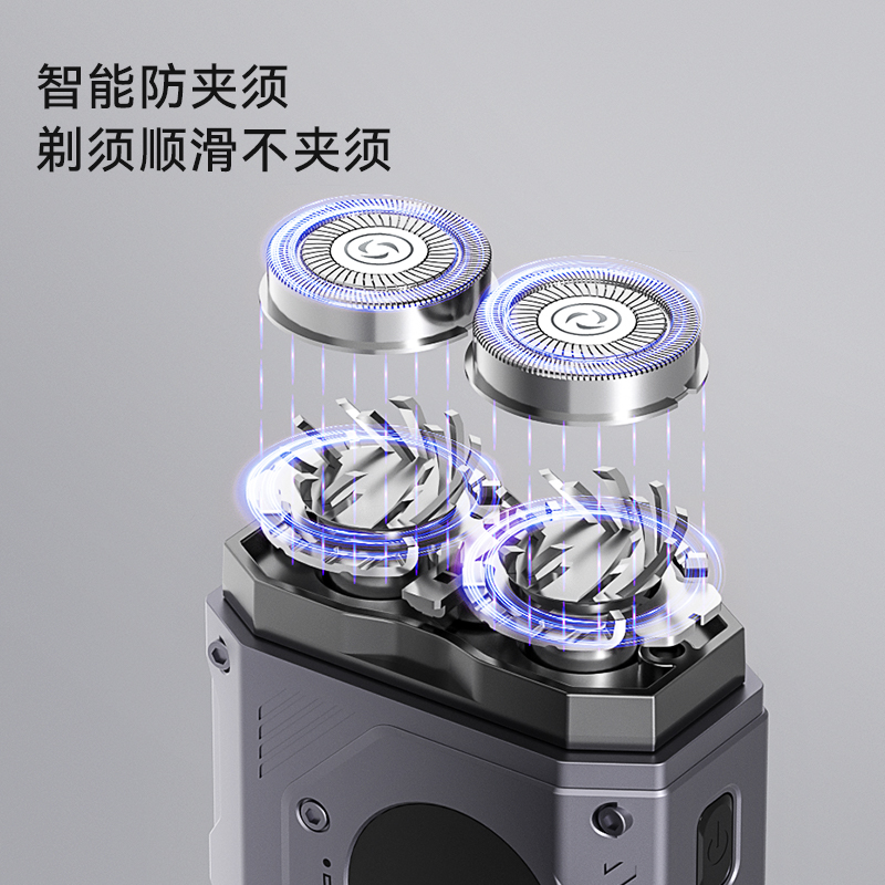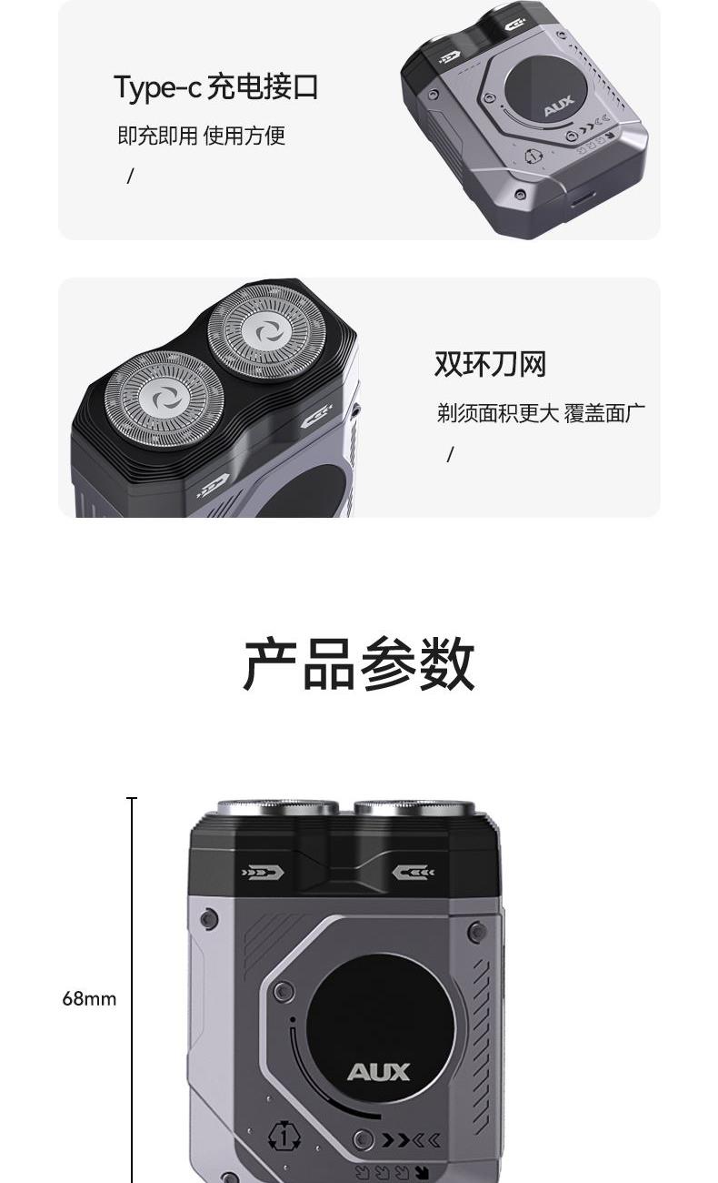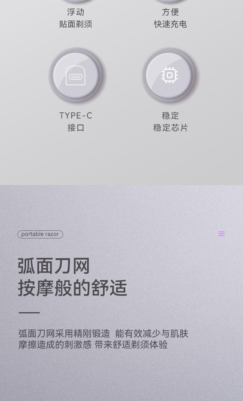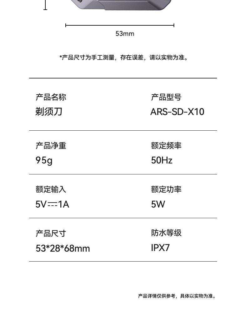 额定电压:3.7V⎓ 额定功率:5W 额定输入:5V~1A 电池容量:400mAh 防水等级:IPX7 包装清单:剃须刀,说明书,Type-C充电线,清洁刷 迷你便携,单手可握 双环浮动刀网,双倍提升进须量 TYPE-C快充,60天长效续航 IPX7级防水,机身随心洗 刀头磁吸设计,灵活好拆洗